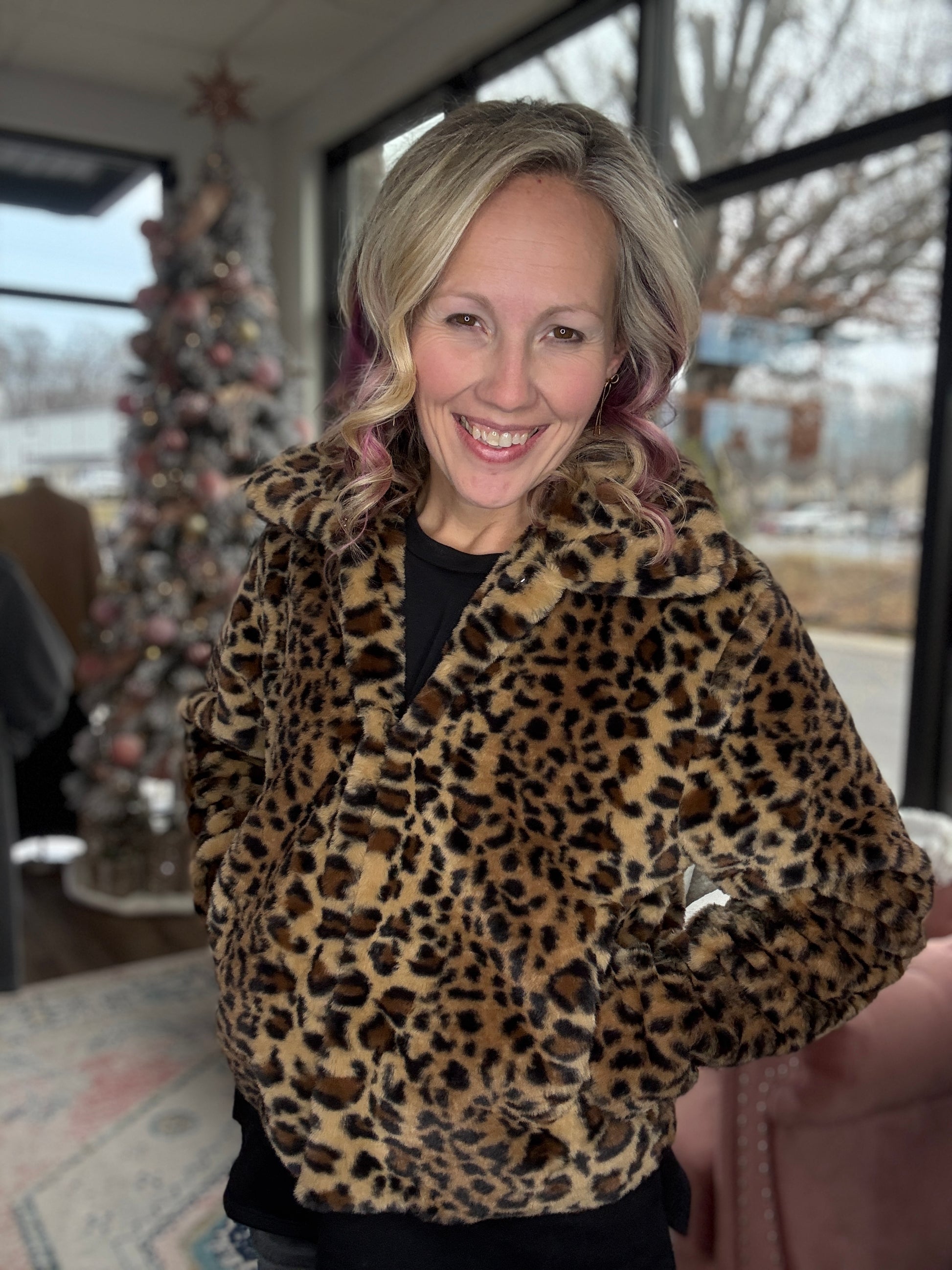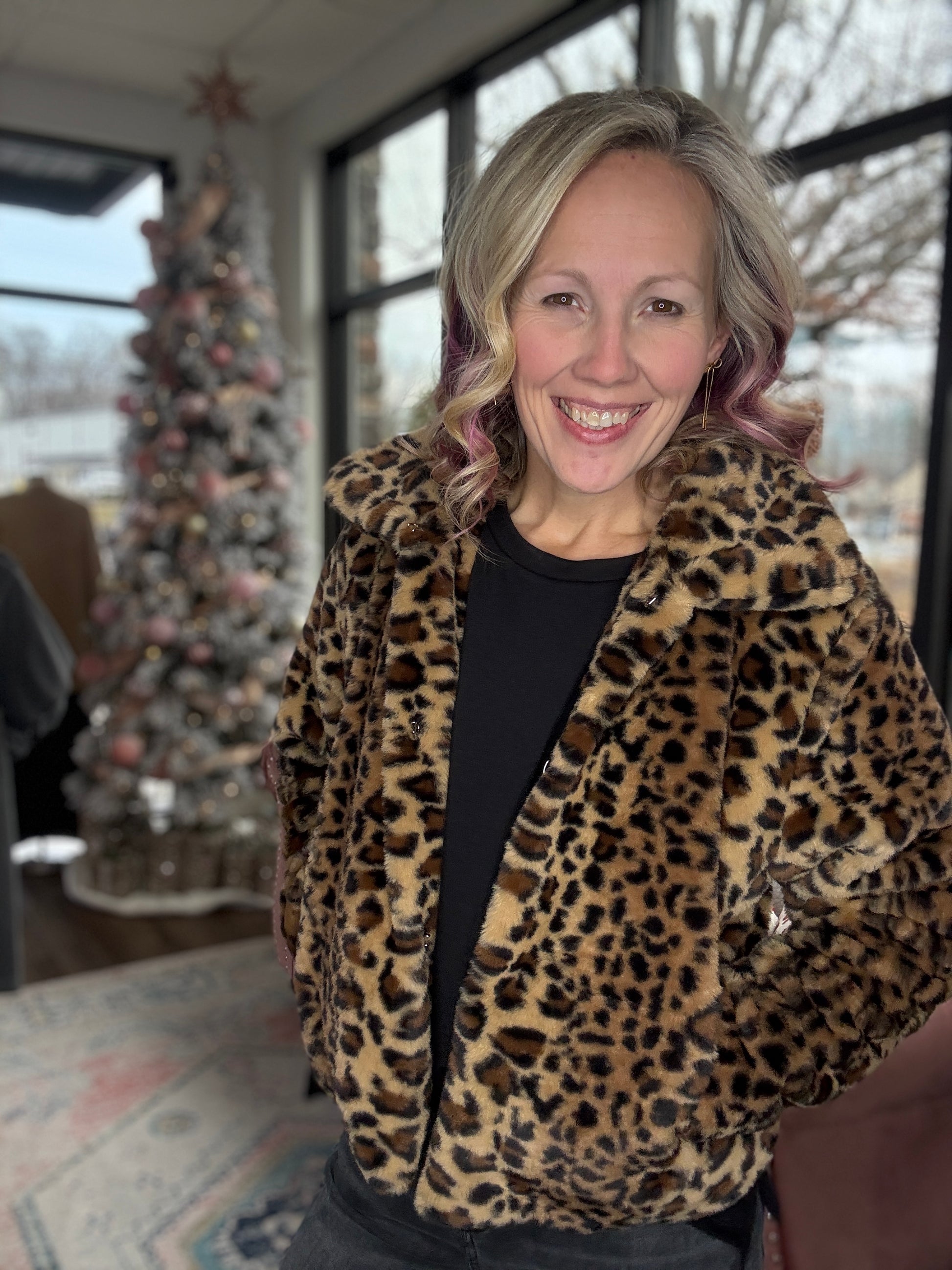 The After Midnight Faux Fur Leopard Jacket is your new go-to for a night out—chic, stylish, and perfect for staying warm in the colder months. Made to steal the spotlight, its soft plush texture, sharp collar, and sleek waist-skimming fit bring chic style to any look. And yes... pockets!