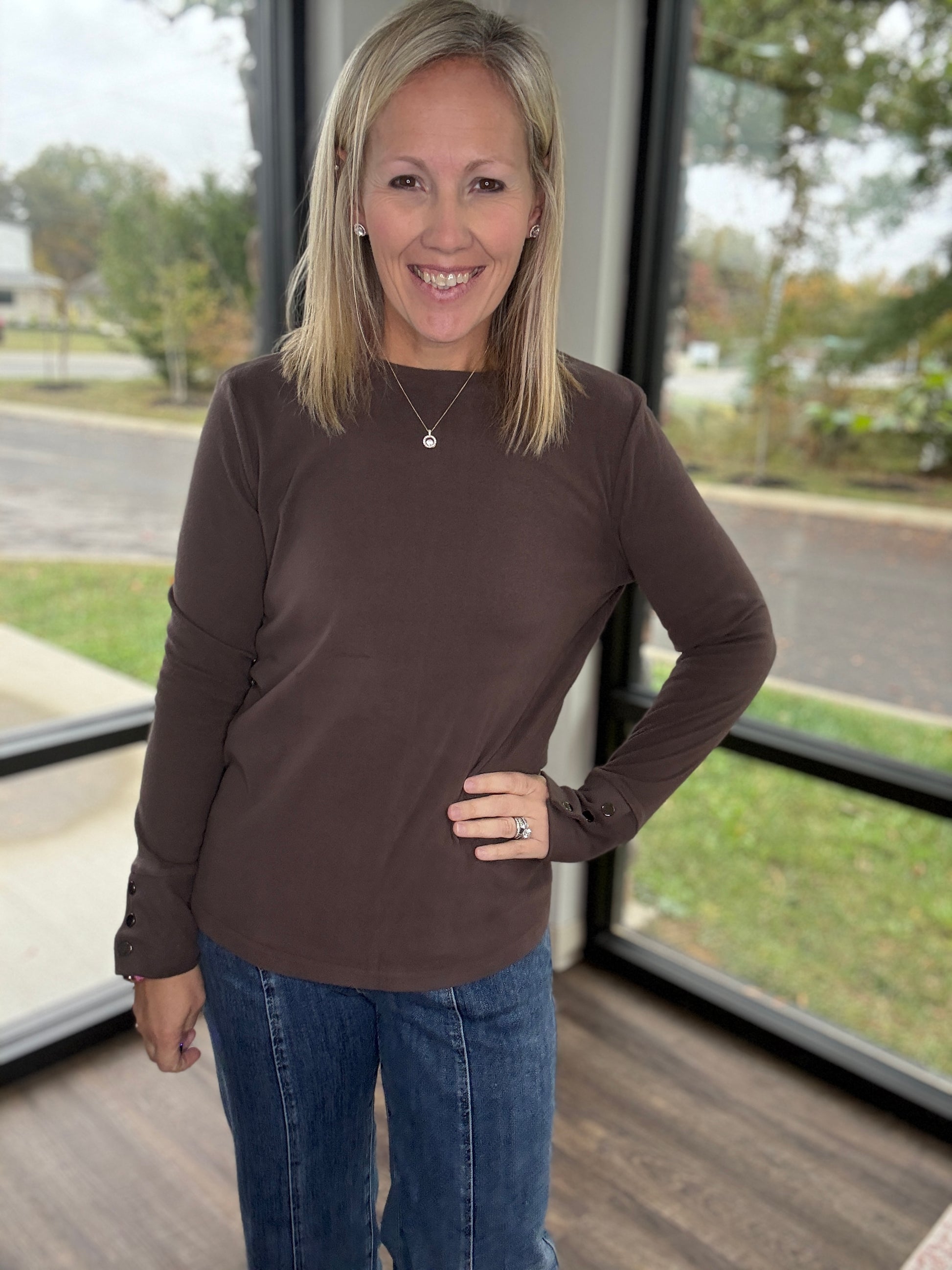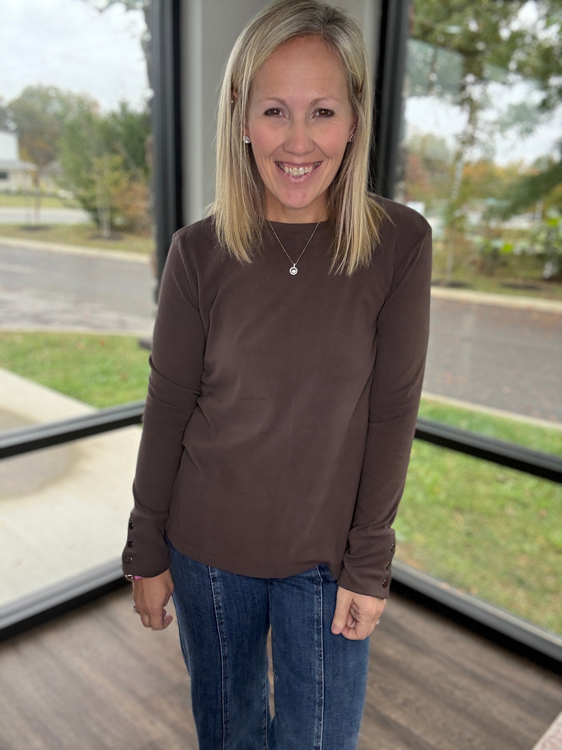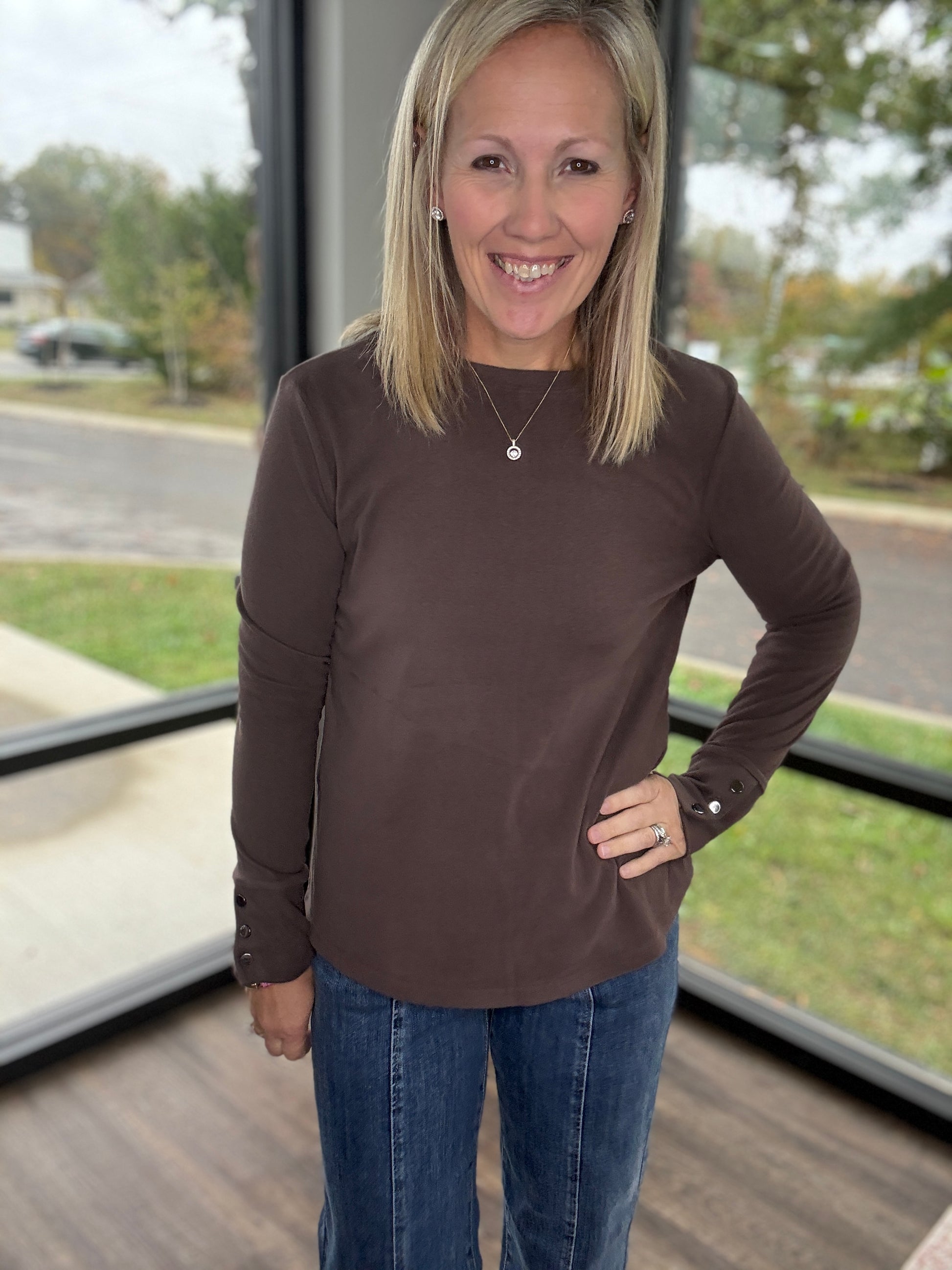 Stay effortlessly chic in the Alexis Top — the perfect blend of comfort and style. Made from a super soft knit, this long sleeve top features snap cuff detailing for a polished, elevated touch. Its relaxed-yet-flattering fit makes it an easy go-to for layering, dressing up, or keeping it simple and cozy.