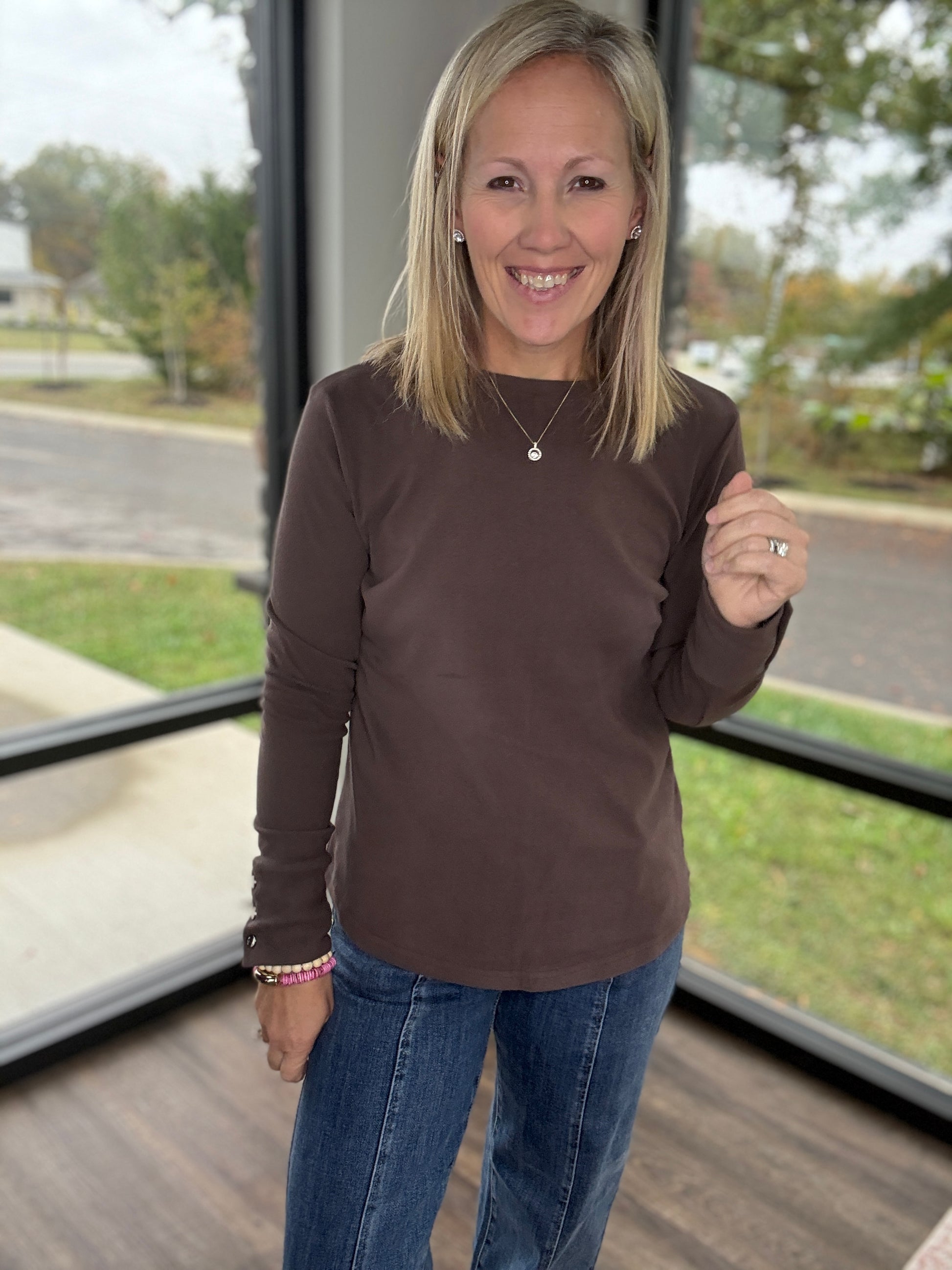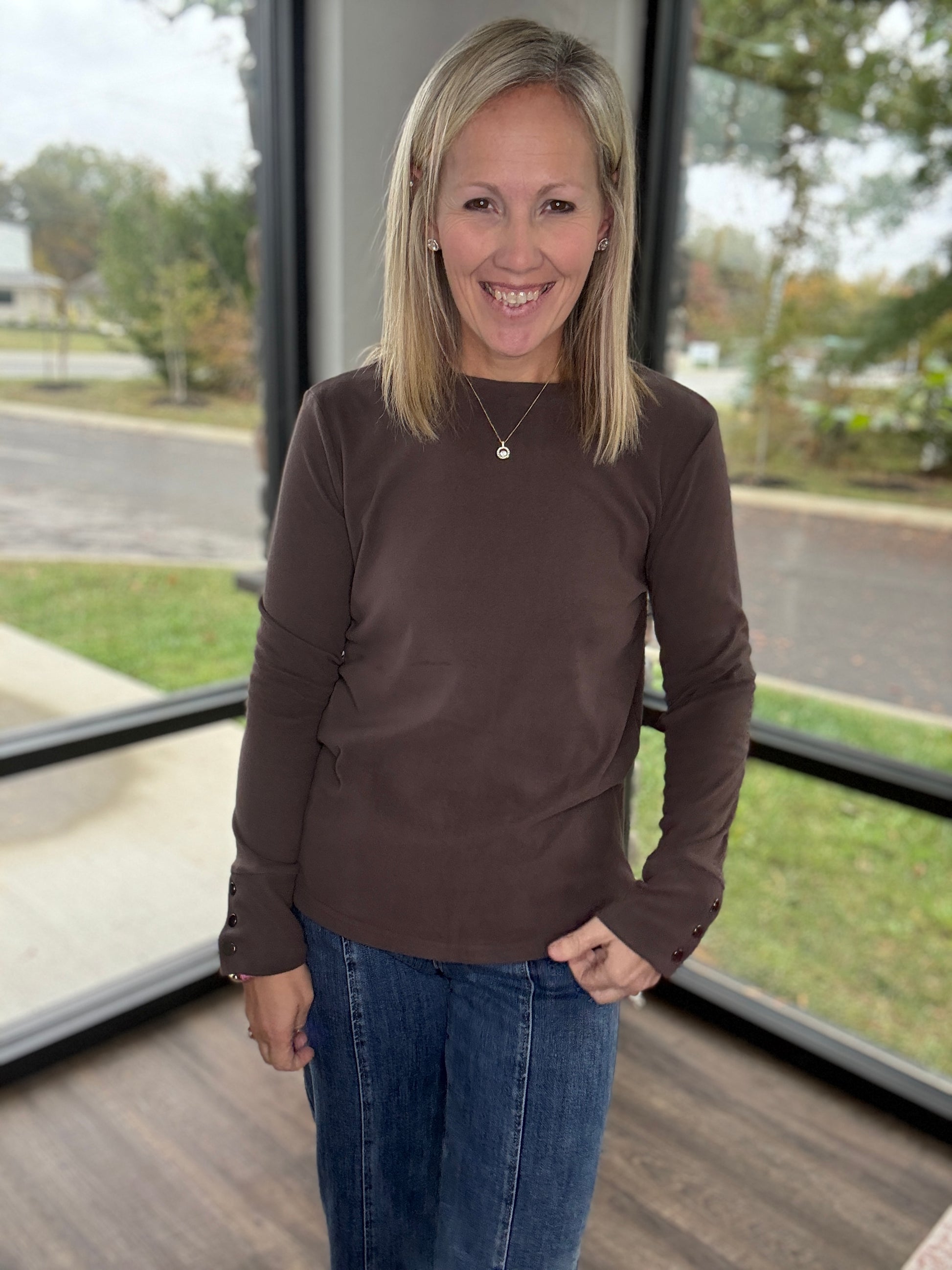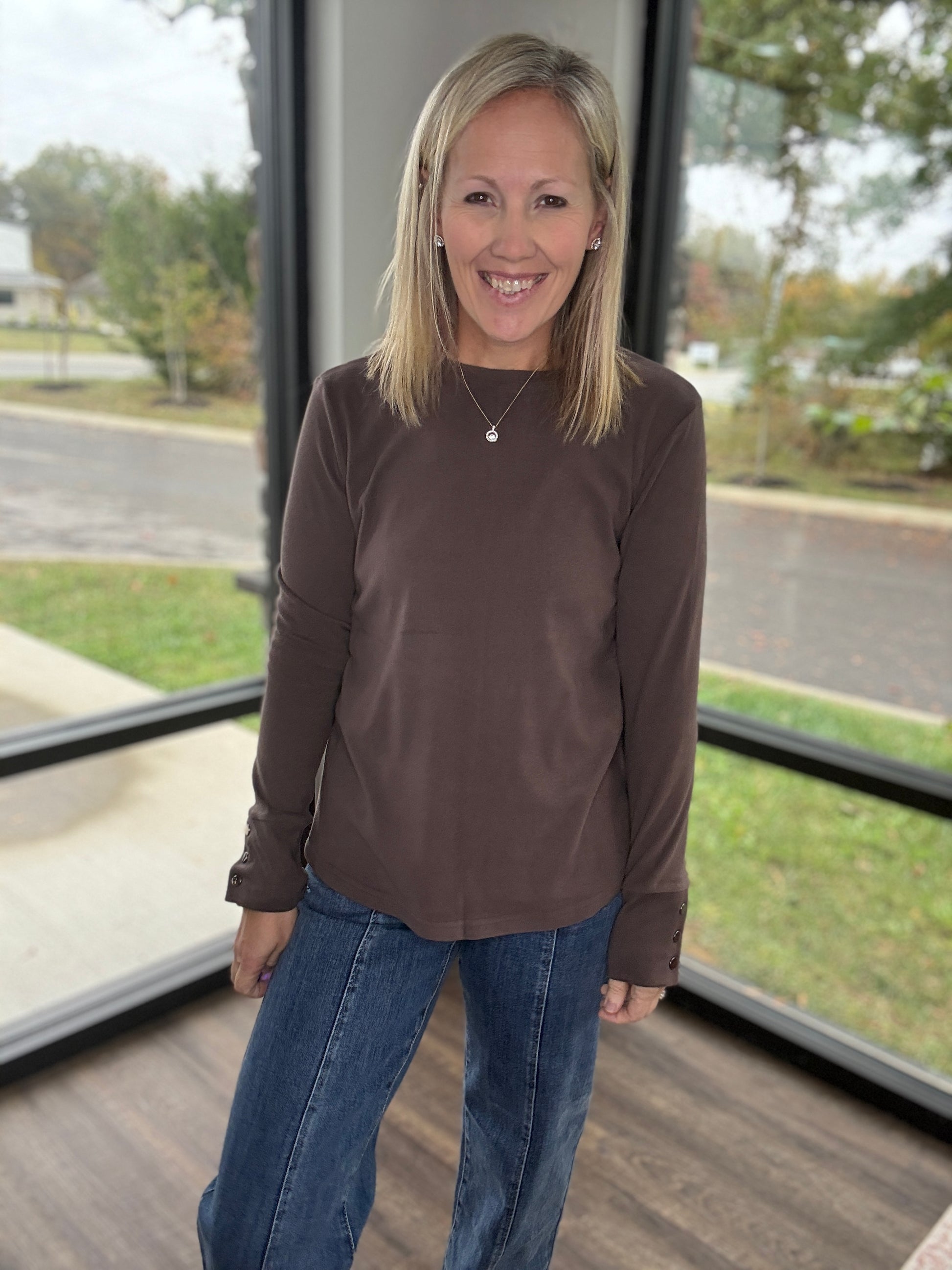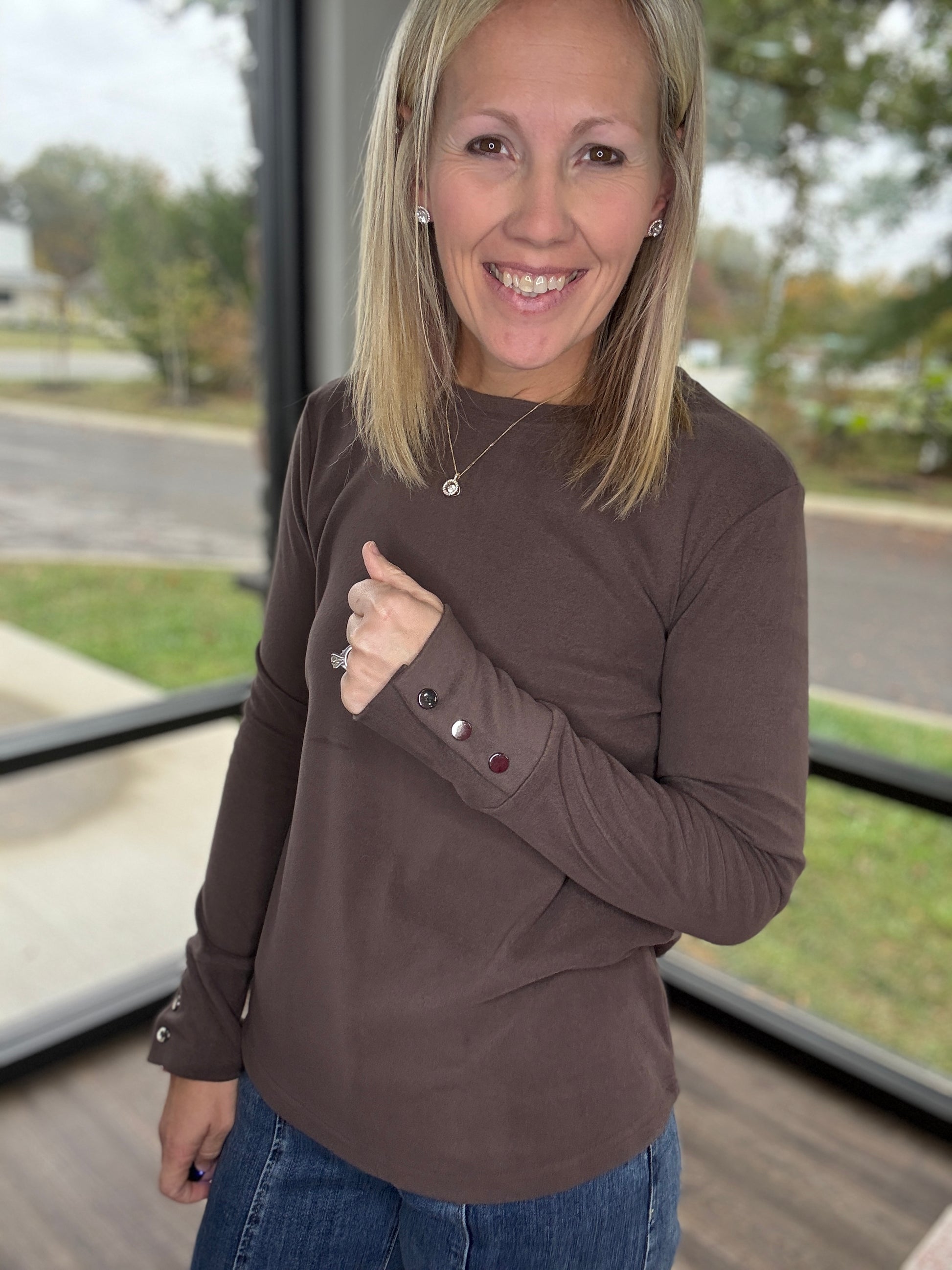 Stay effortlessly chic in the Alexis Top — the perfect blend of comfort and style. Made from a super soft knit, this long sleeve top features snap cuff detailing for a polished, elevated touch. Its relaxed-yet-flattering fit makes it an easy go-to for layering, dressing up, or keeping it simple and cozy.