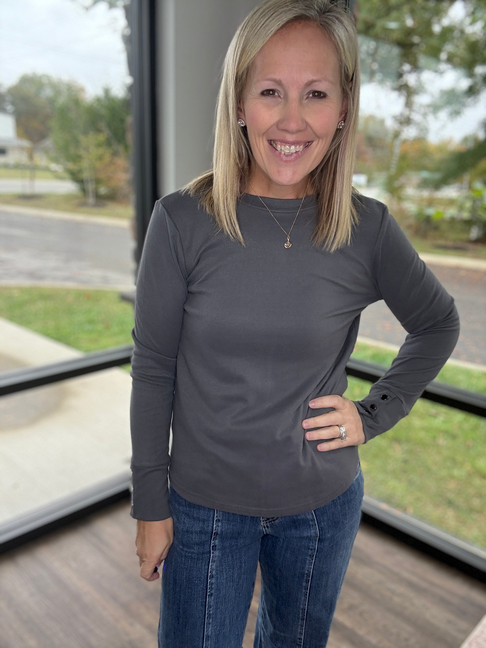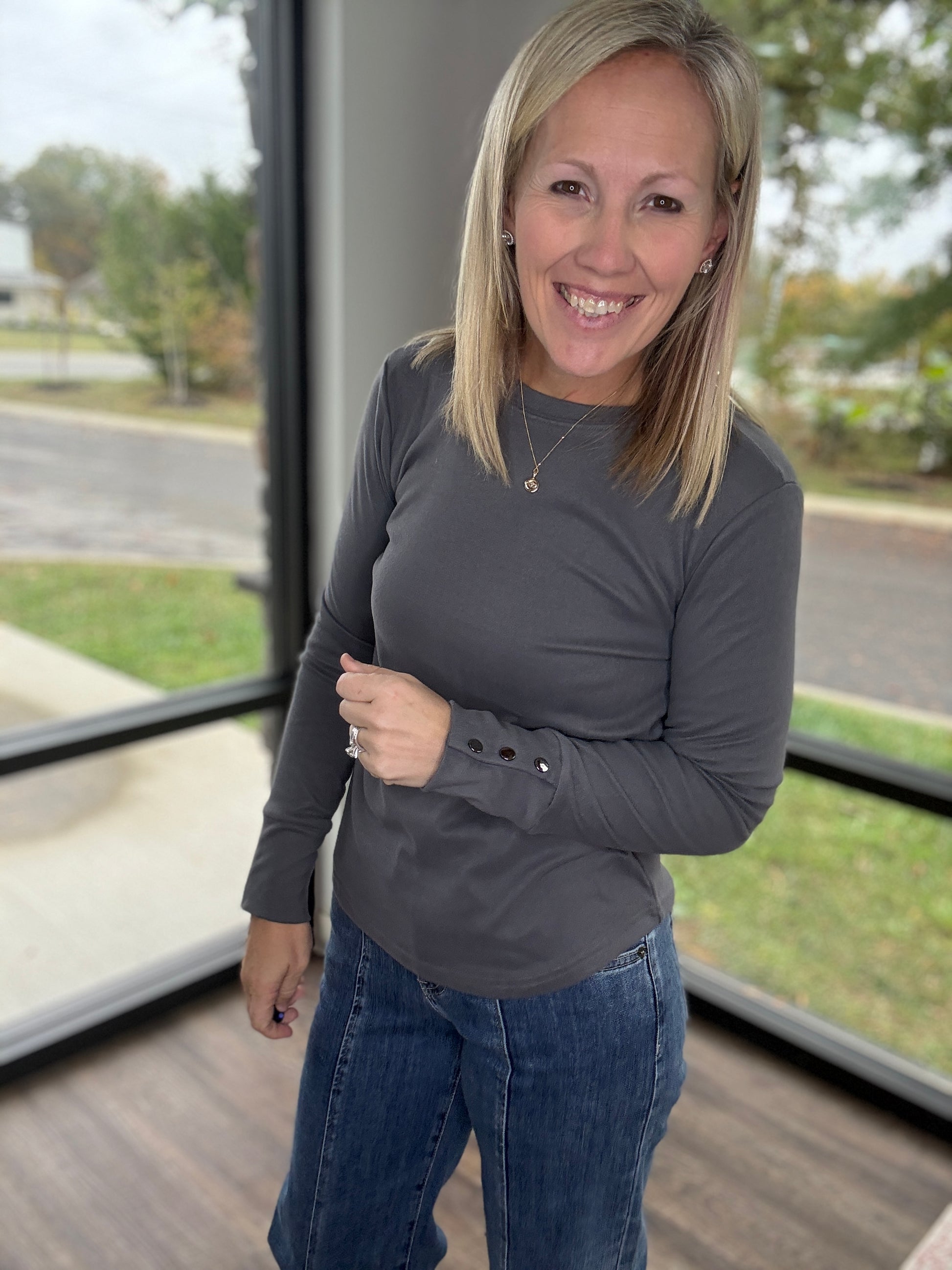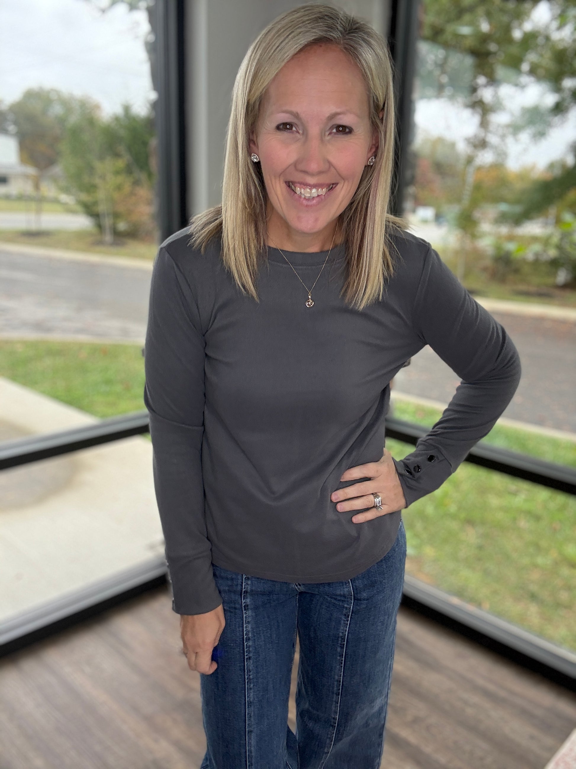 Stay effortlessly chic in the Alexis Top — the perfect blend of comfort and style. Made from a super soft knit, this long sleeve top features snap cuff detailing for a polished, elevated touch. Its relaxed-yet-flattering fit makes it an easy go-to for layering, dressing up, or keeping it simple and cozy.