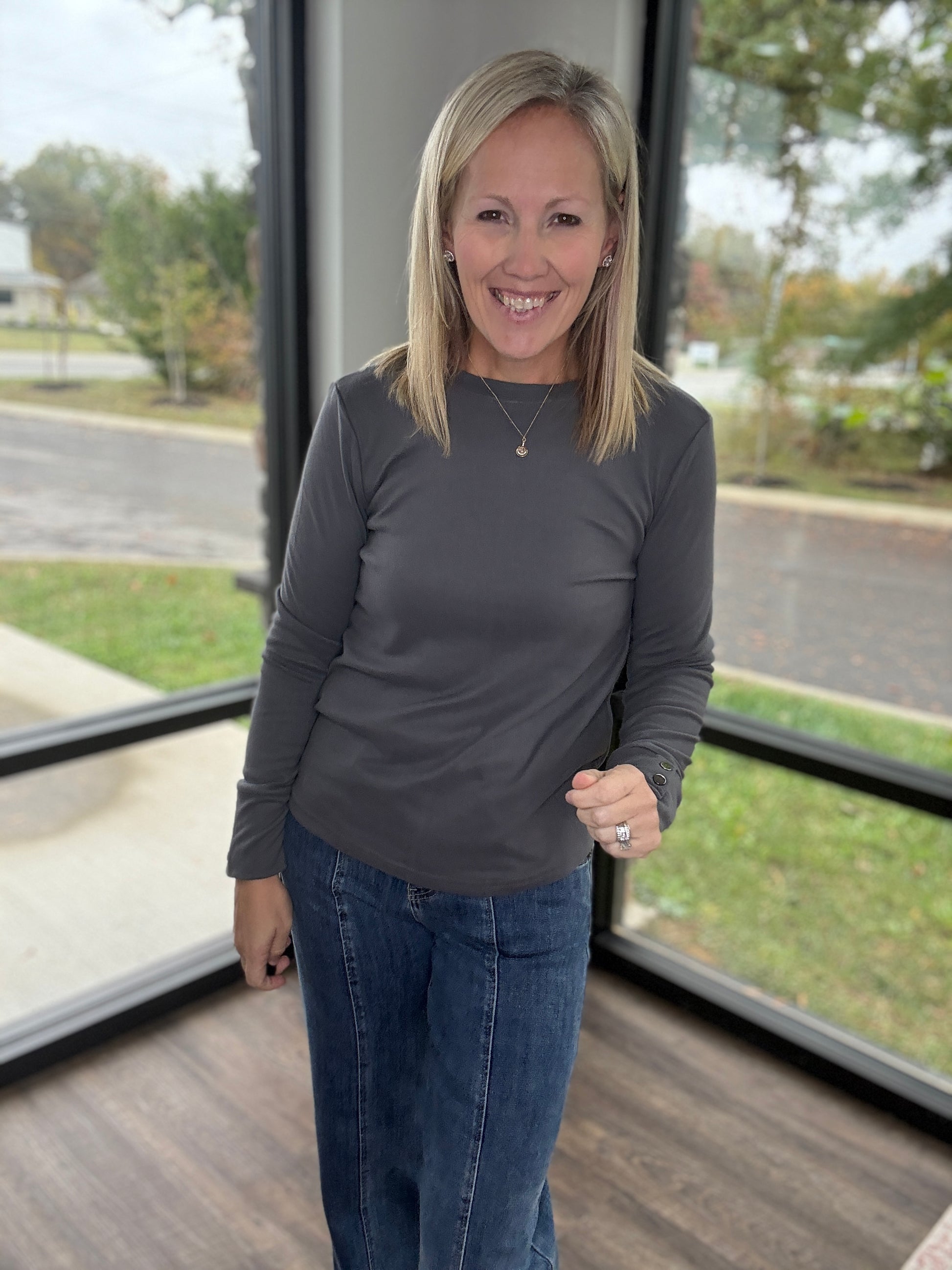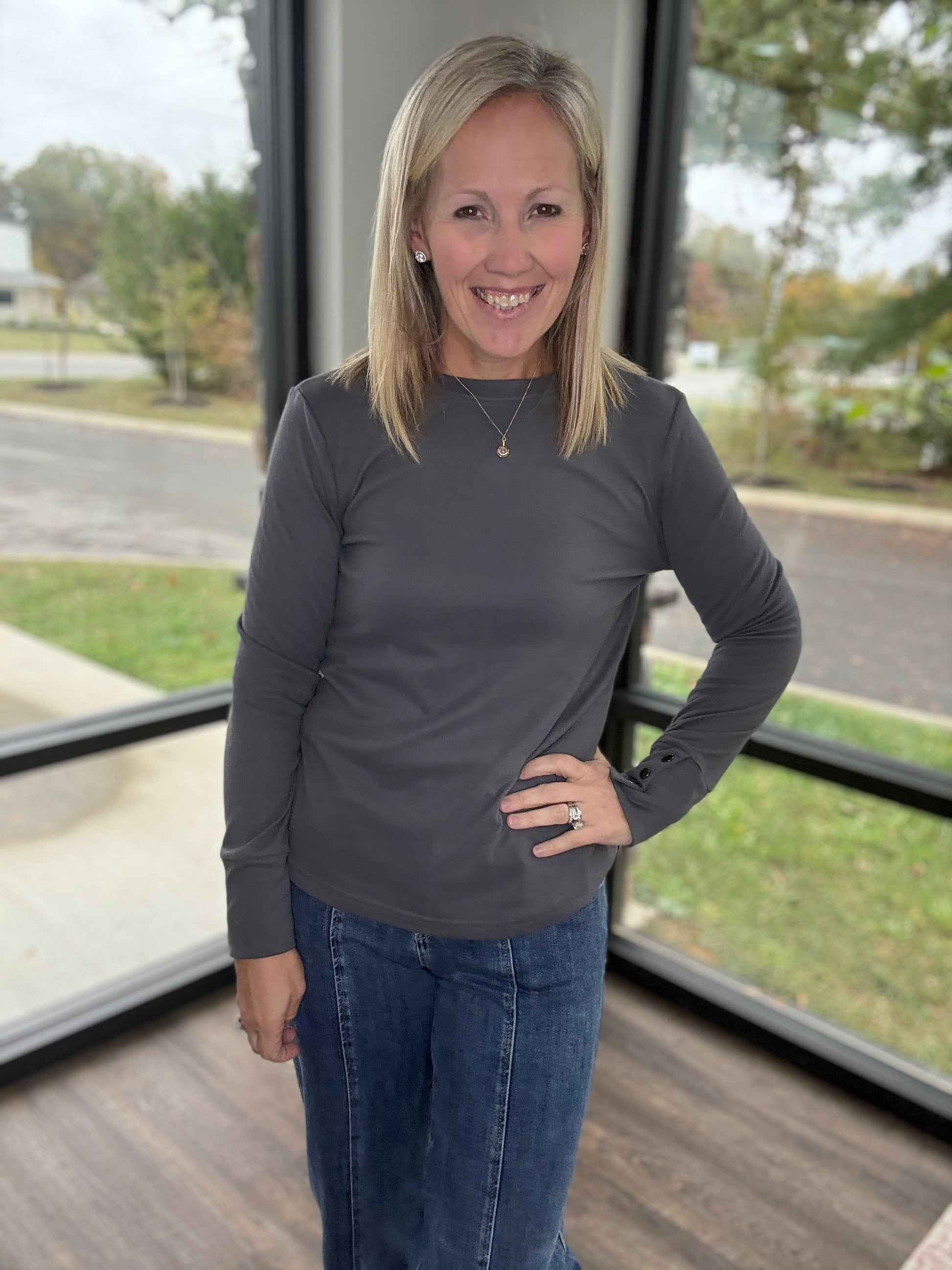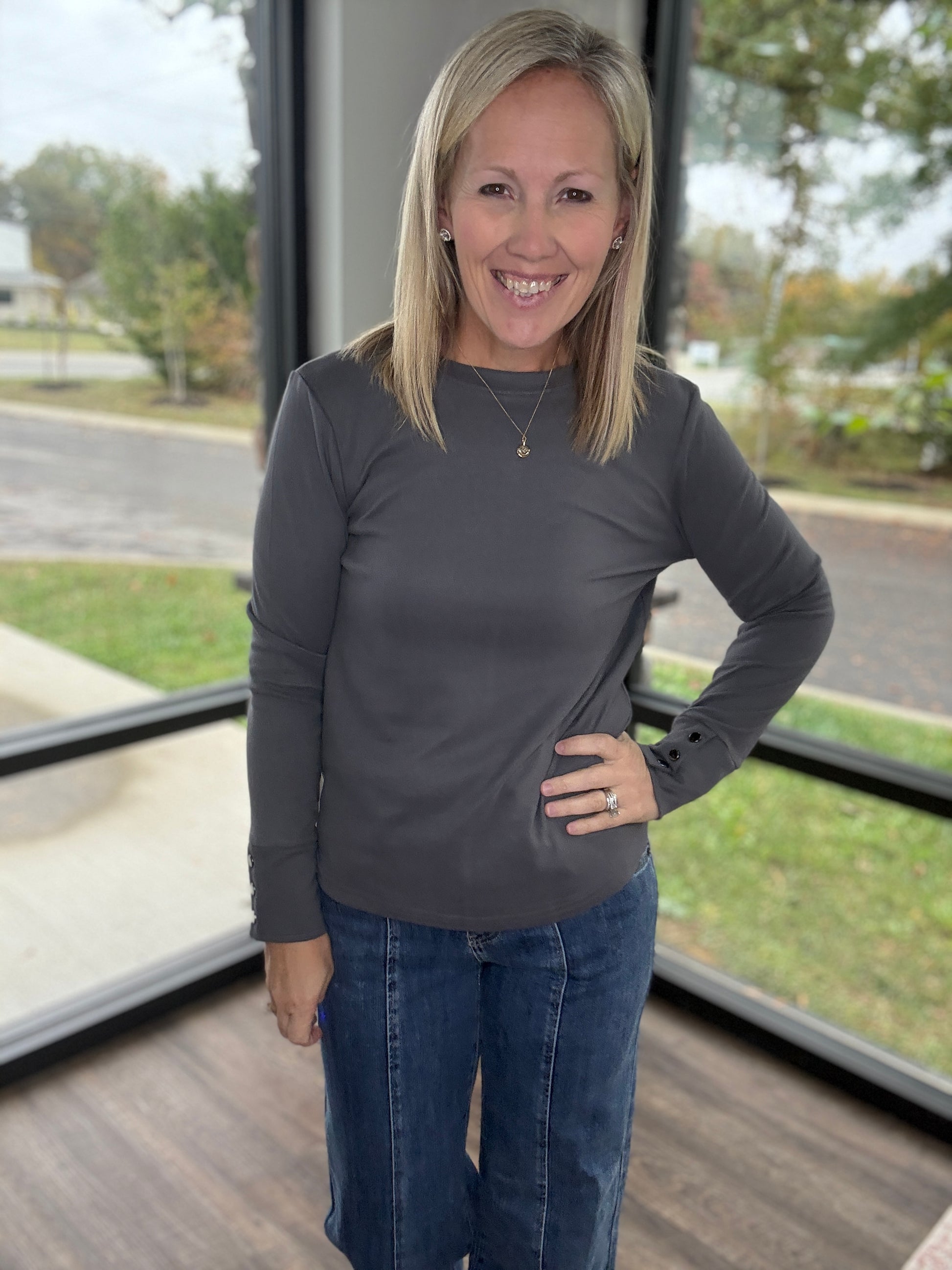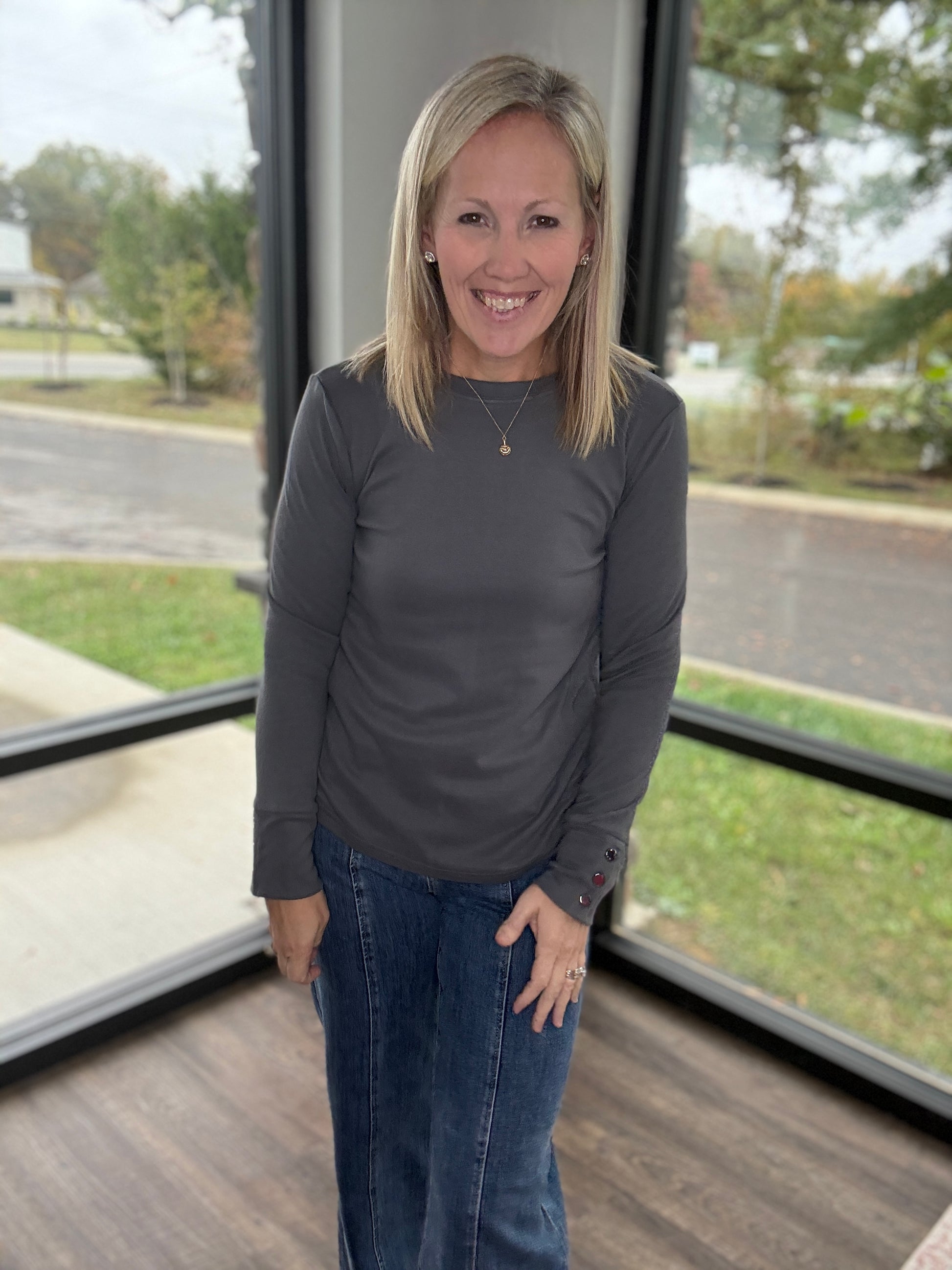 Stay effortlessly chic in the Alexis Top — the perfect blend of comfort and style. Made from a super soft knit, this long sleeve top features snap cuff detailing for a polished, elevated touch. Its relaxed-yet-flattering fit makes it an easy go-to for layering, dressing up, or keeping it simple and cozy.