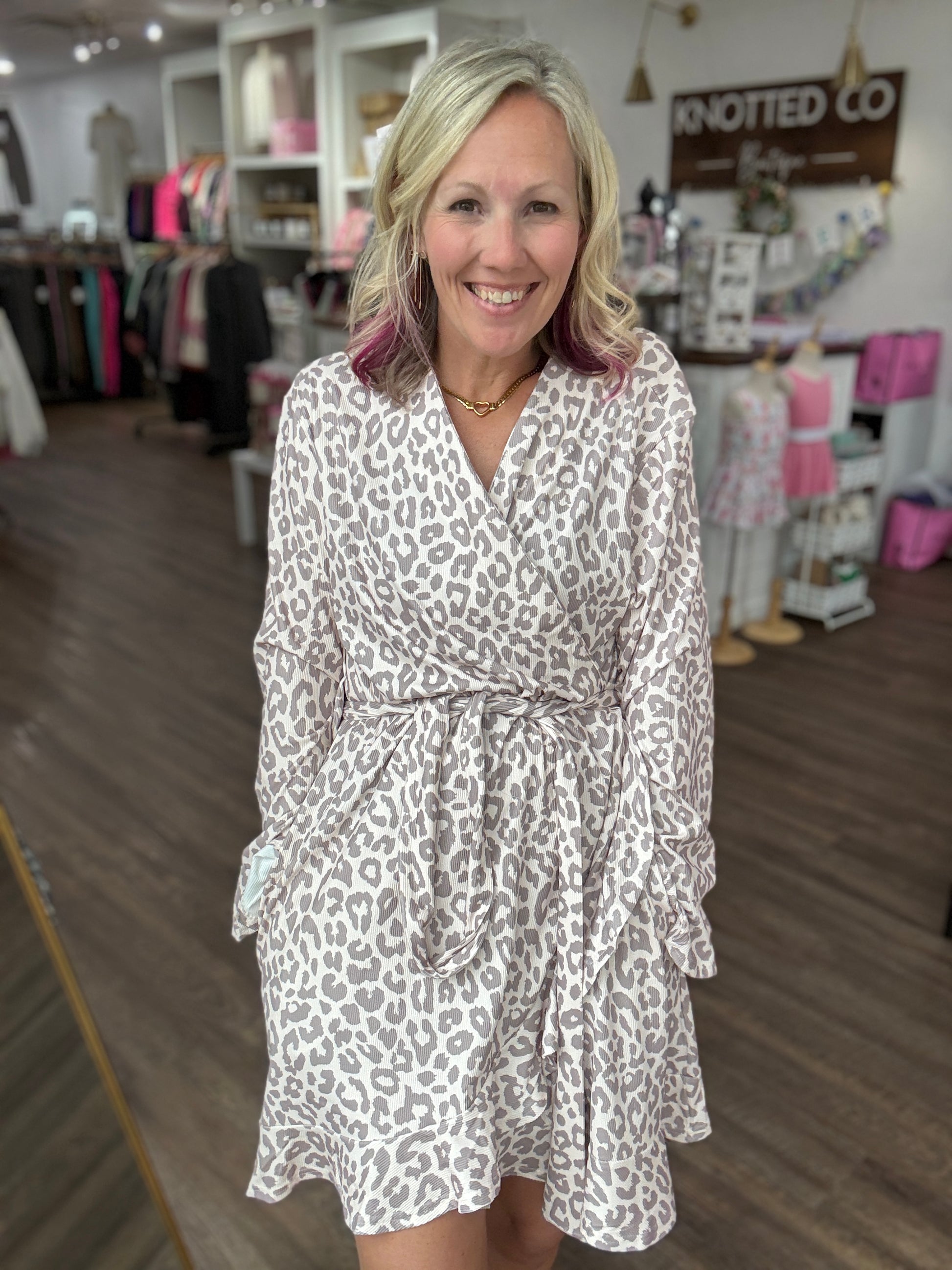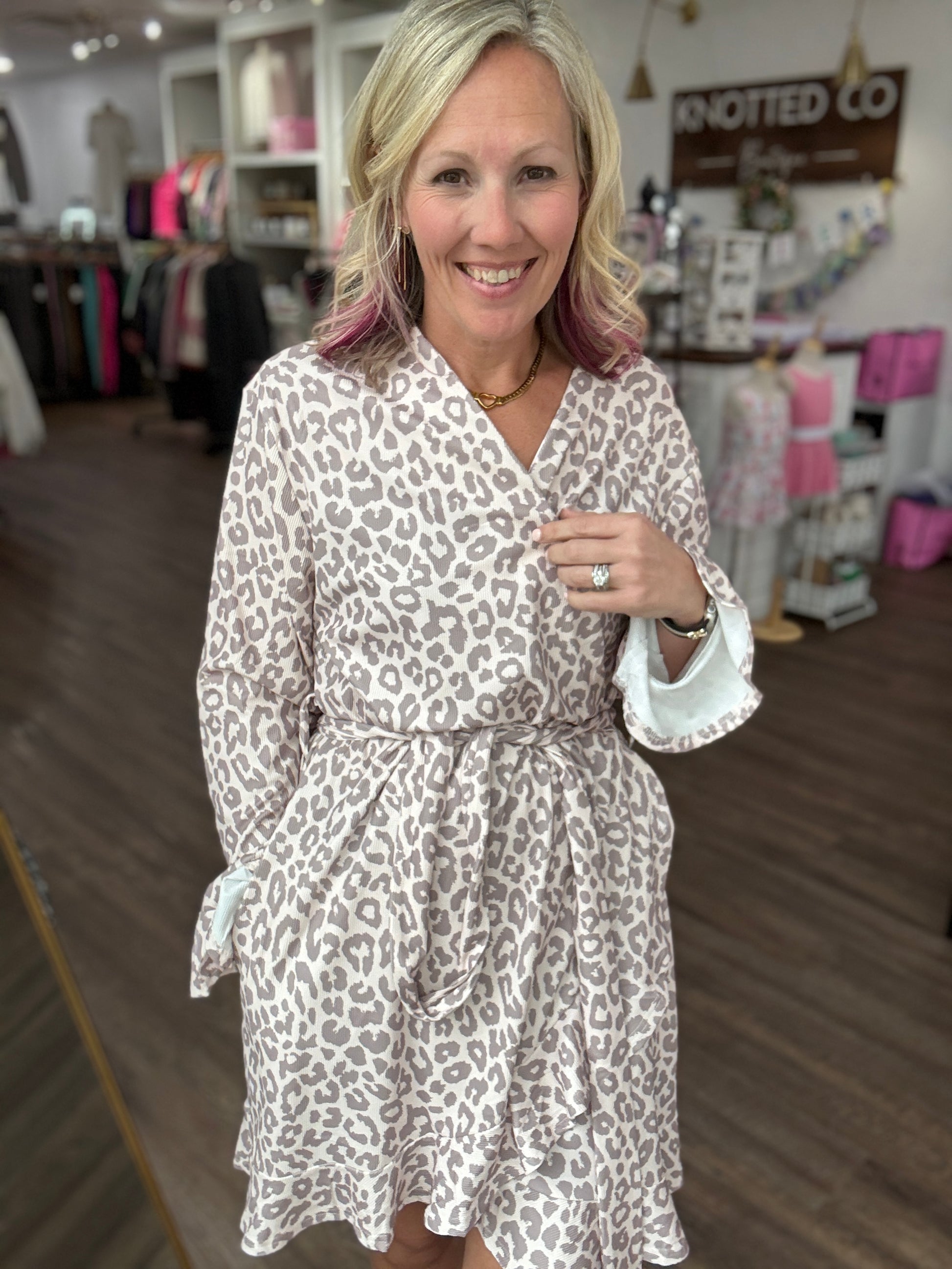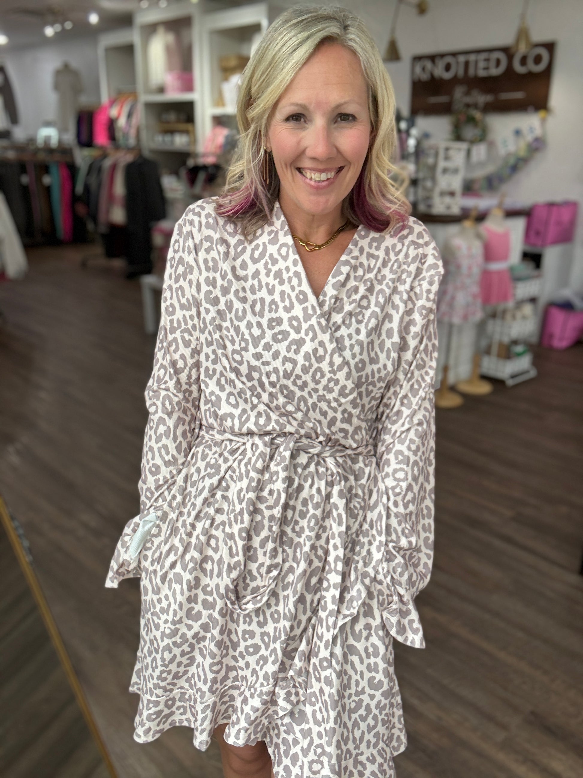 Designed with a flattering wrap silhouette, this robe features a sewn-in tie belt that stays in place and gives you an adjustable, secure fit as you move through your routine. The relaxed long sleeves provide easy coverage, while the gently flared hem adds a soft, feminine drape.