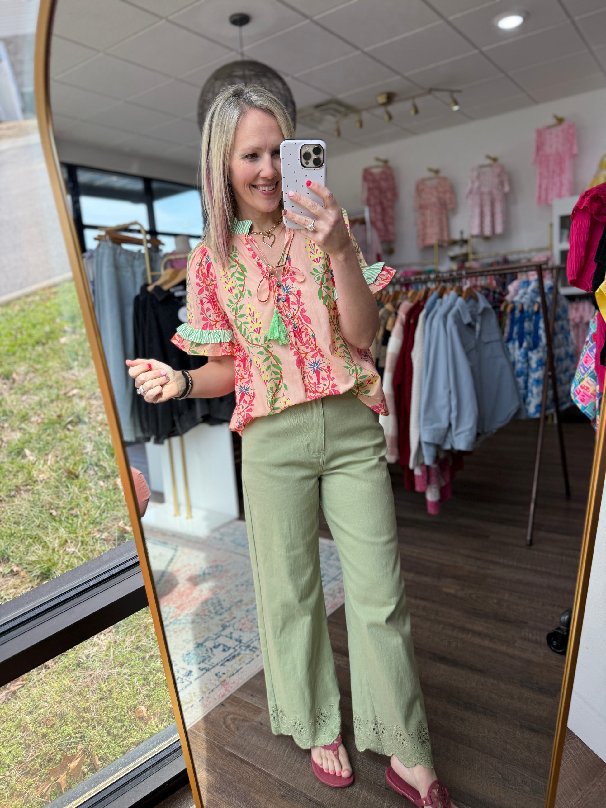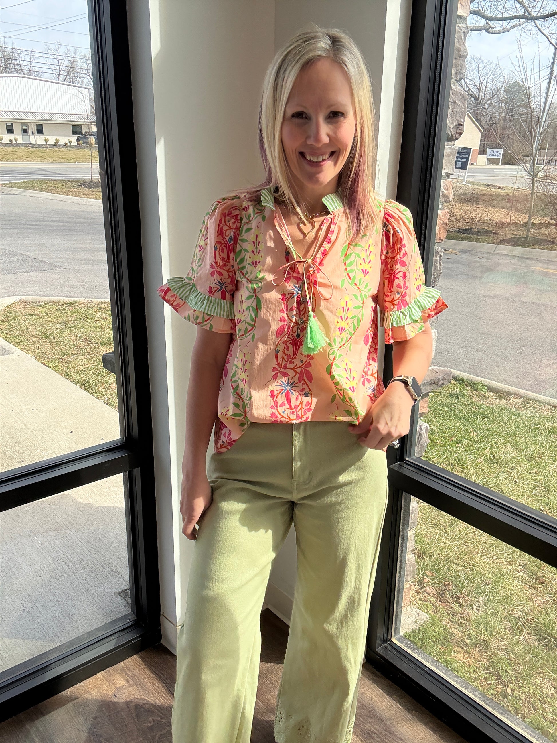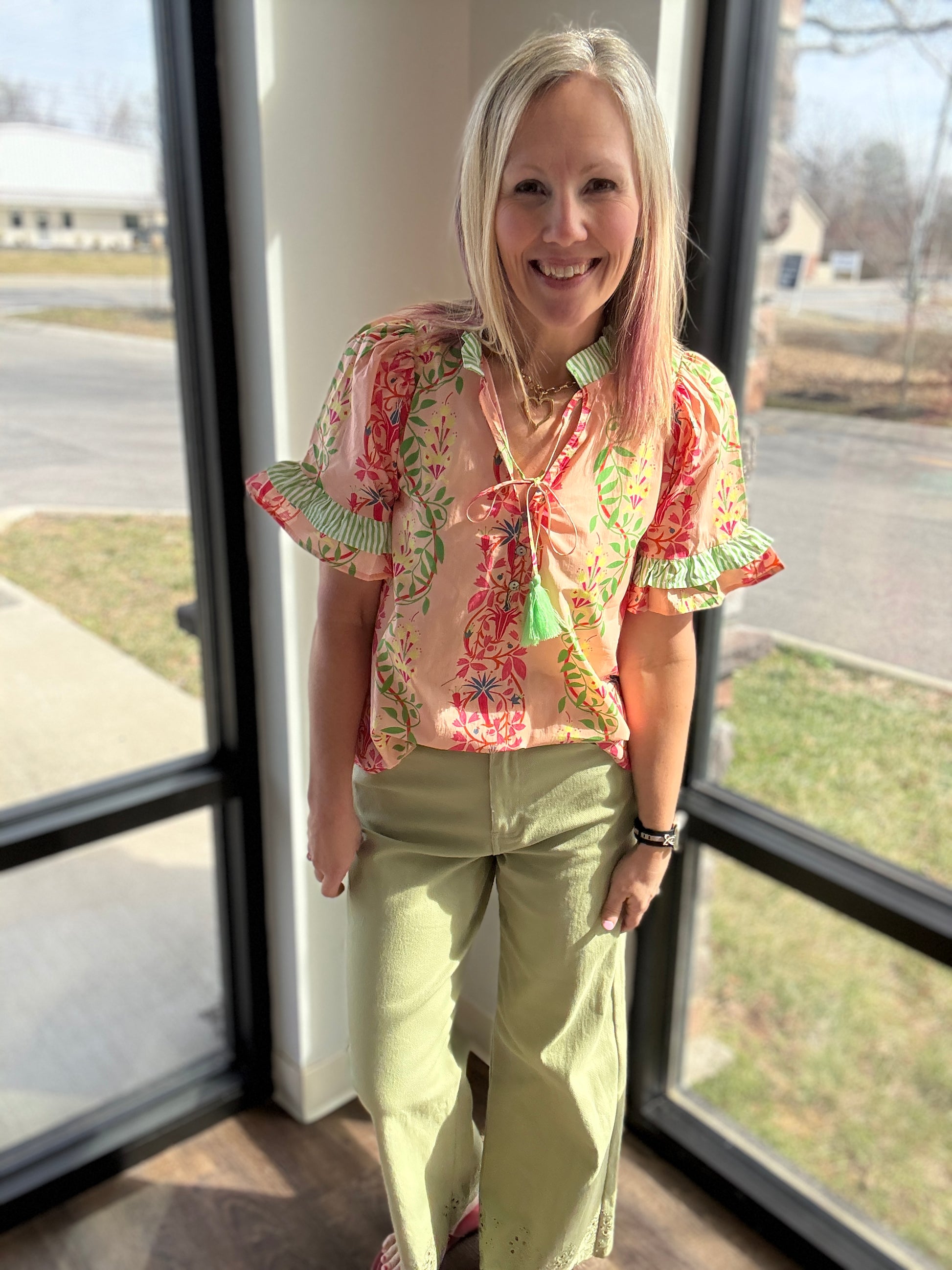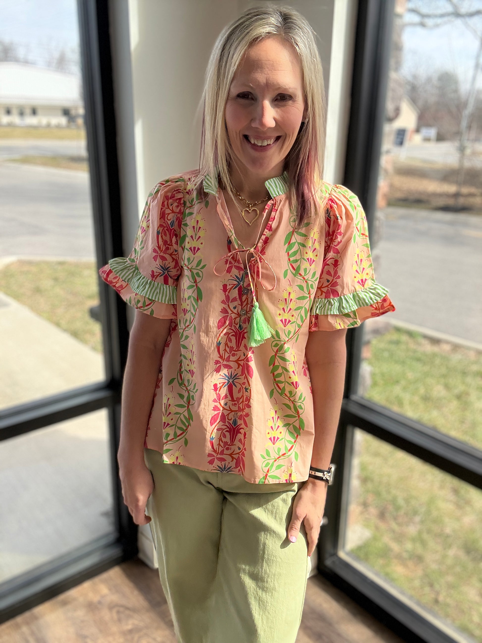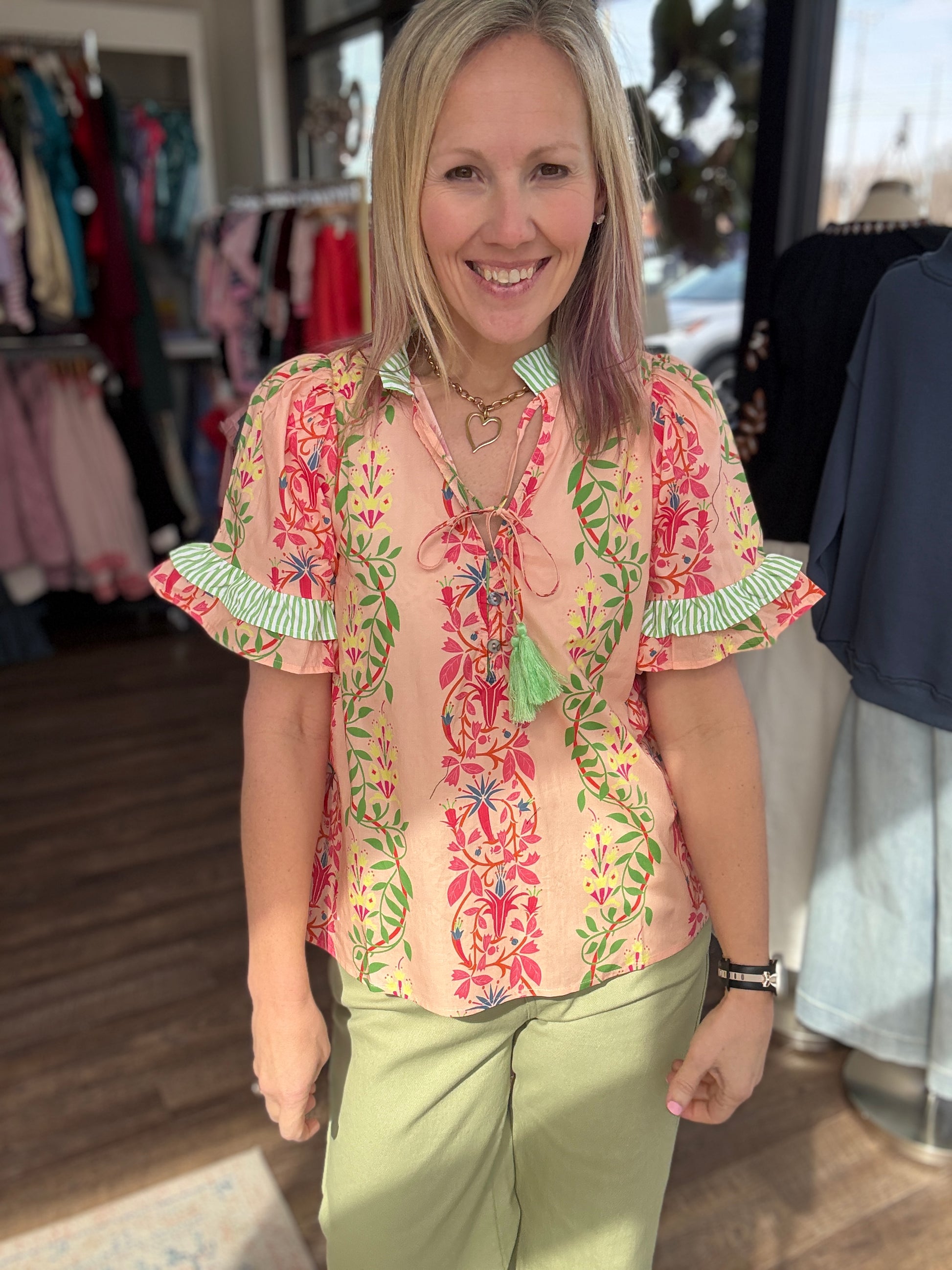 Fresh, feminine, and full of boutique charm — the Bloom & Stripe Puff Sleeve Top is the perfect way to brighten up your everyday style. Featuring a soft pink background with a delicate floral pattern, this lightweight woven top is finished with contrast green striped ruffle trim for a fun pop of detail. Short puff sleeves add a flattering touch, while the front button closure keeps the look classic and easy to wear.