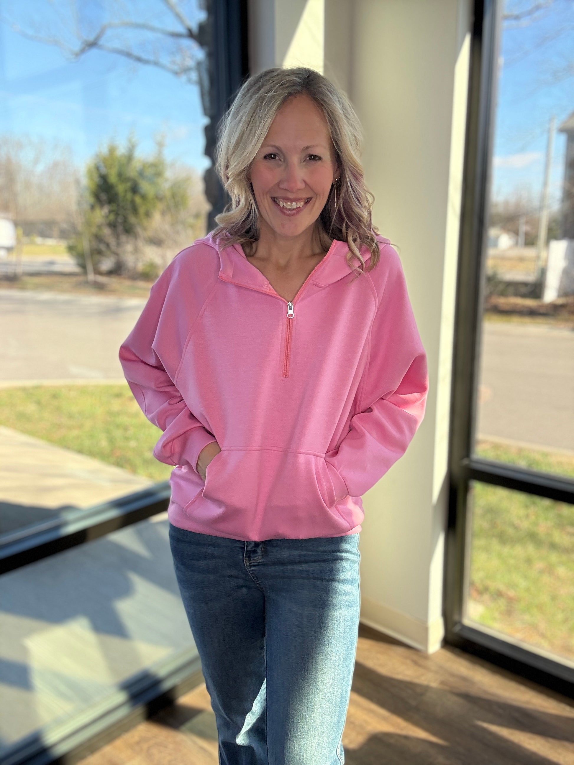 Made for cooler fall and winter days, it features a full front zipper, two zippered side pockets, and a snug stand-up collar to keep you comfy without feeling bulky. It pairs perfectly with the On-The-Go Luxe Pullover for a chic, cozy look you’ll be reaching for all season long.