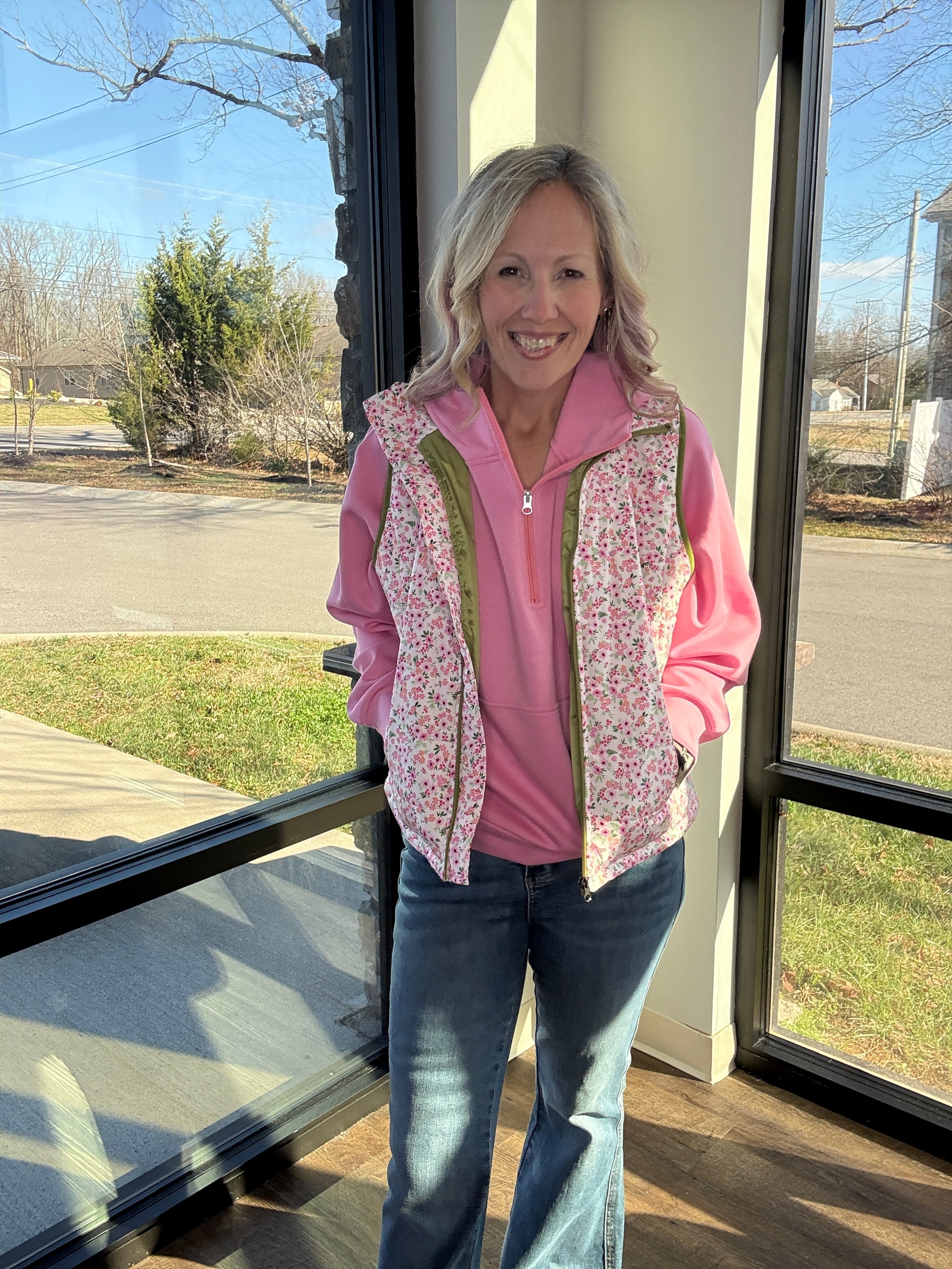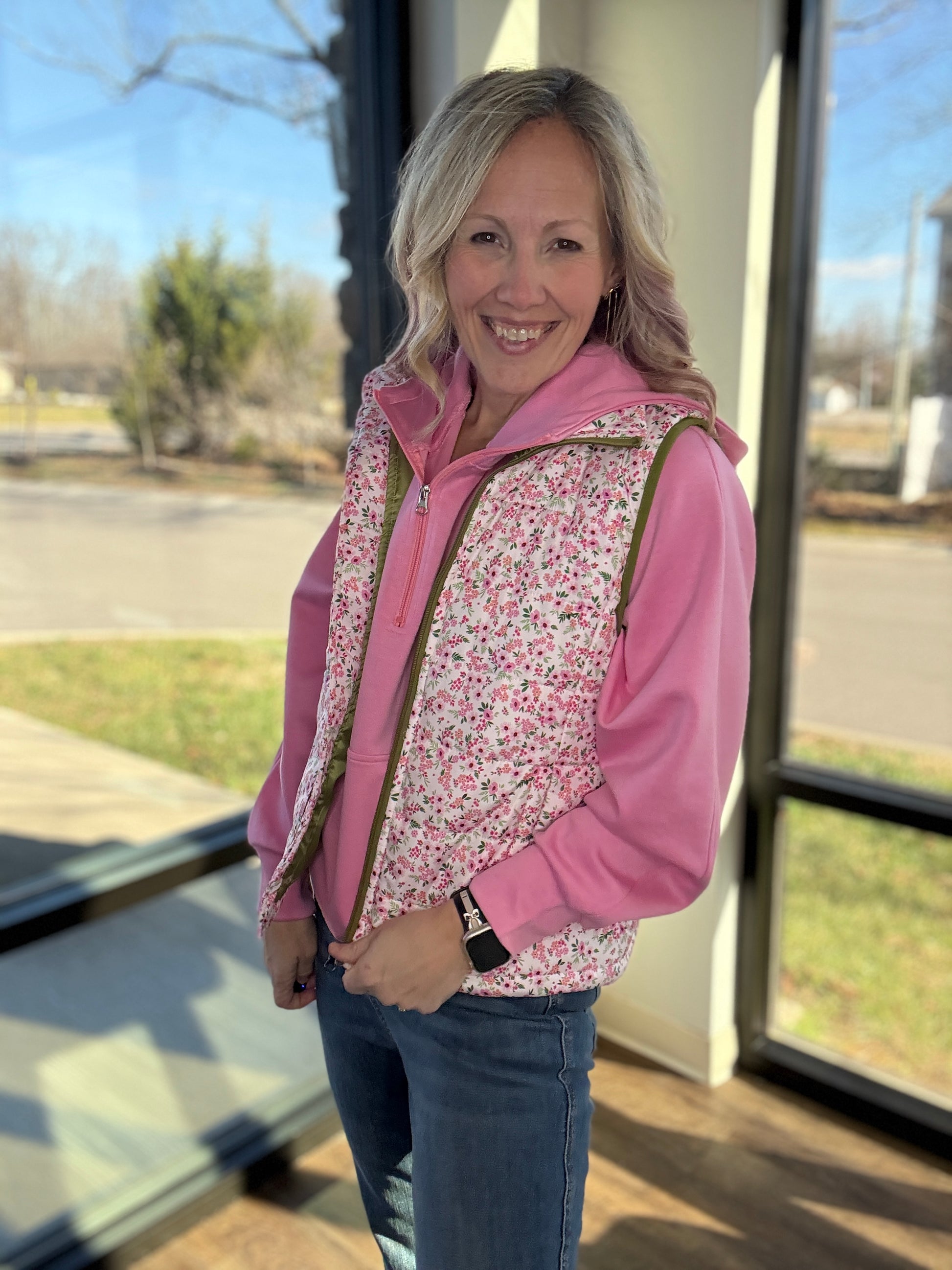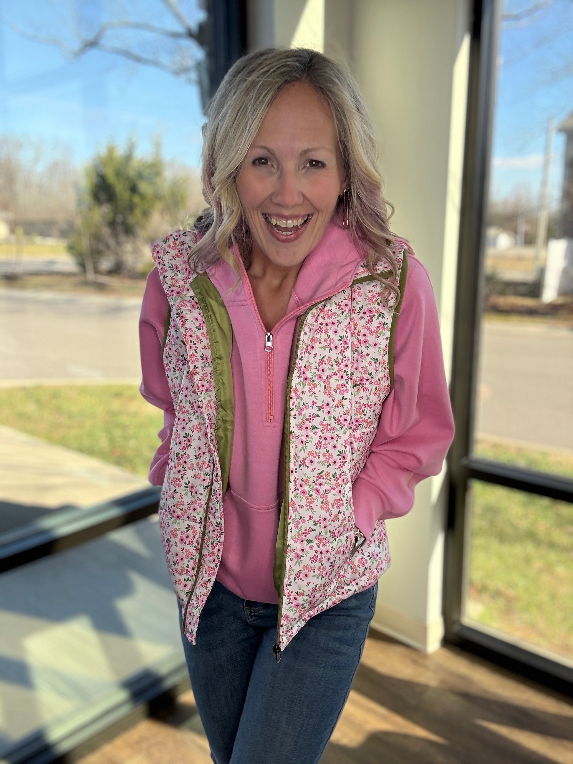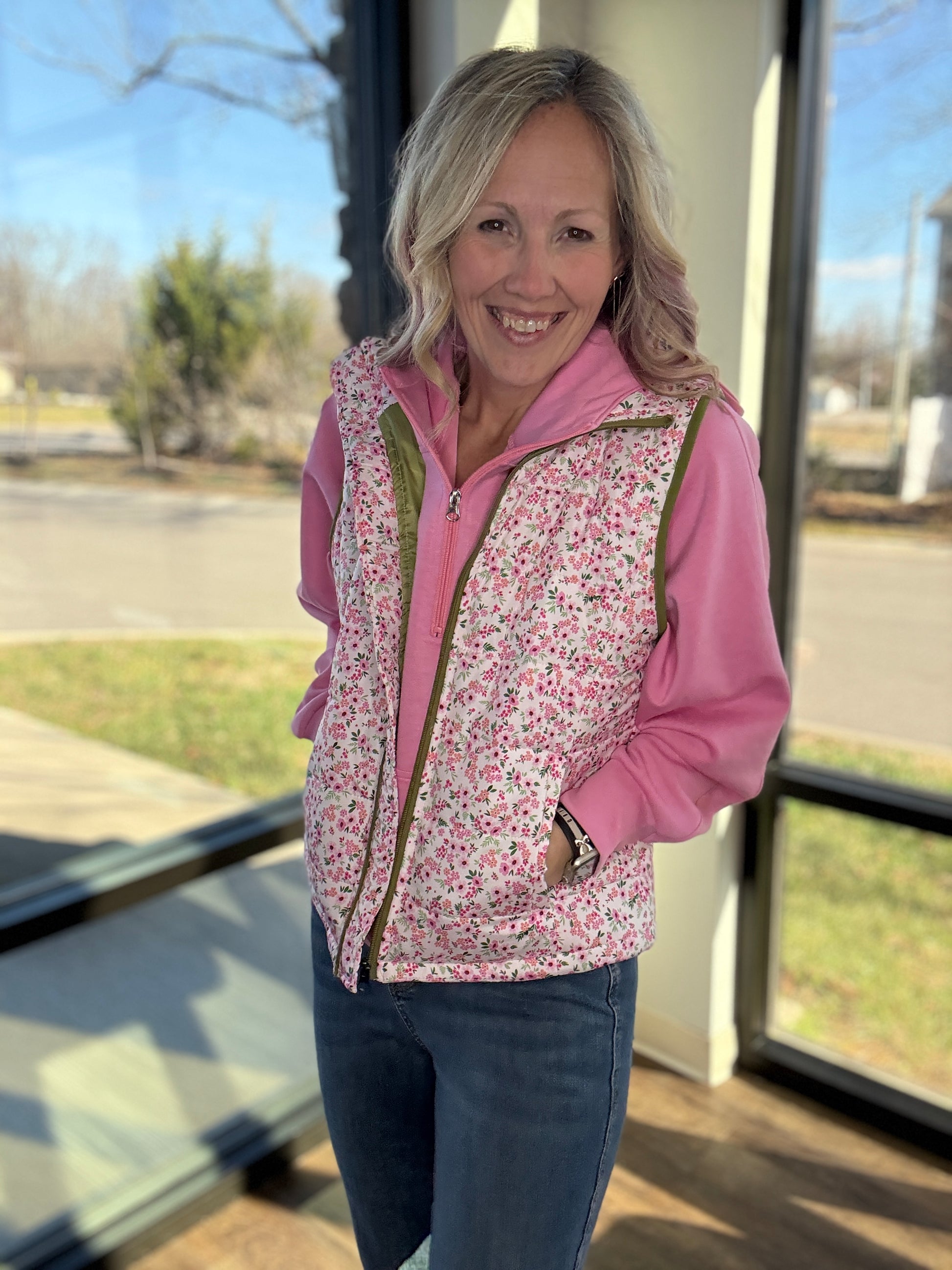 Your new cozy layering go-to is here. The Bloom & Bundle Ditsy Puffer Vest adds the perfect touch of warmth and charm to any outfit with its sweet ditsy floral print and easy, throw-on fit. Designed to layer effortlessly over your favorite long sleeve, hoodie, or mesh top, this vest is as practical as it is cute.