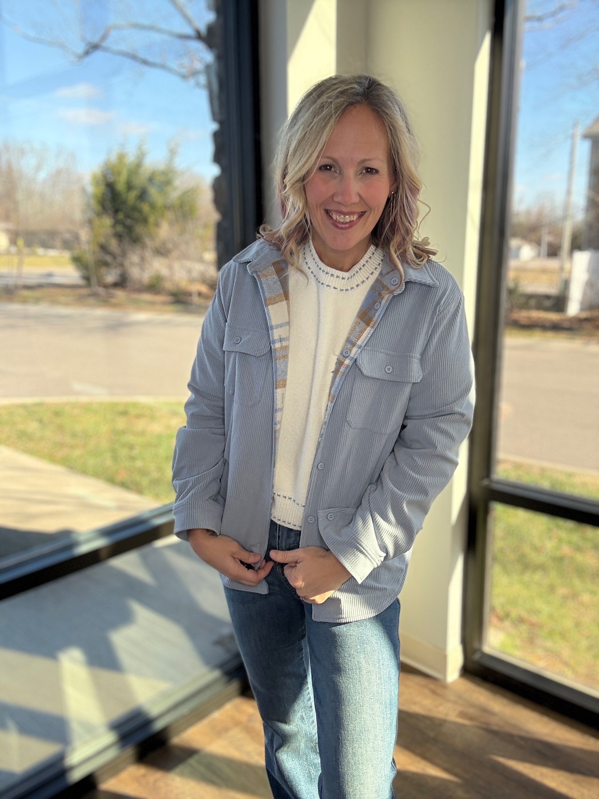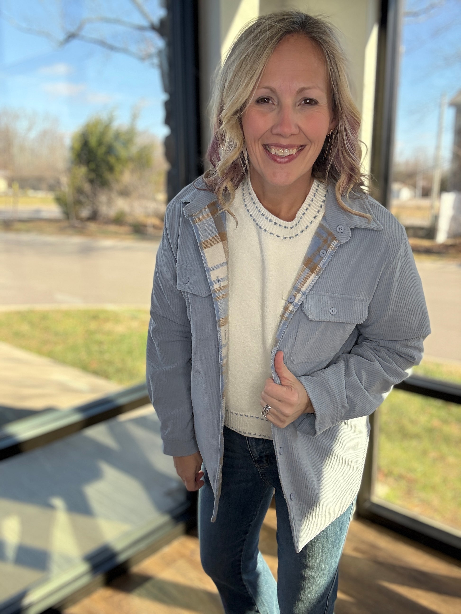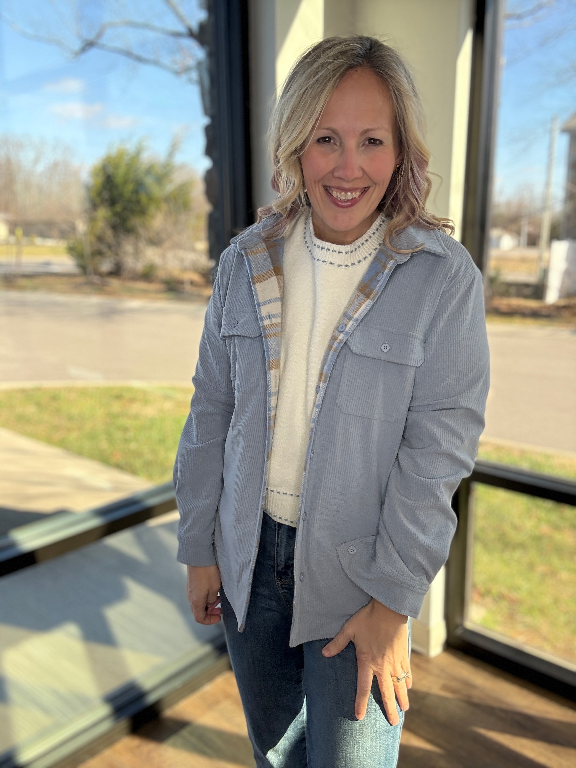 Double the style, double the wear. The Blue Ridge Reversible Shacket gives you two looks in one—making it your new go-to layer for effortless outfit changes. One side features a soft stone blue corduroy with that perfect lived-in texture, while the reverse showcases a crisp white, blue, and cream striped plaid for a classic, cozy vibe.