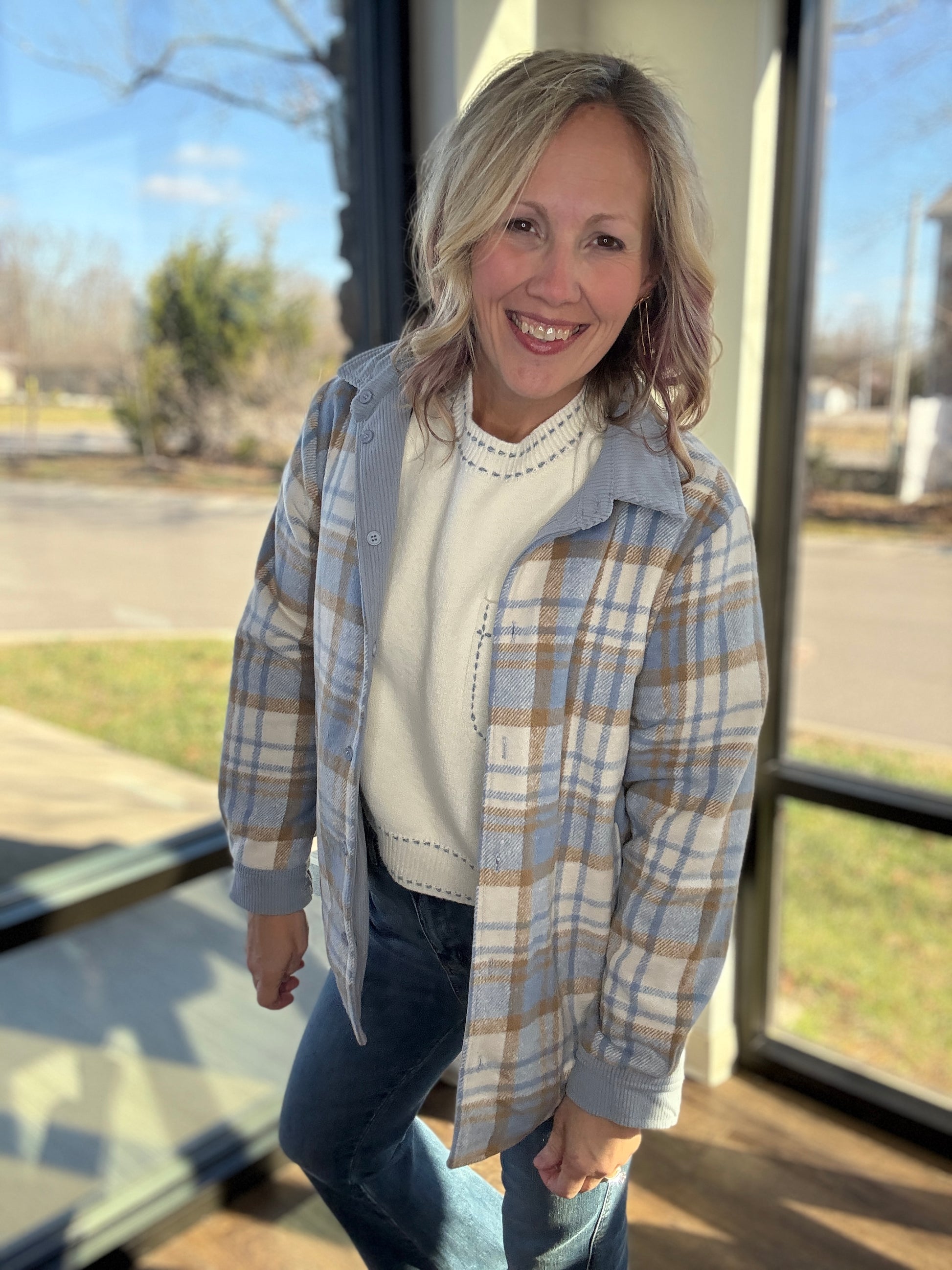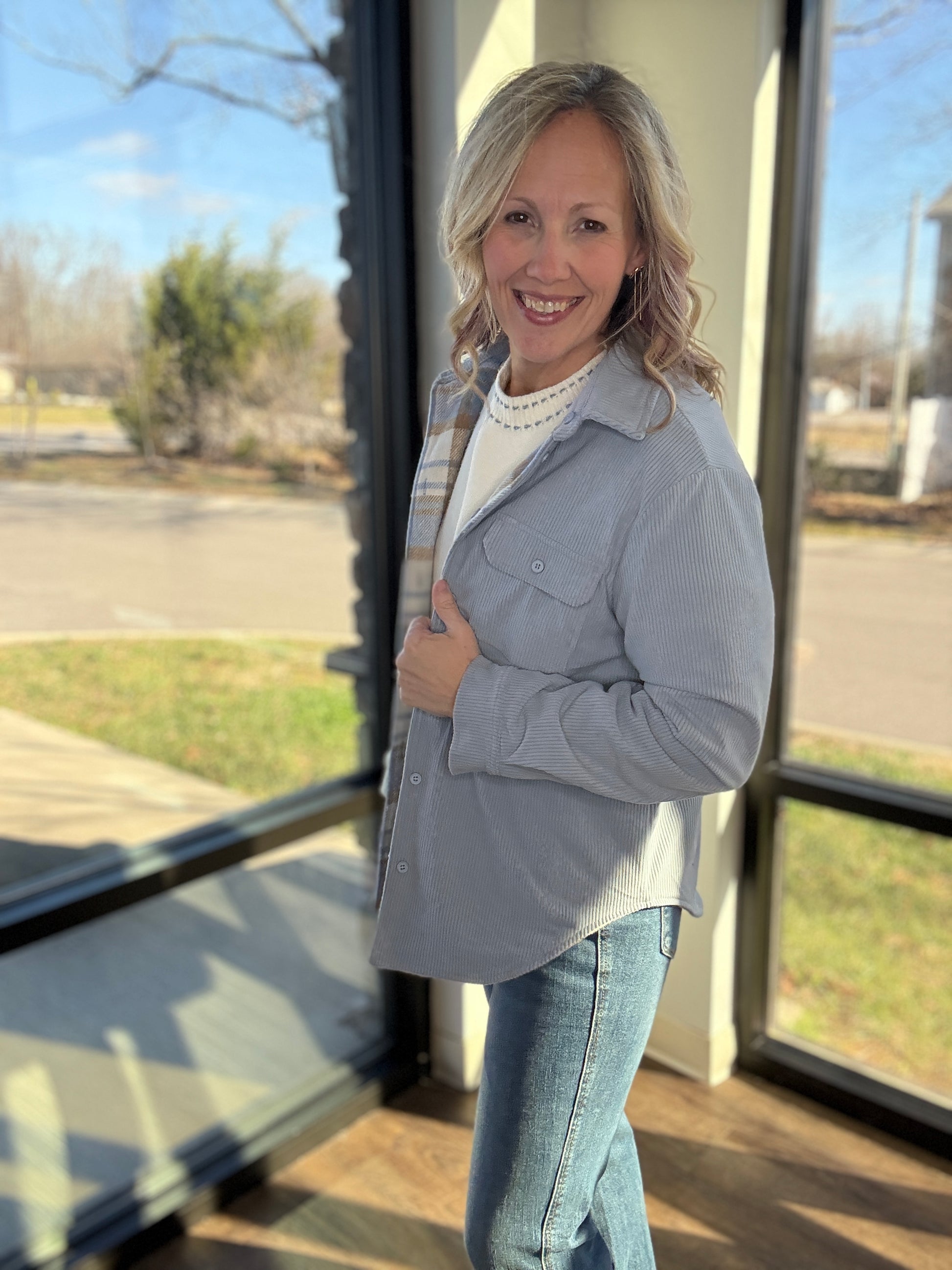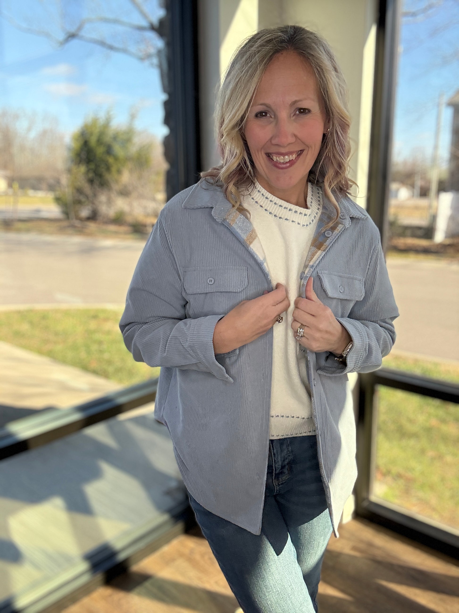 Double the style, double the wear. The Blue Ridge Reversible Shacket gives you two looks in one—making it your new go-to layer for effortless outfit changes. One side features a soft stone blue corduroy with that perfect lived-in texture, while the reverse showcases a crisp white, blue, and cream striped plaid for a classic, cozy vibe.