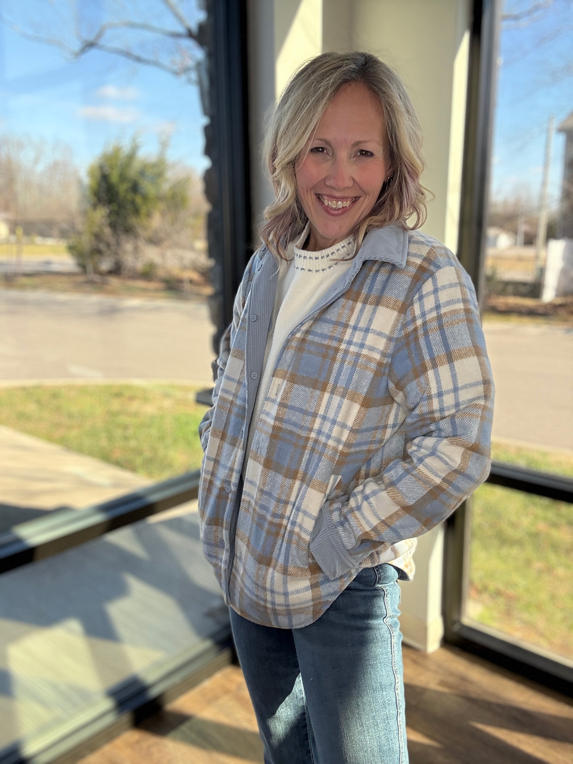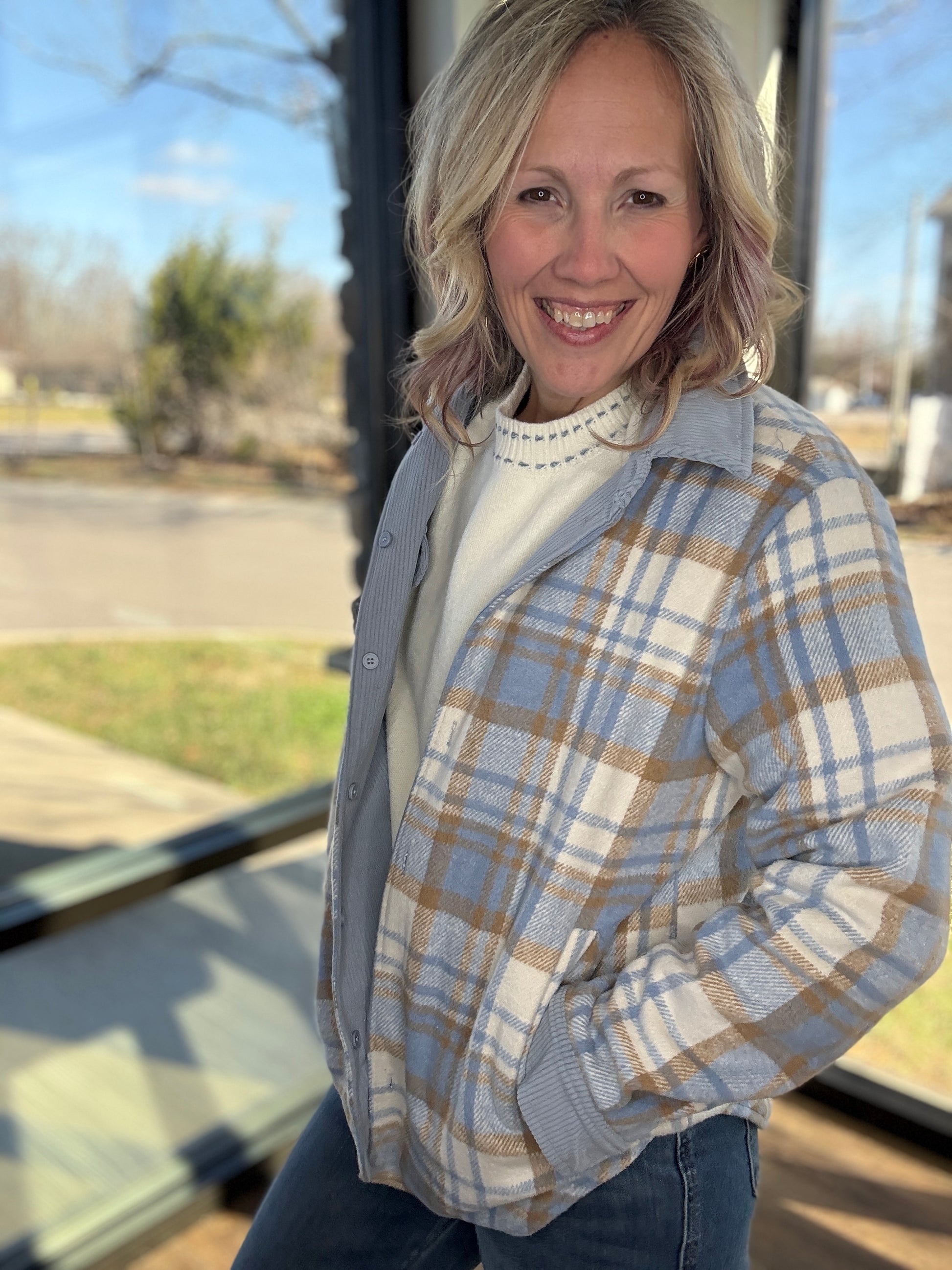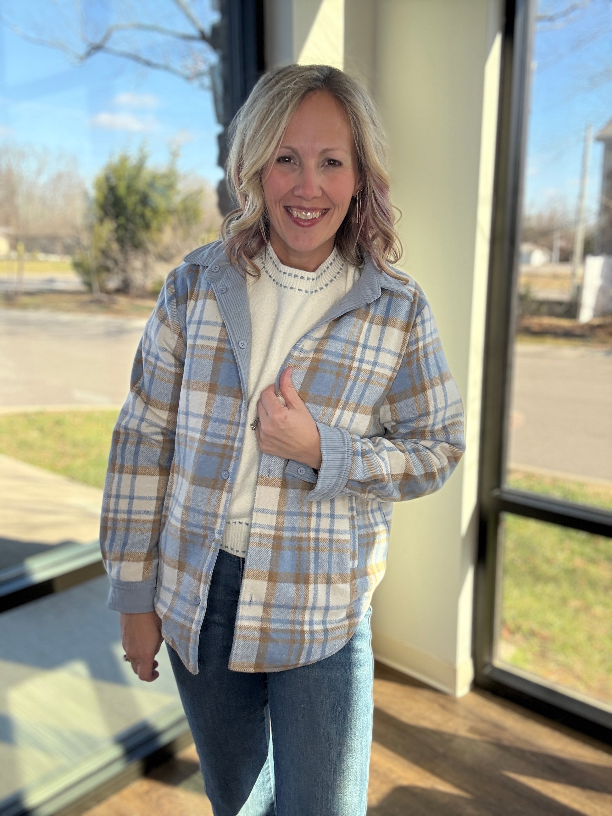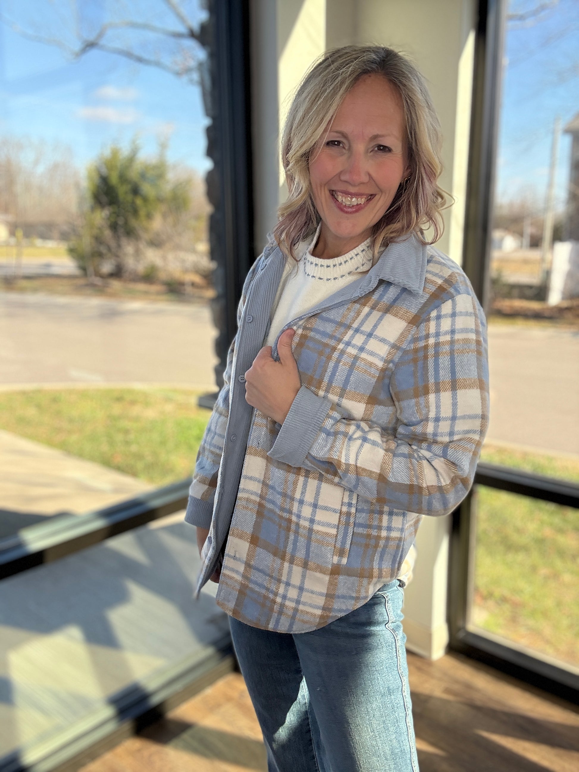 Designed as a button-up shacket, it’s easy to style open or closed, layered over tees, tanks, or lightweight sweaters. Whether you’re going for easygoing corduroy or timeless plaid, this piece keeps you warm, stylish, and ready for anything.