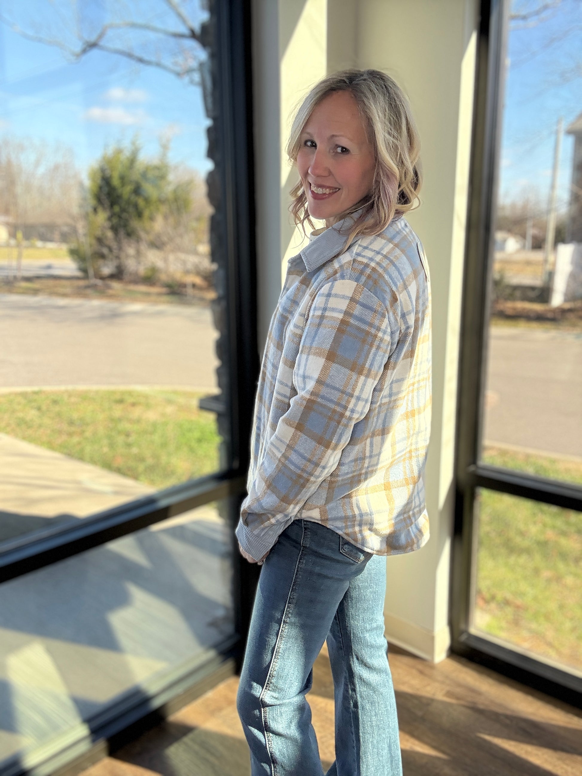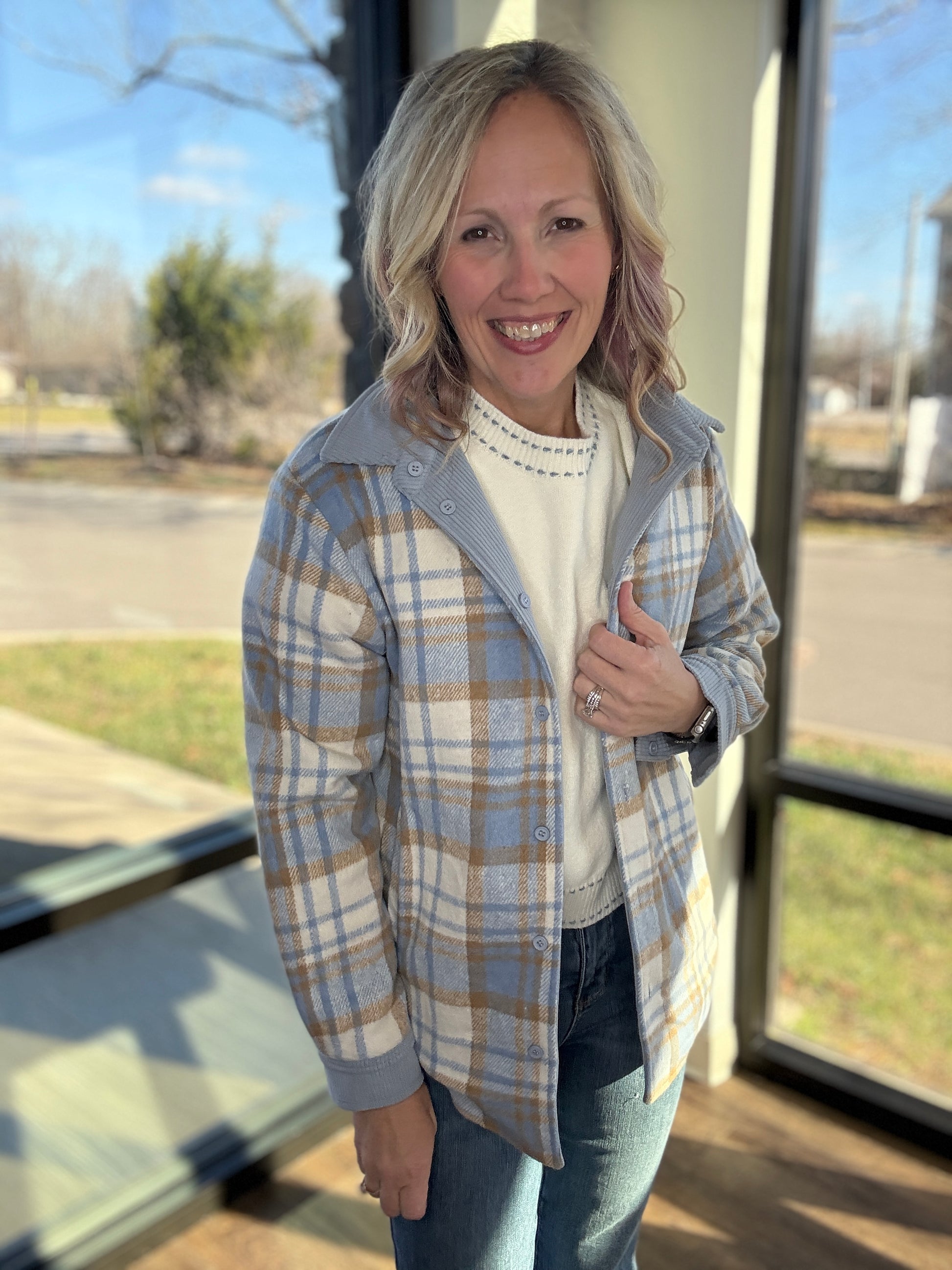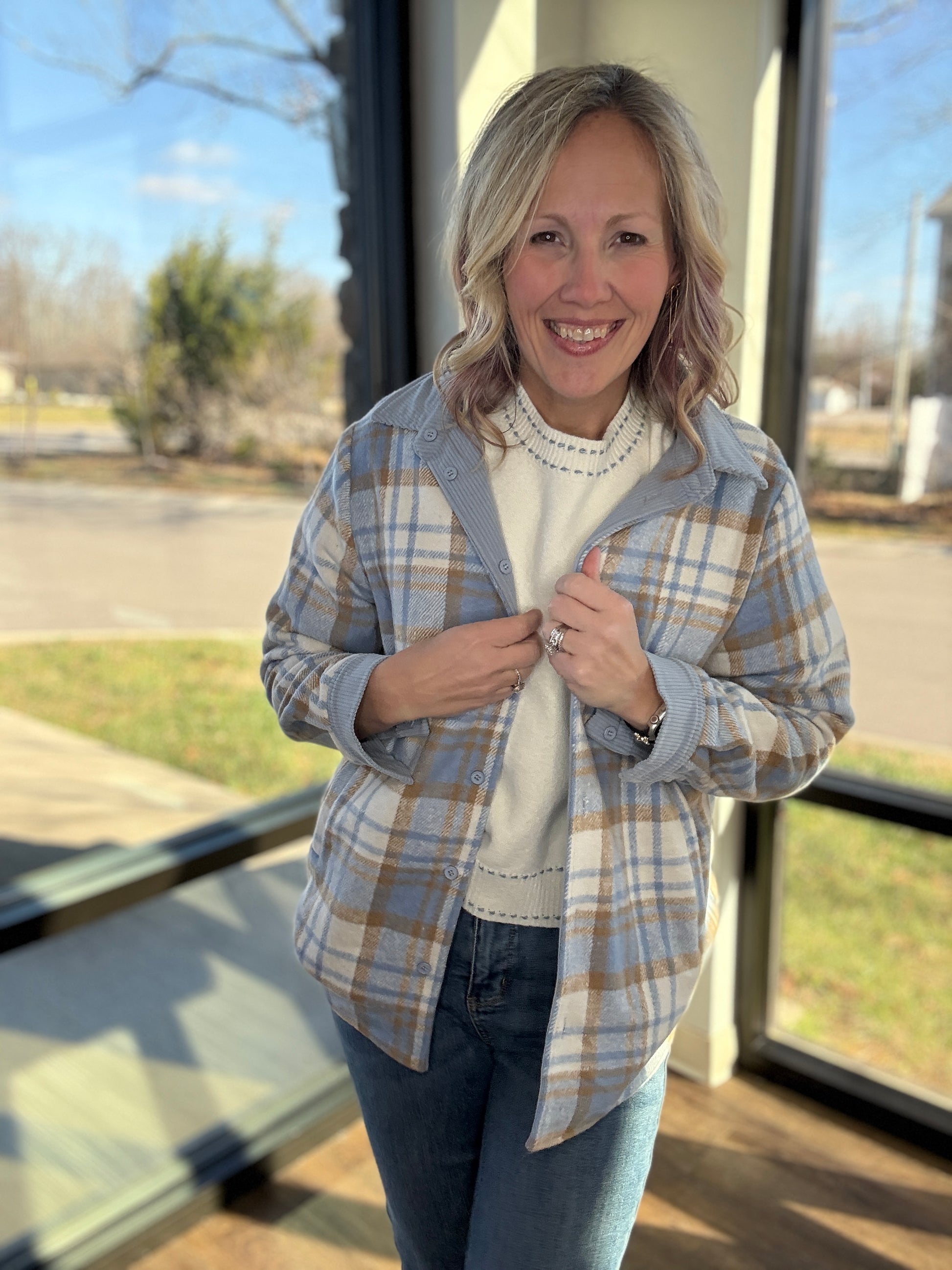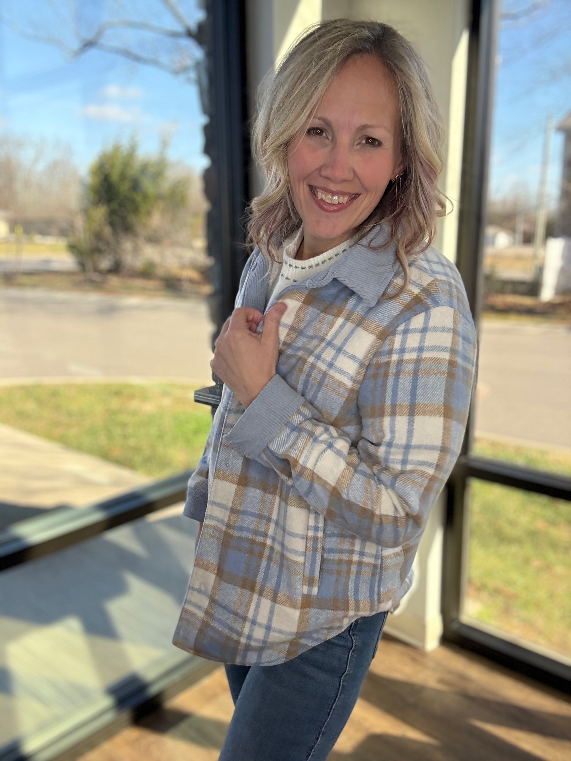 Designed as a button-up shacket, it’s easy to style open or closed, layered over tees, tanks, or lightweight sweaters. Whether you’re going for easygoing corduroy or timeless plaid, this piece keeps you warm, stylish, and ready for anything.