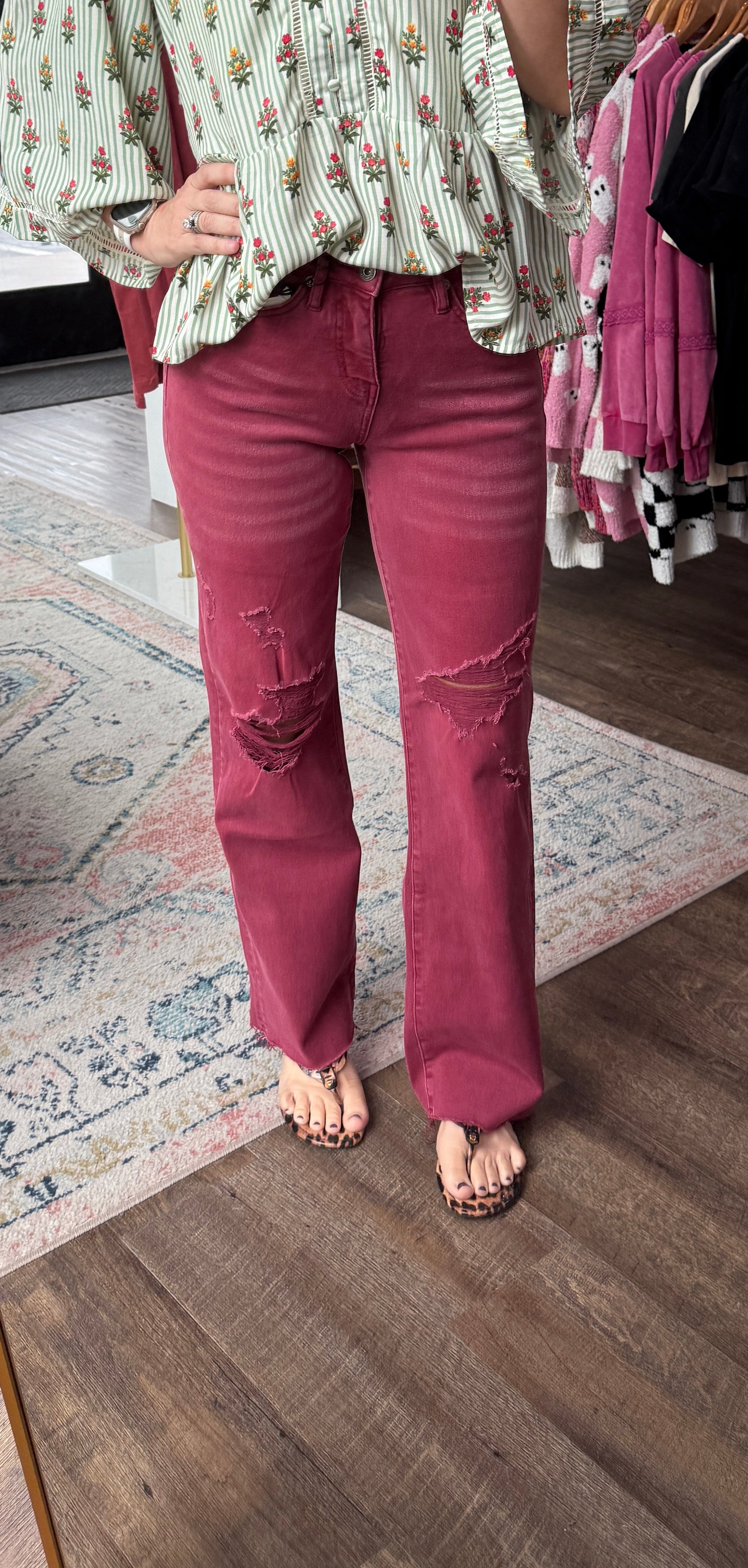 Say hello to fall’s dream denim—the Bordeaux Bliss Wide Leg Jean by Mica. Crafted in a gorgeous burgundy hue, this pair blends effortless style with Mica’s signature comfort and control. The tummy-tuck design smooths and flatters, while the amazing stretch ensures a perfect fit that moves with you. Subtle destruction gives them that lived-in edge, and the wide-leg silhouette adds a touch of modern sophistication.