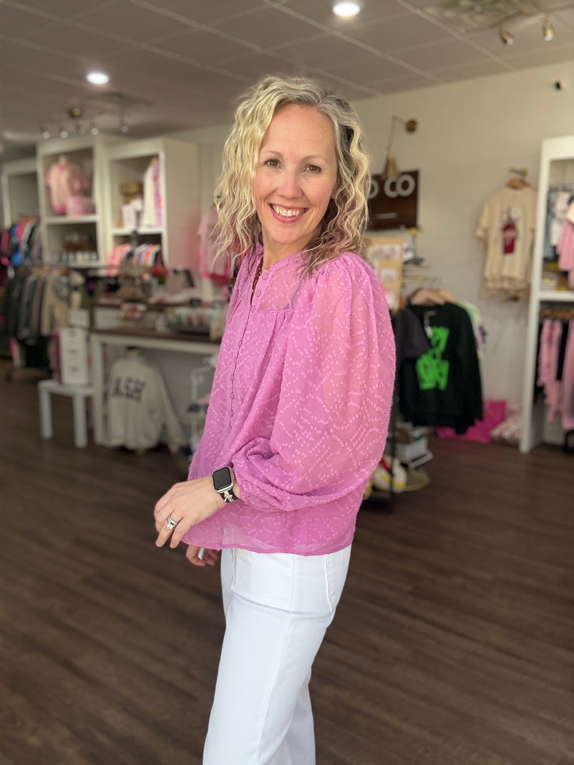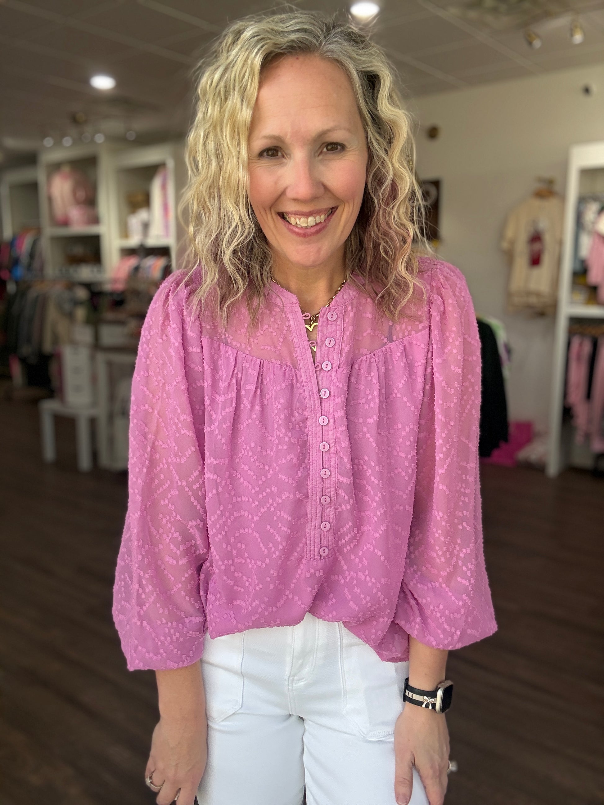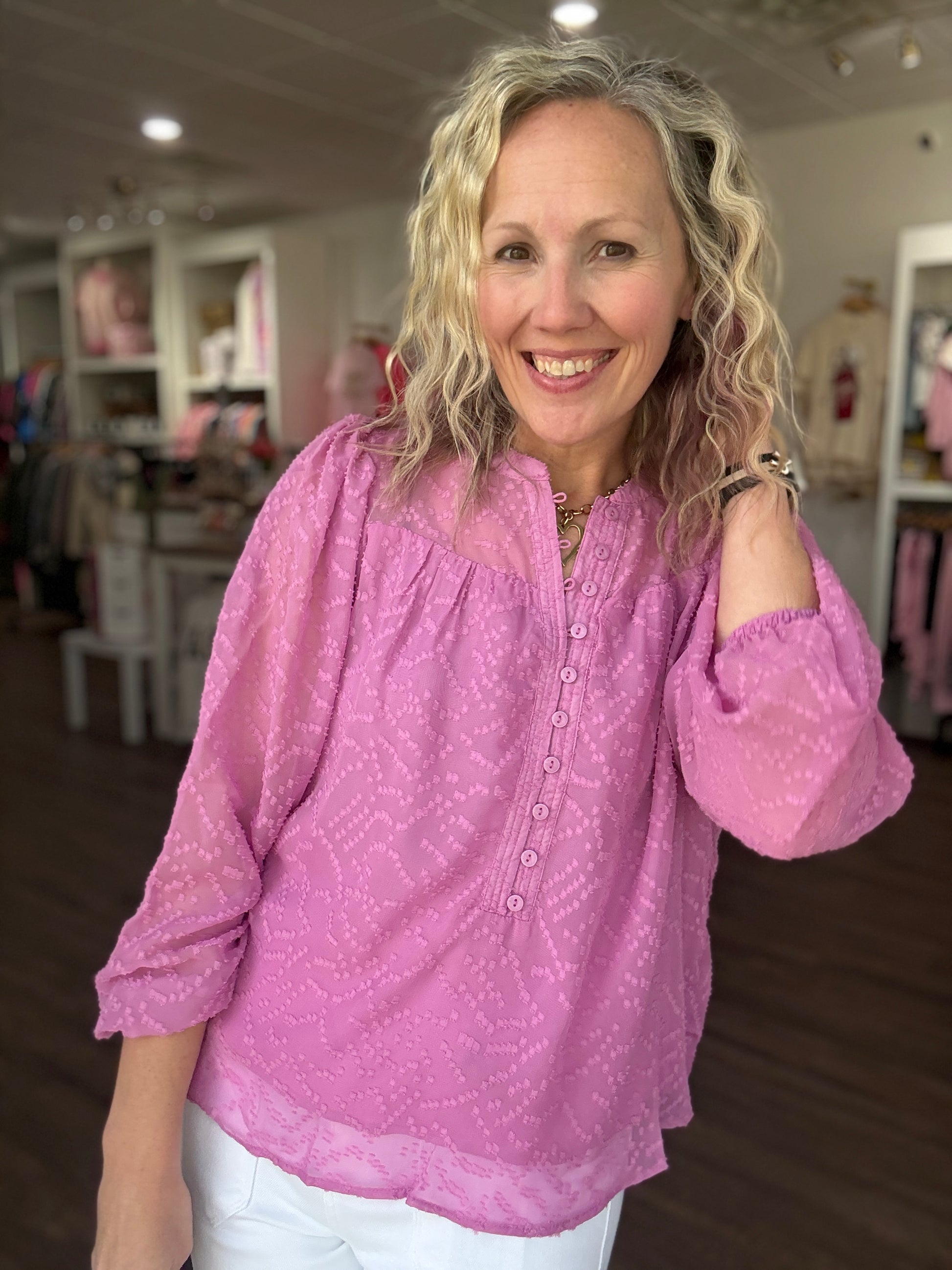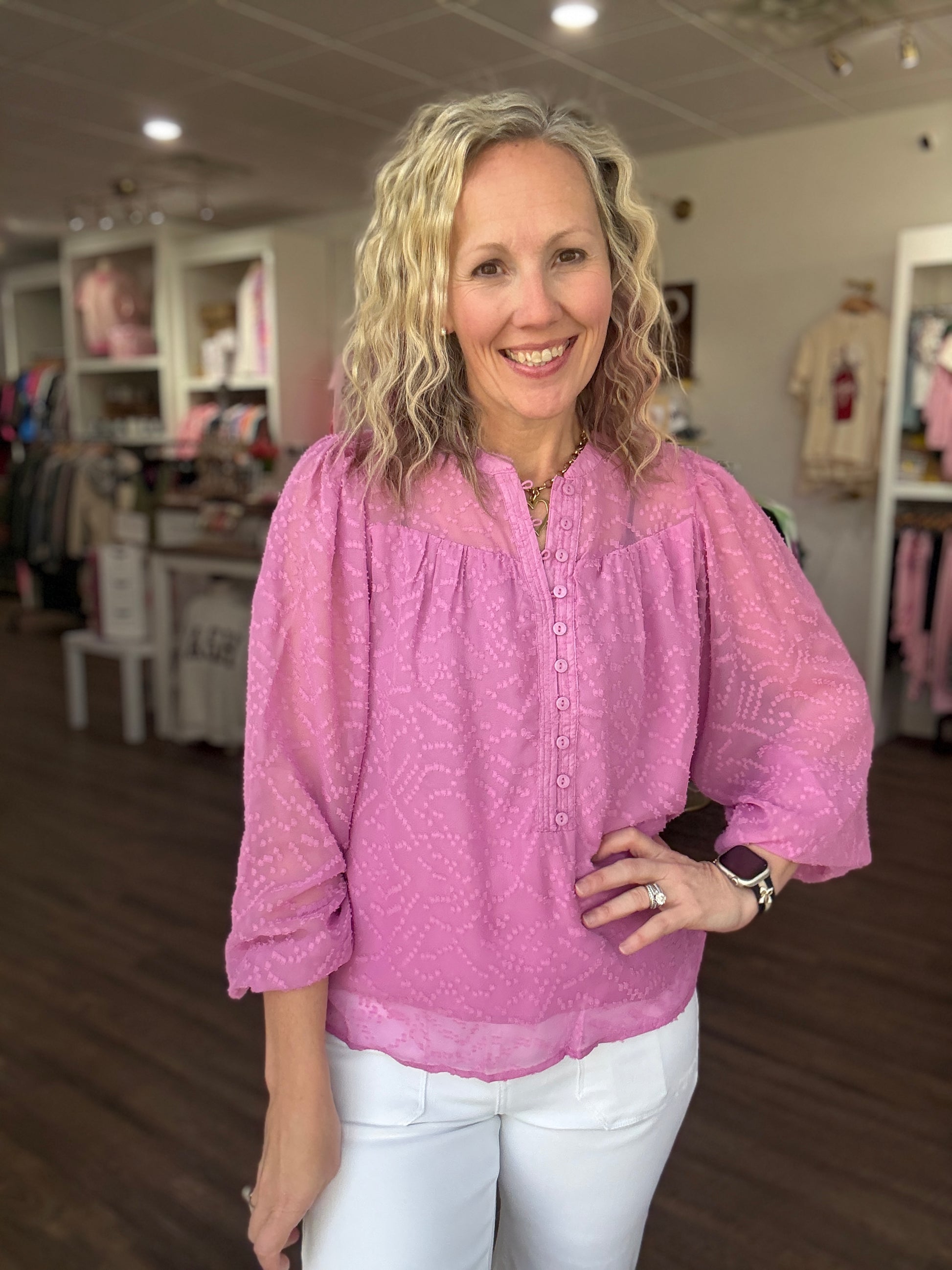Feminine, polished, and effortlessly versatile — the Brianna Top is the kind of piece that makes getting dressed easy while still feeling special. Designed with soft, elegant details, it features a delicate button-loop closure along the placket that adds a refined touch to the silhouette.