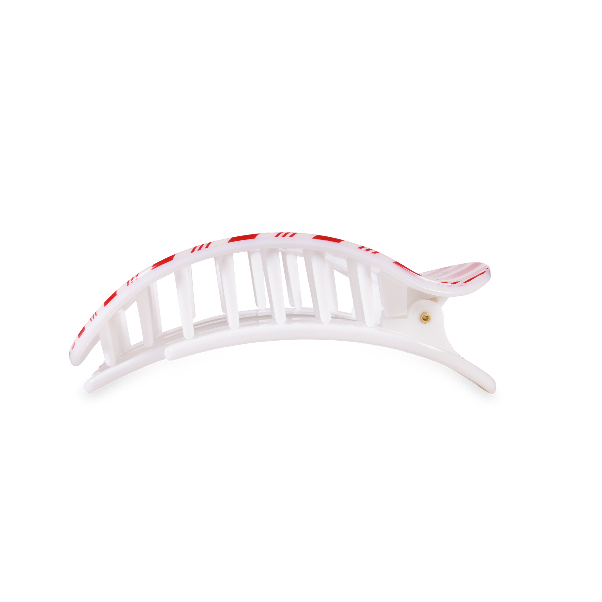 Lay flat and relax with the new TELETIES Candy Cane Crush Medium Flat Round Hair Clip in Red and White Stripes. This hair clip is designed to allow you to lay back flat, do yoga, or sit comfortably in a seat with a headrest, and it is made with the same material that is nearly unbreakable.