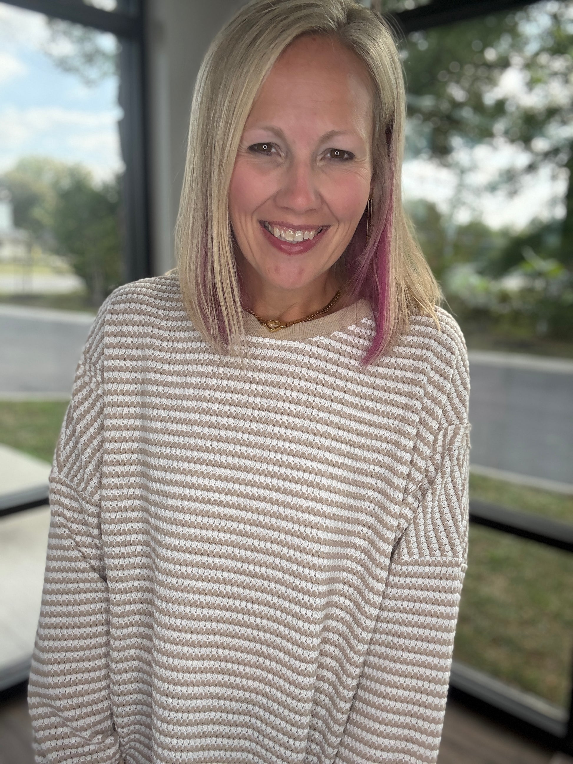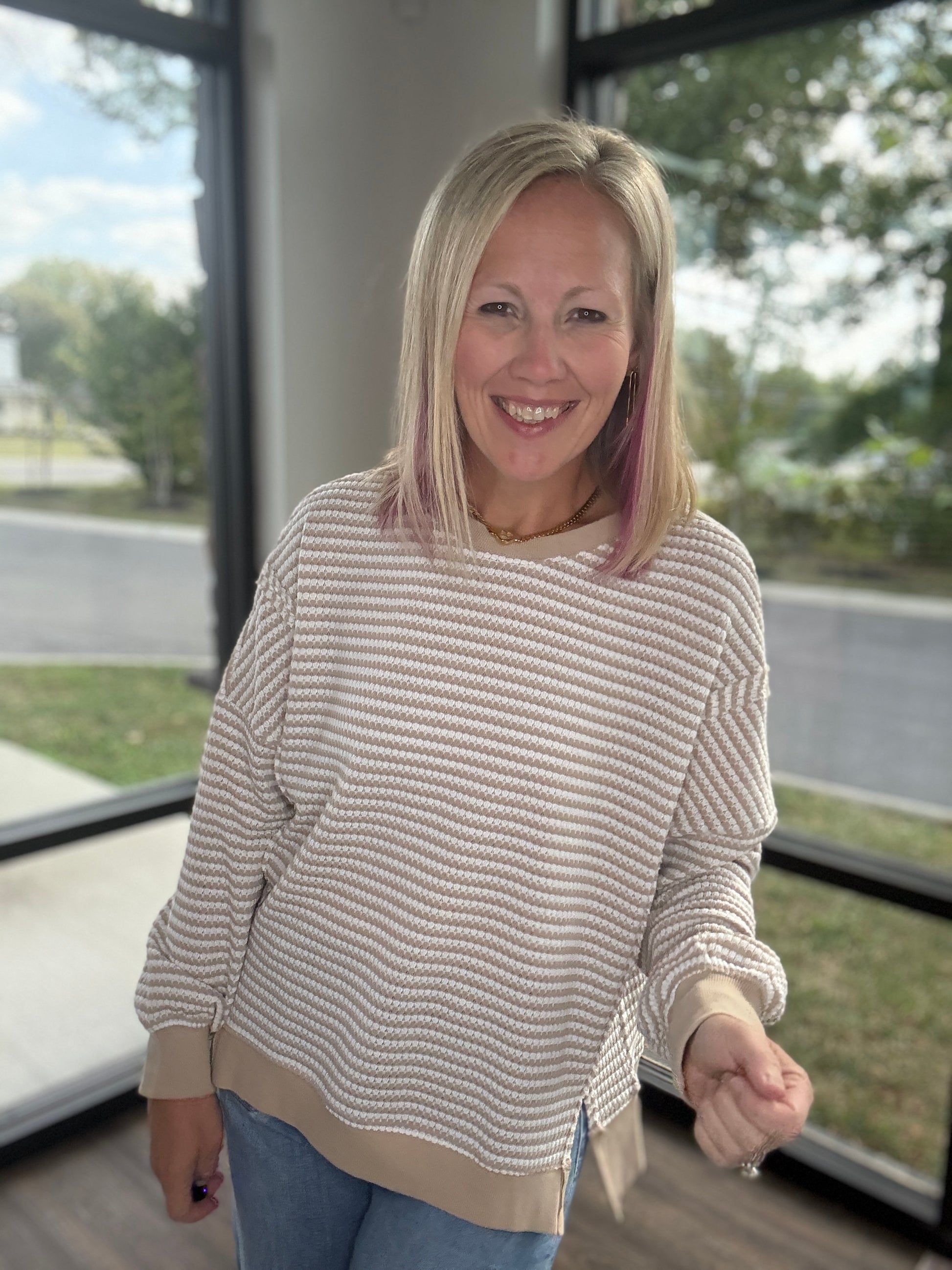 The Cappuccino Stripe Waffle Top is everything you want in a fall favorite — cozy, textured, and just the right amount of detail. Made from dreamy waffle knit fabric, it’s soft and breathable with that perfect lived-in feel.