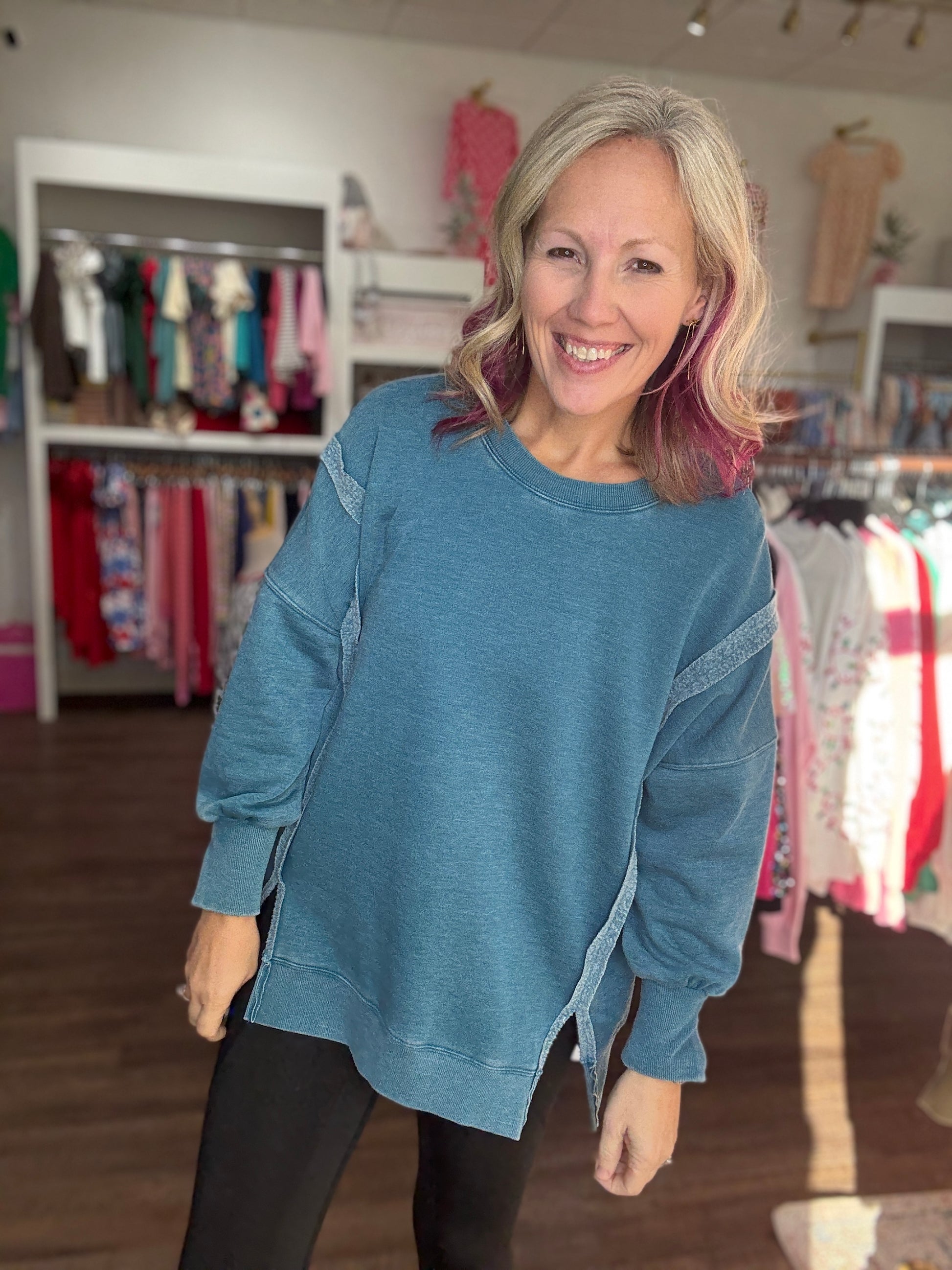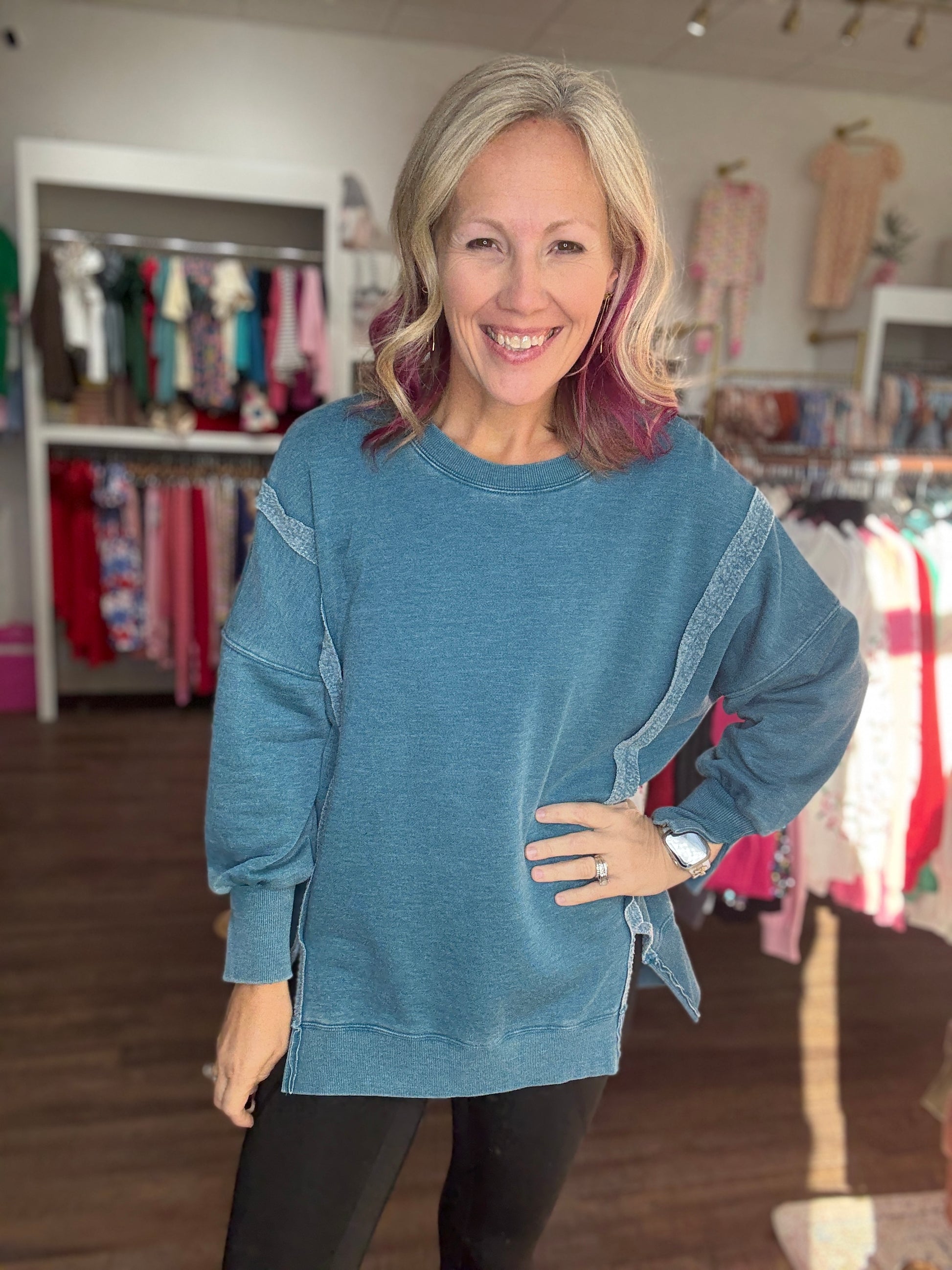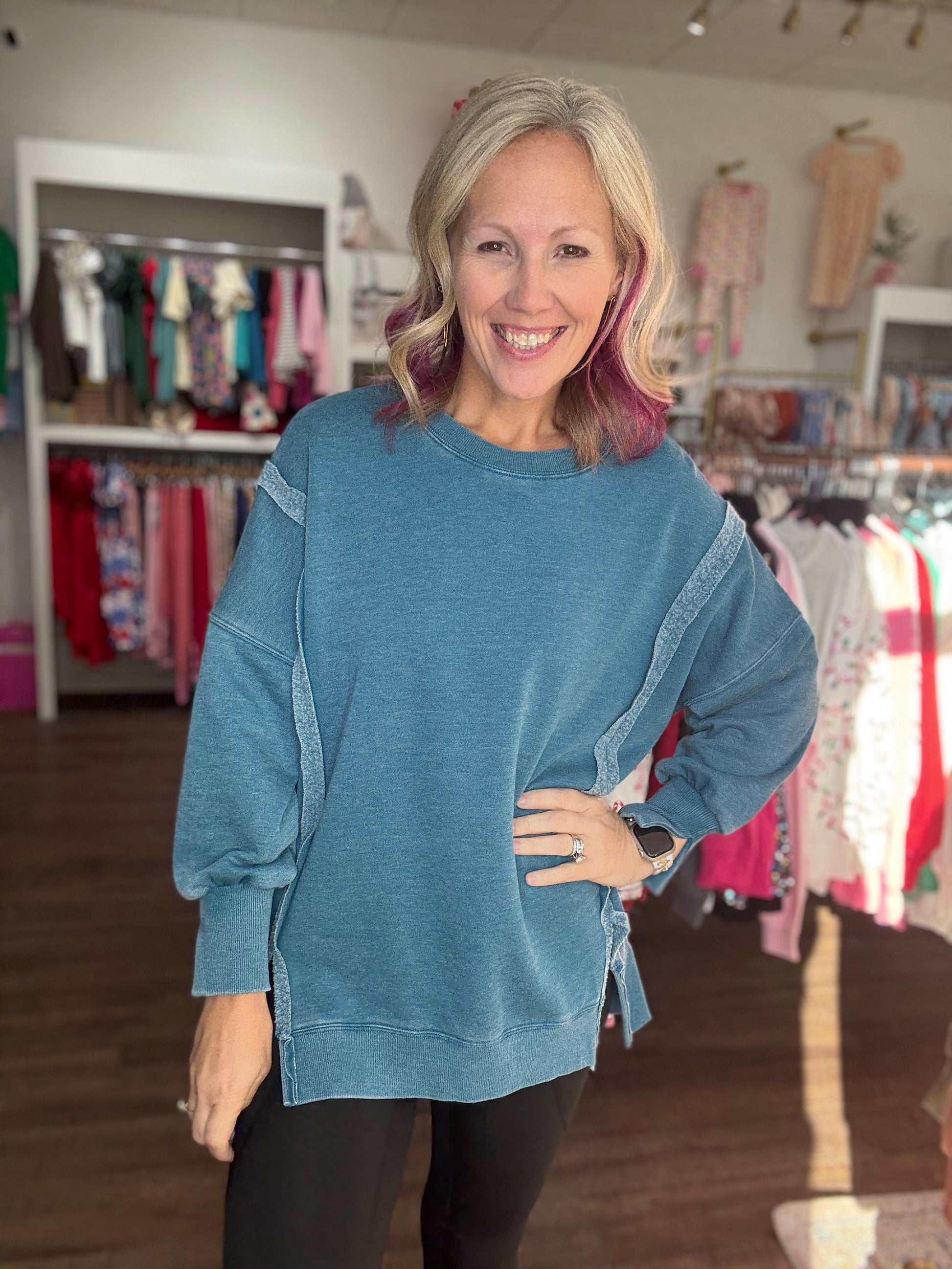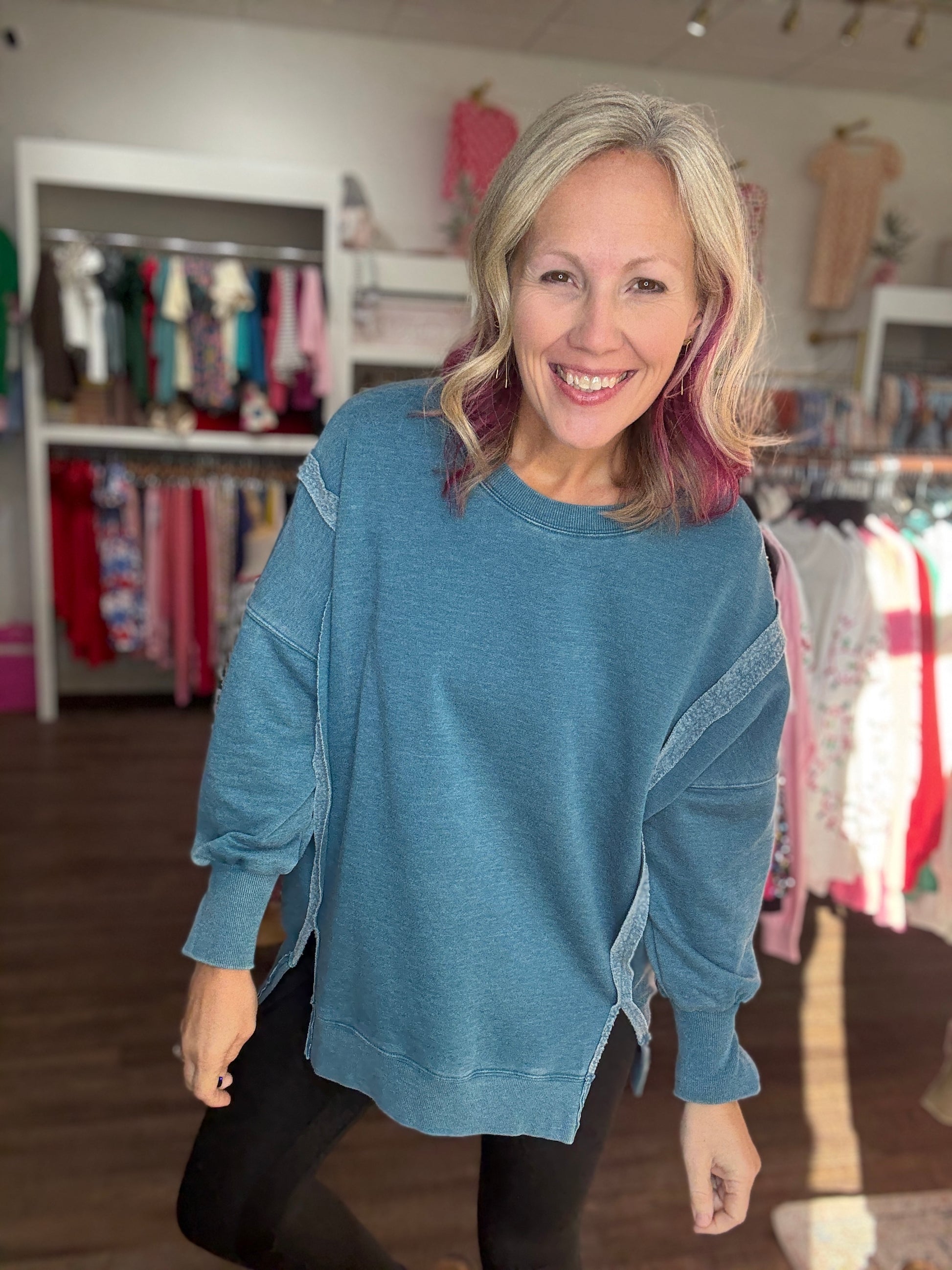 We spared no attention to detail in our new mineral washed sweatshirt! This forever timeless pullover is a slouchy, relaxed fit with exposed seaming, cute split cuff hem and ribbed trim detail! Has super soft "sweatshirt" feel on the inside! Fit: Oversized, slouchy fit Features: Dropped shoulders, scoop neckline, exposed seaming, split cuff detail
