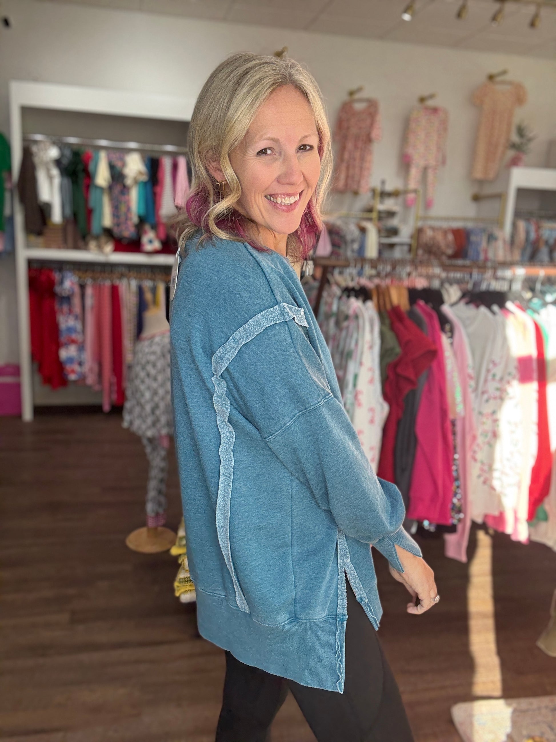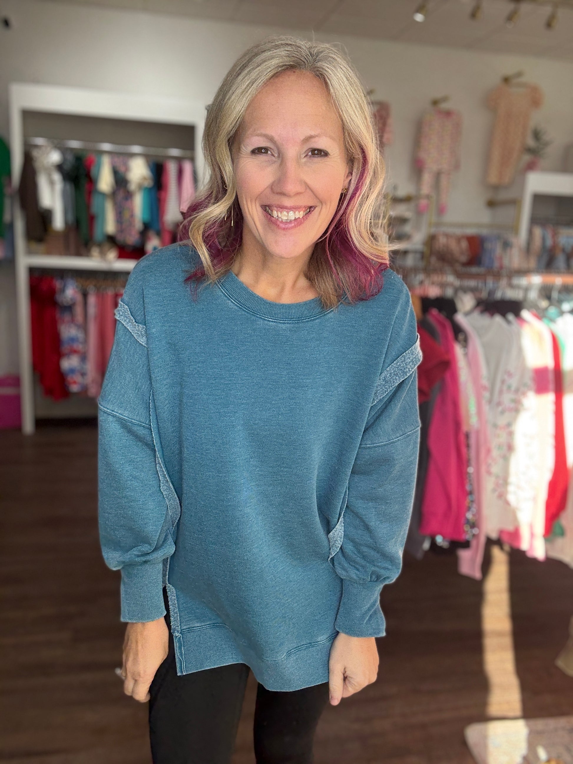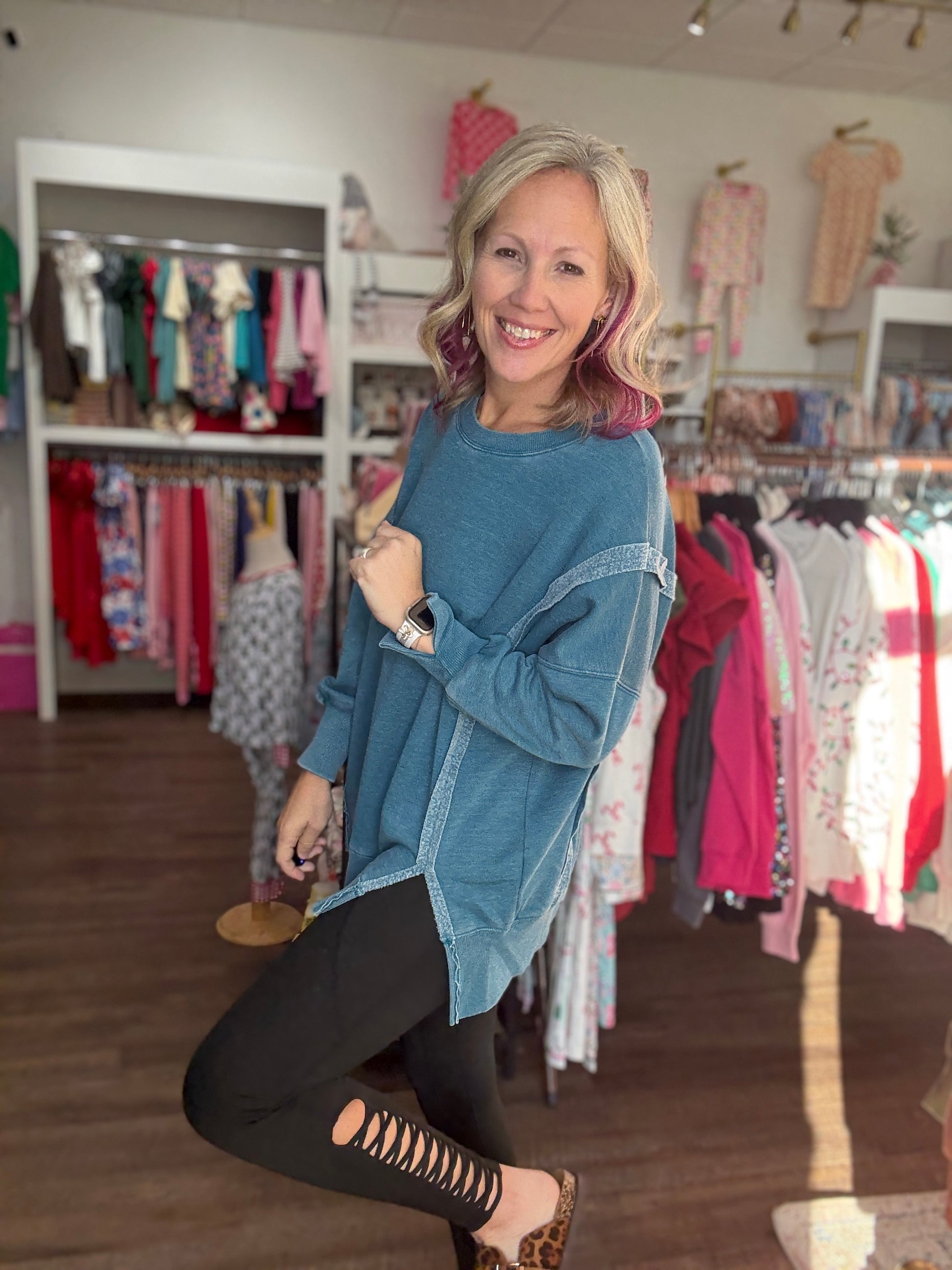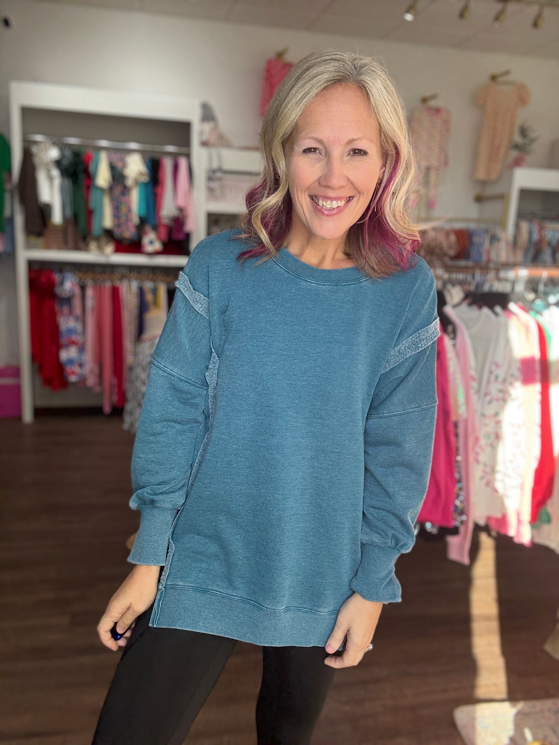 We spared no attention to detail in our new mineral washed sweatshirt! This forever timeless pullover is a slouchy, relaxed fit with exposed seaming, cute split cuff hem and ribbed trim detail! Has super soft "sweatshirt" feel on the inside! Fit: Oversized, slouchy fit Features: Dropped shoulders, scoop neckline, exposed seaming, split cuff detail