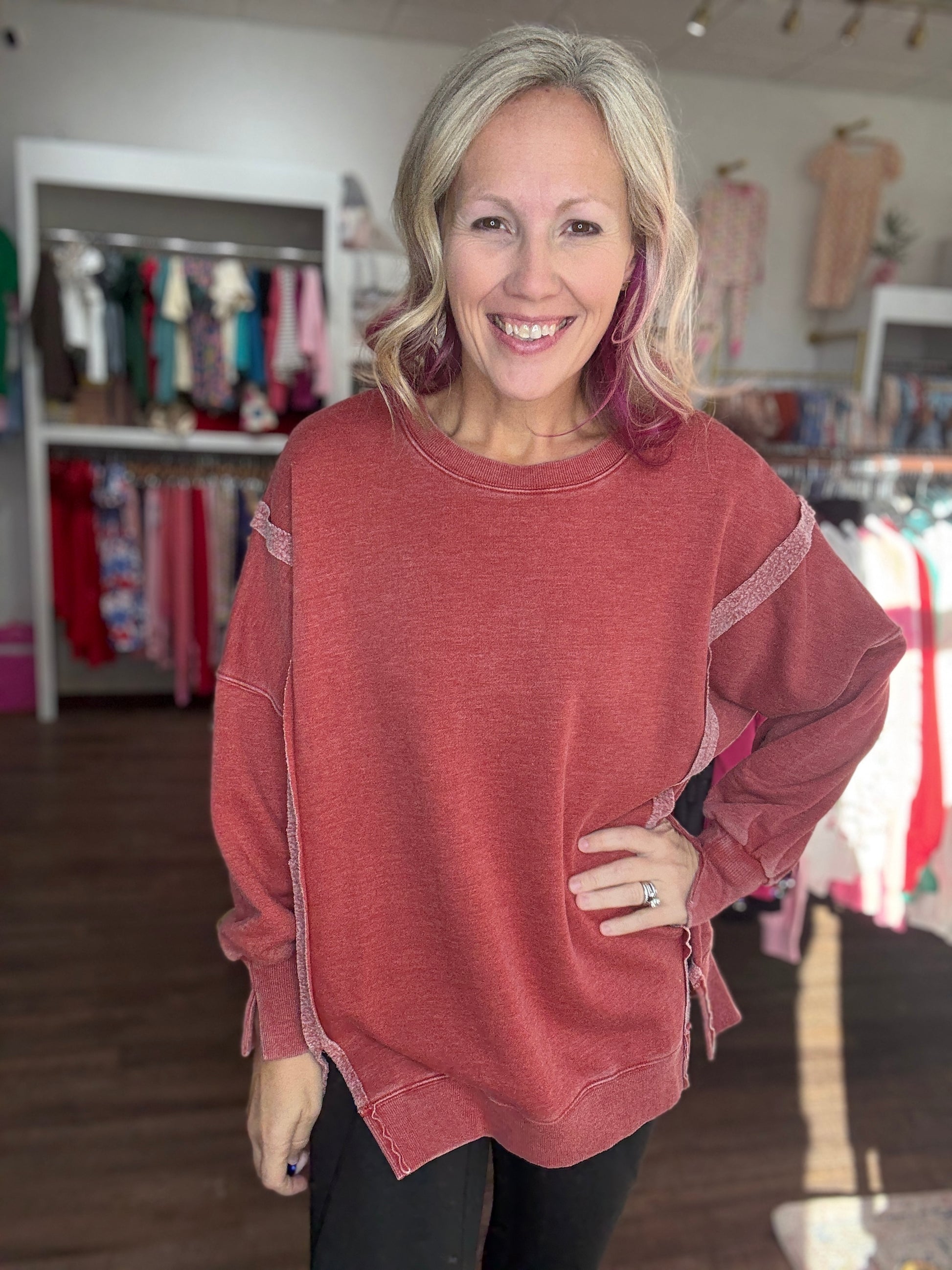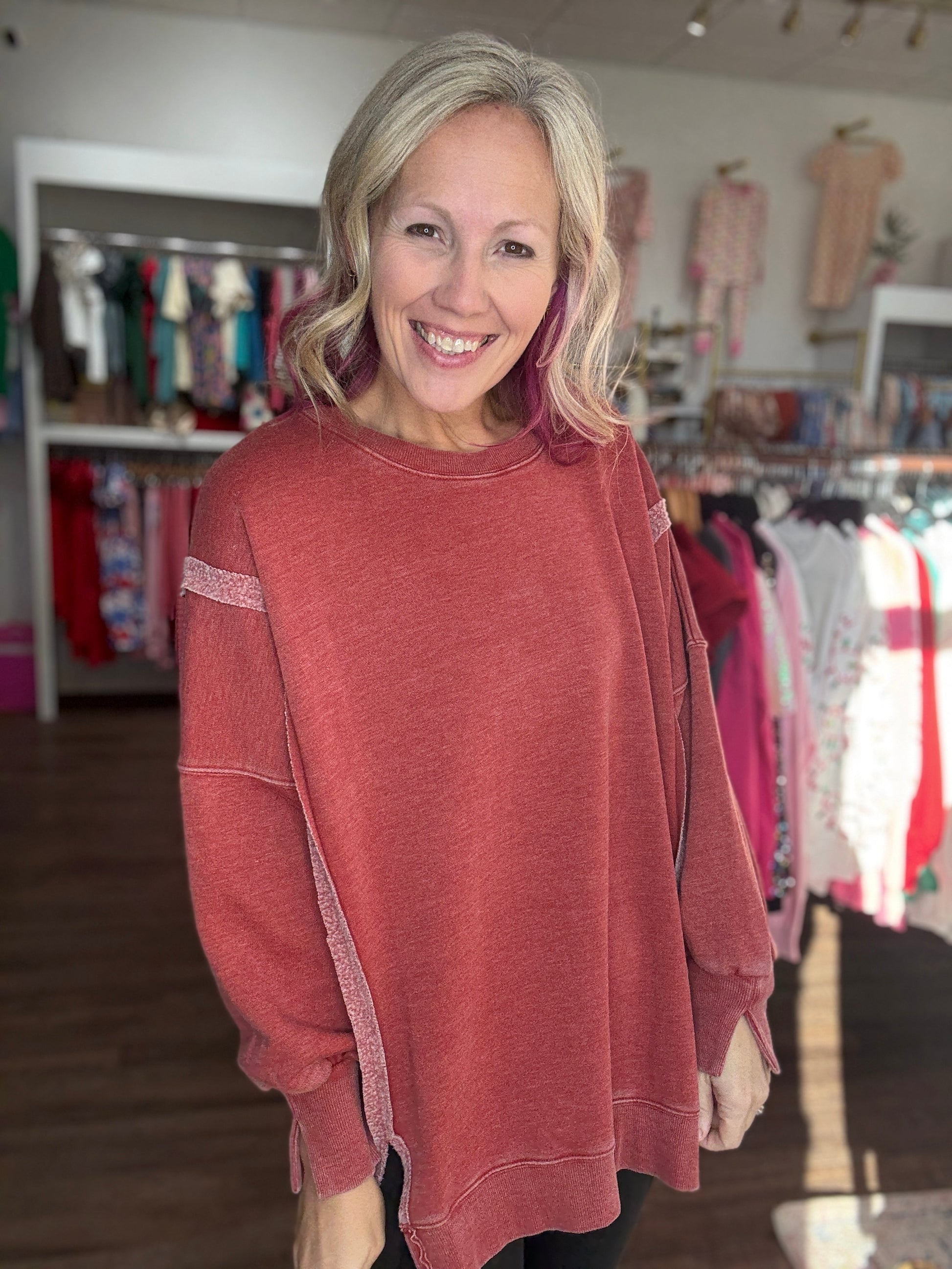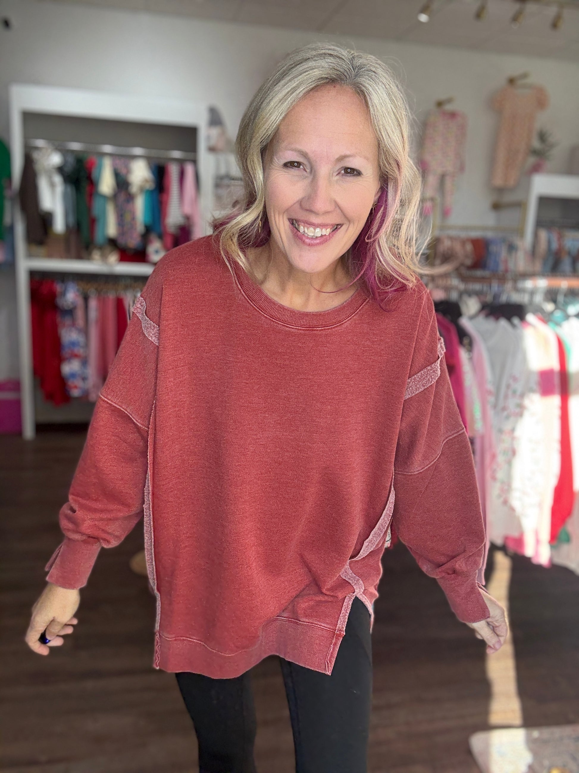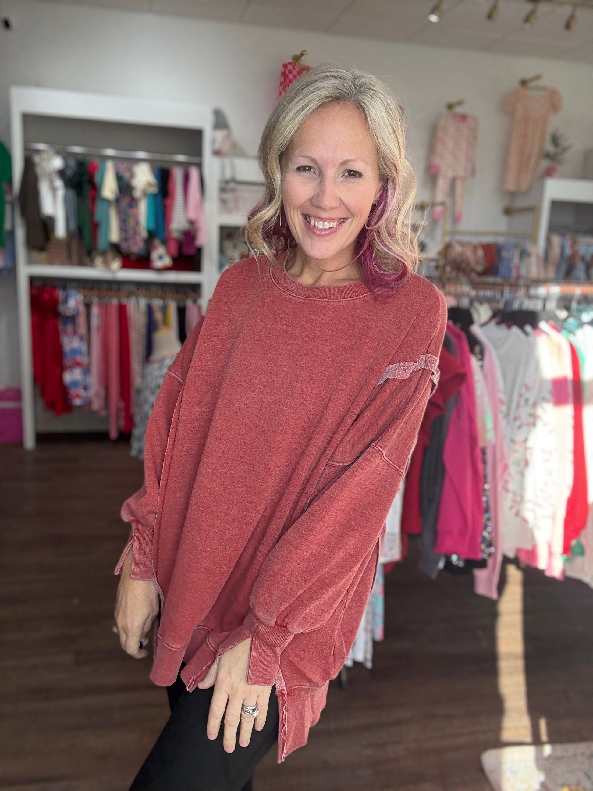 We spared no attention to detail in our new mineral washed sweatshirt! This forever timeless pullover is a slouchy, relaxed fit with exposed seaming, cute split cuff hem and ribbed trim detail! Has super soft "sweatshirt" feel on the inside! Fit: Oversized, slouchy fit Features: Dropped shoulders, scoop neckline, exposed seaming, split cuff detail