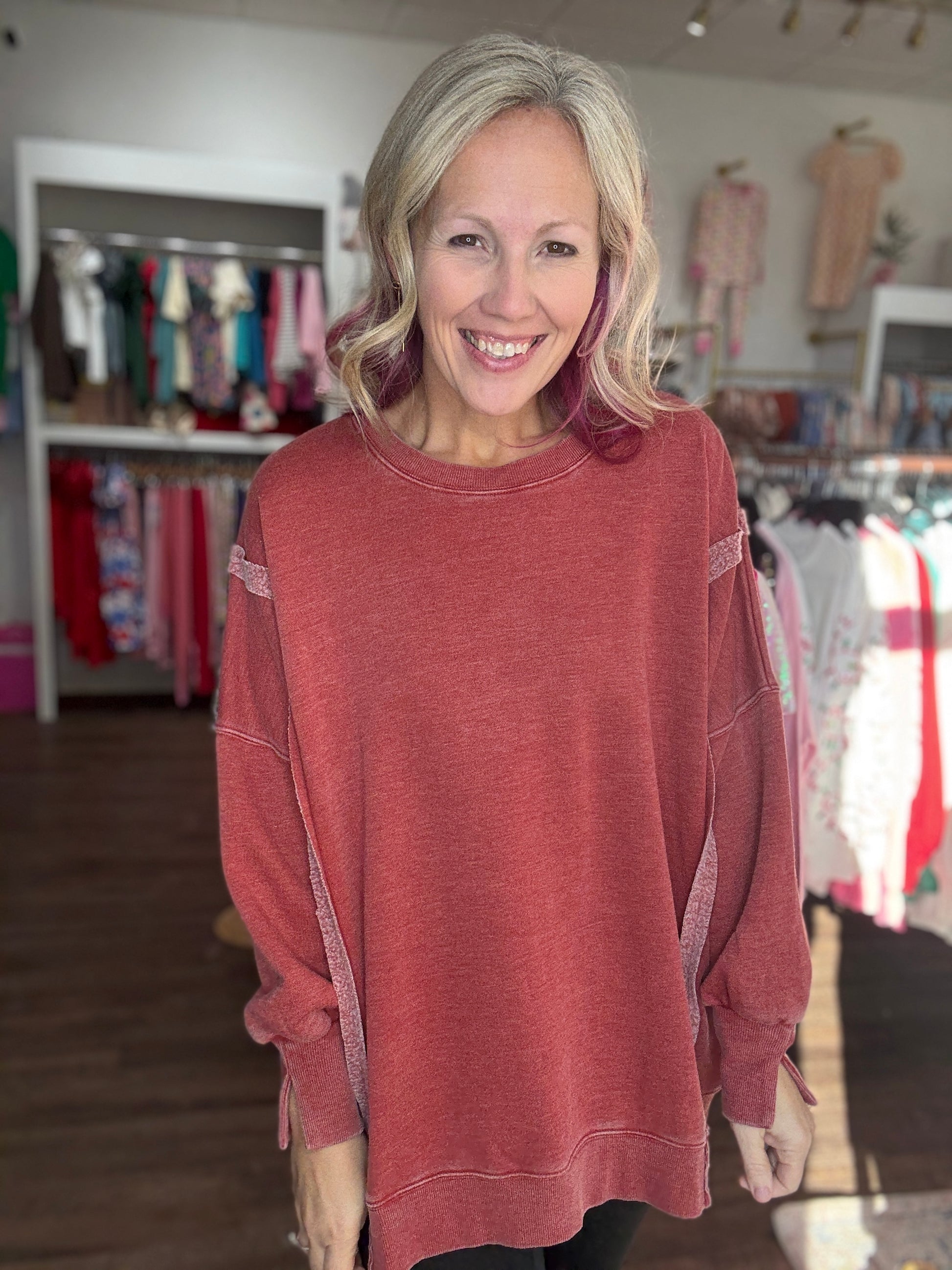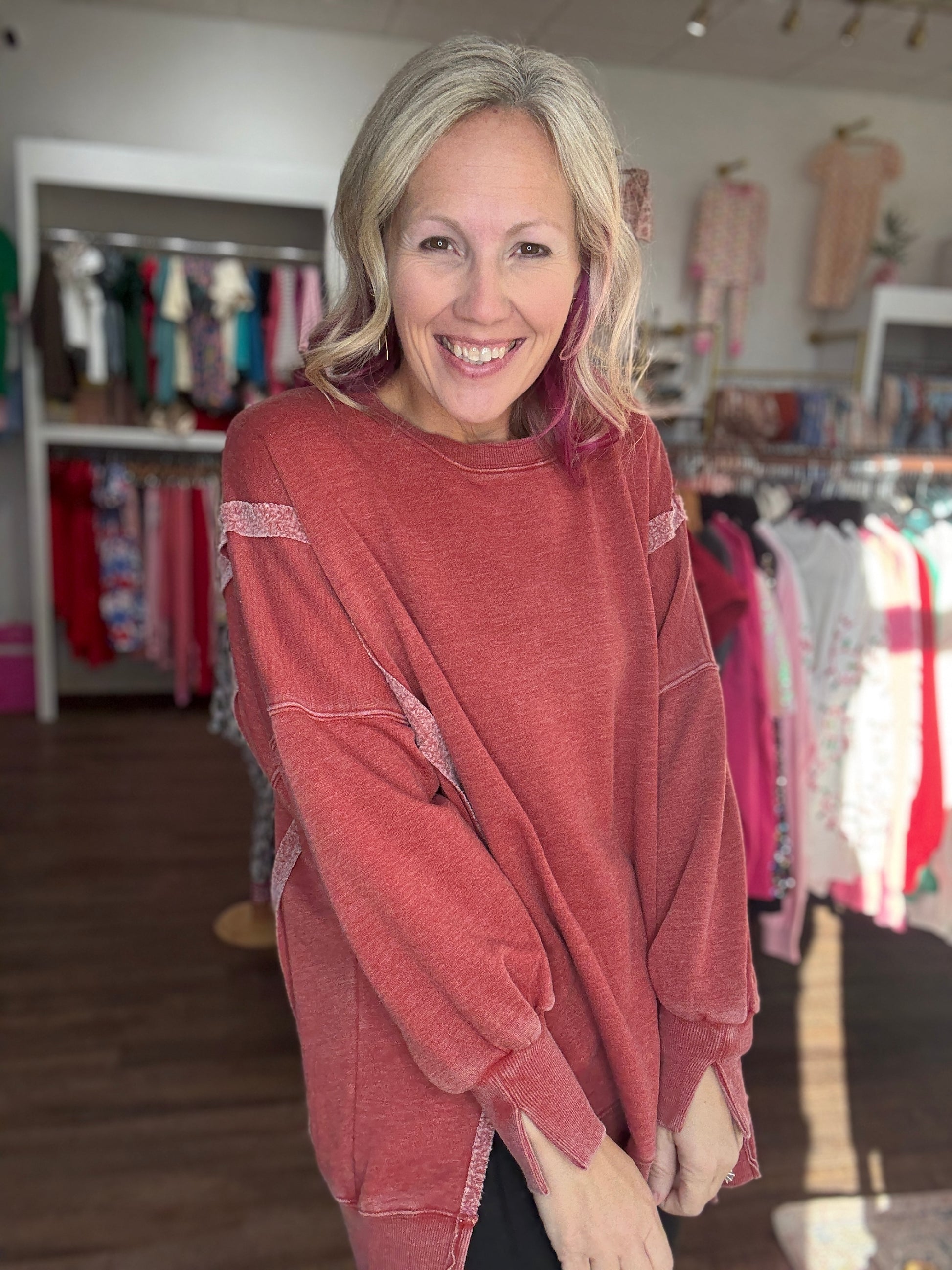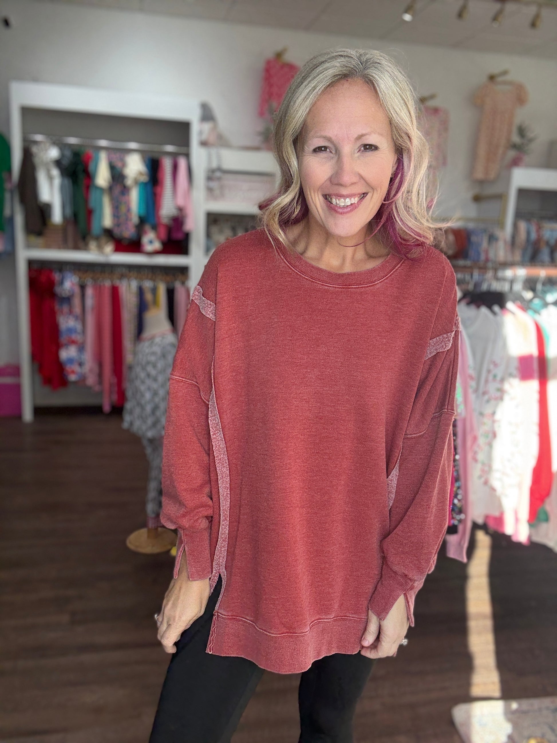 We spared no attention to detail in our new mineral washed sweatshirt! This forever timeless pullover is a slouchy, relaxed fit with exposed seaming, cute split cuff hem and ribbed trim detail! Has super soft "sweatshirt" feel on the inside! Fit: Oversized, slouchy fit Features: Dropped shoulders, scoop neckline, exposed seaming, split cuff detail