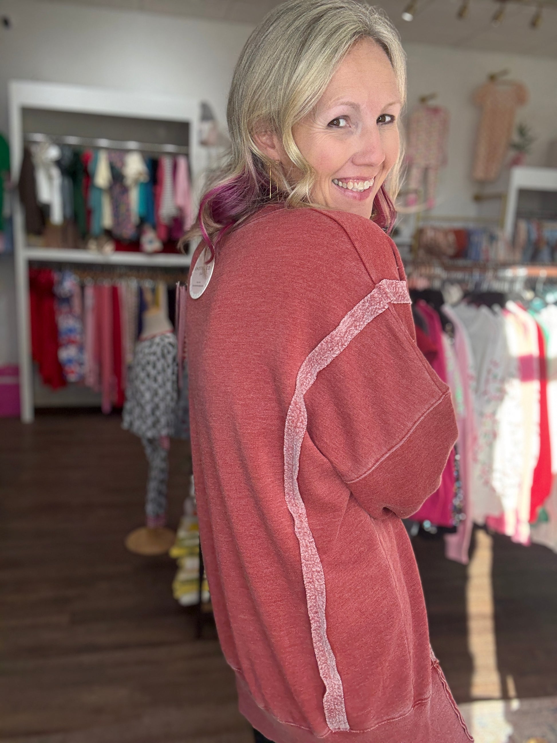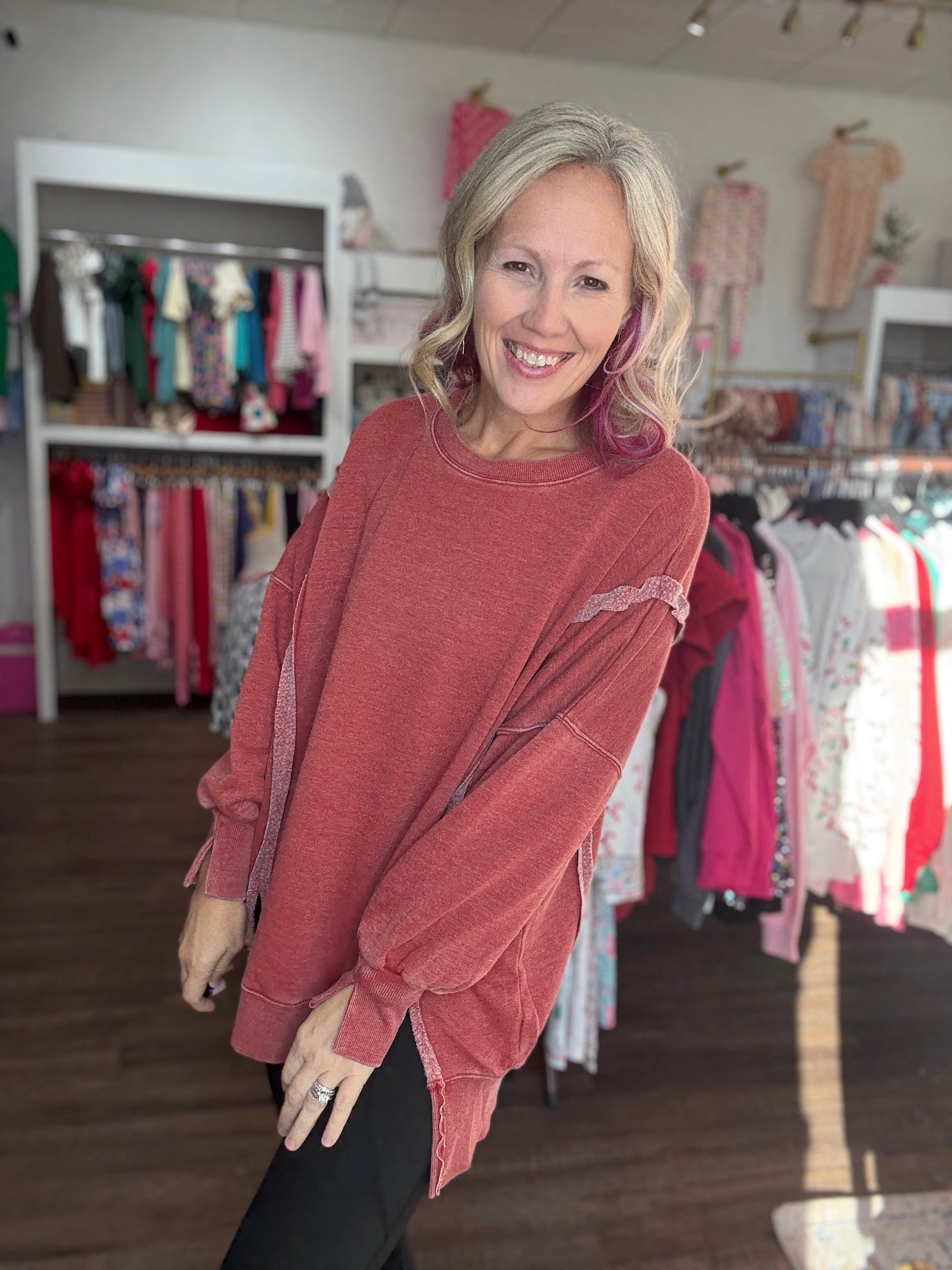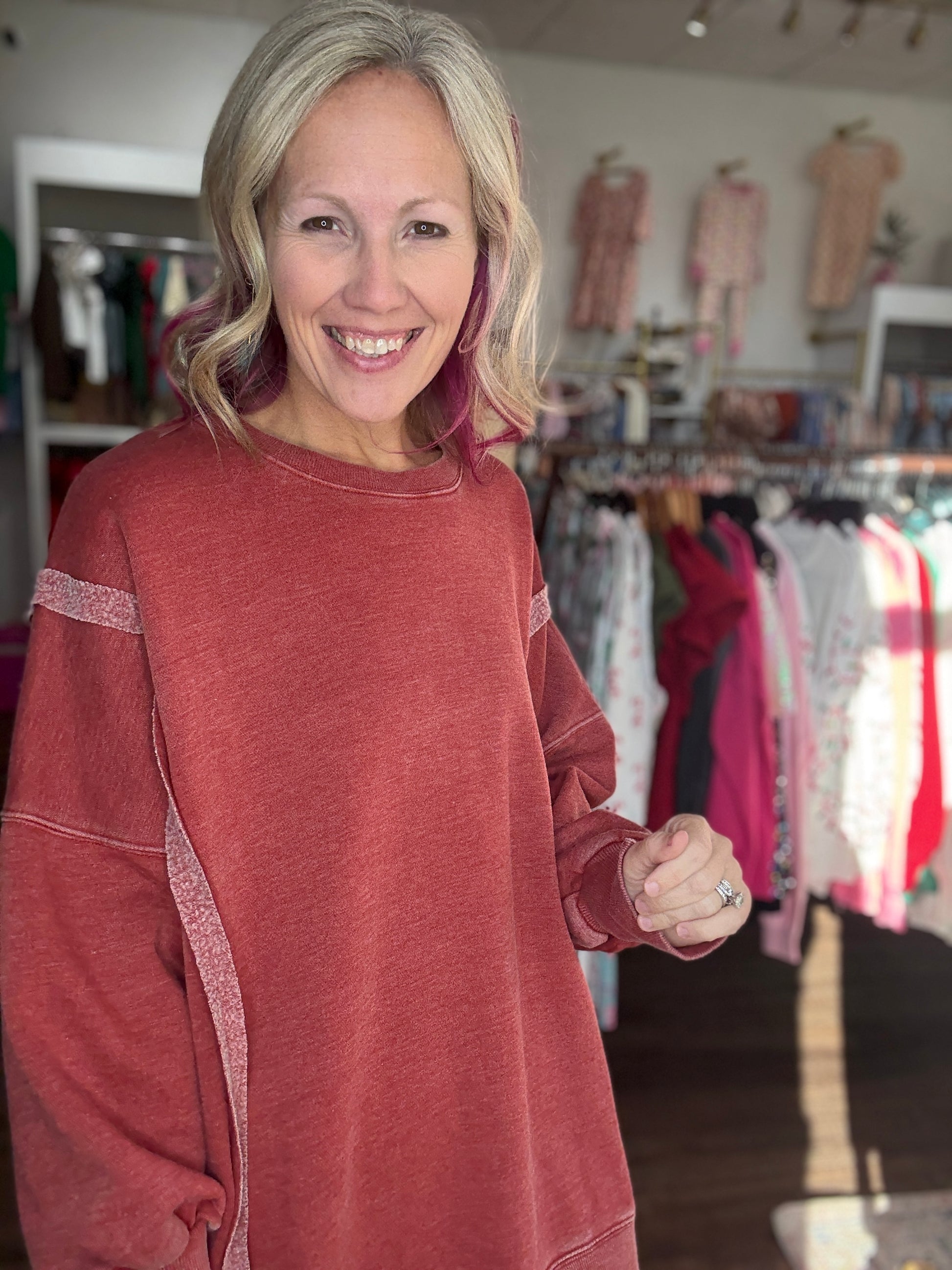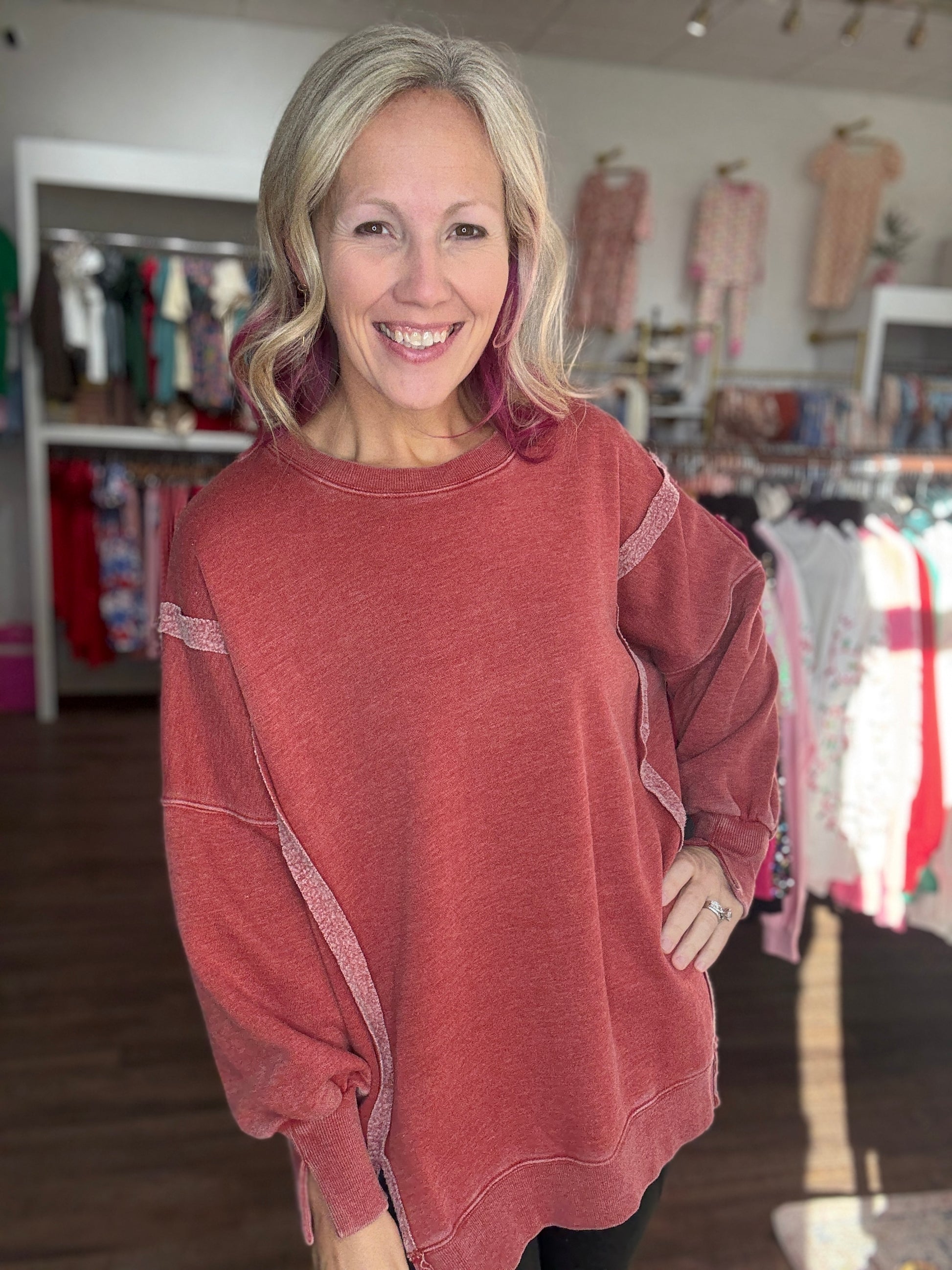 We spared no attention to detail in our new mineral washed sweatshirt! This forever timeless pullover is a slouchy, relaxed fit with exposed seaming, cute split cuff hem and ribbed trim detail! Has super soft "sweatshirt" feel on the inside! Fit: Oversized, slouchy fit Features: Dropped shoulders, scoop neckline, exposed seaming, split cuff detail