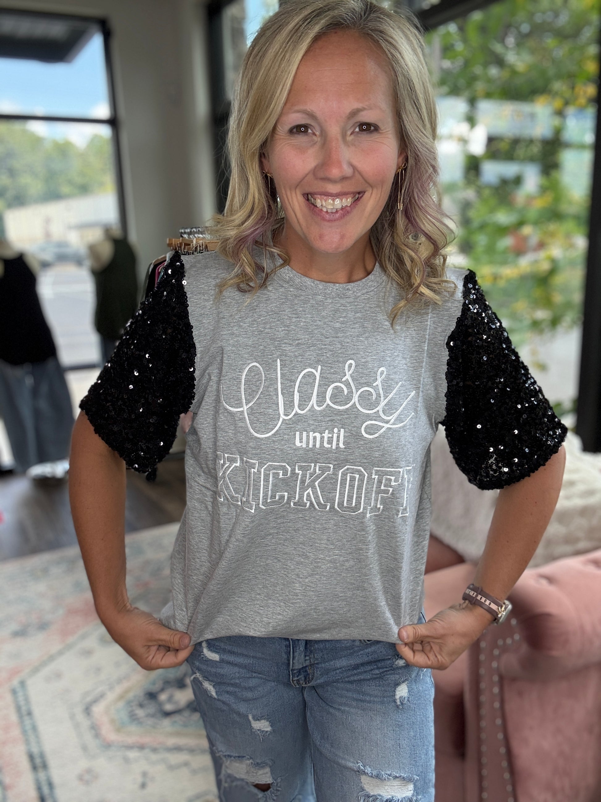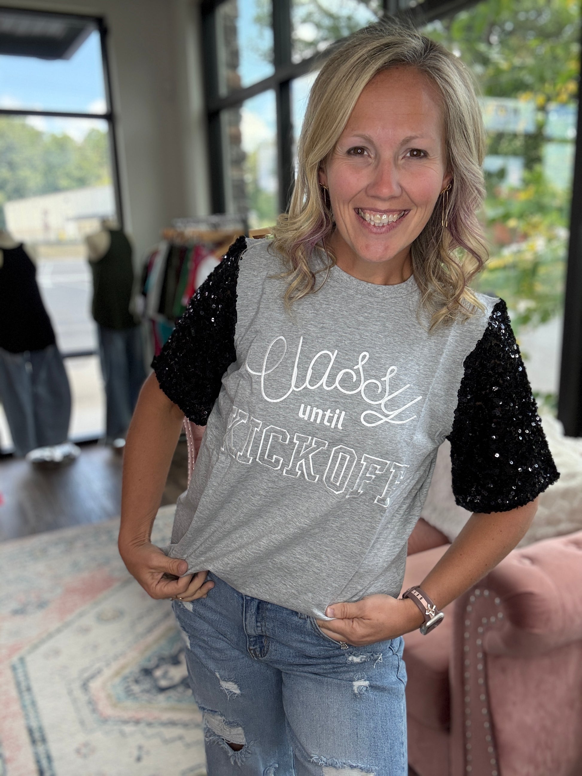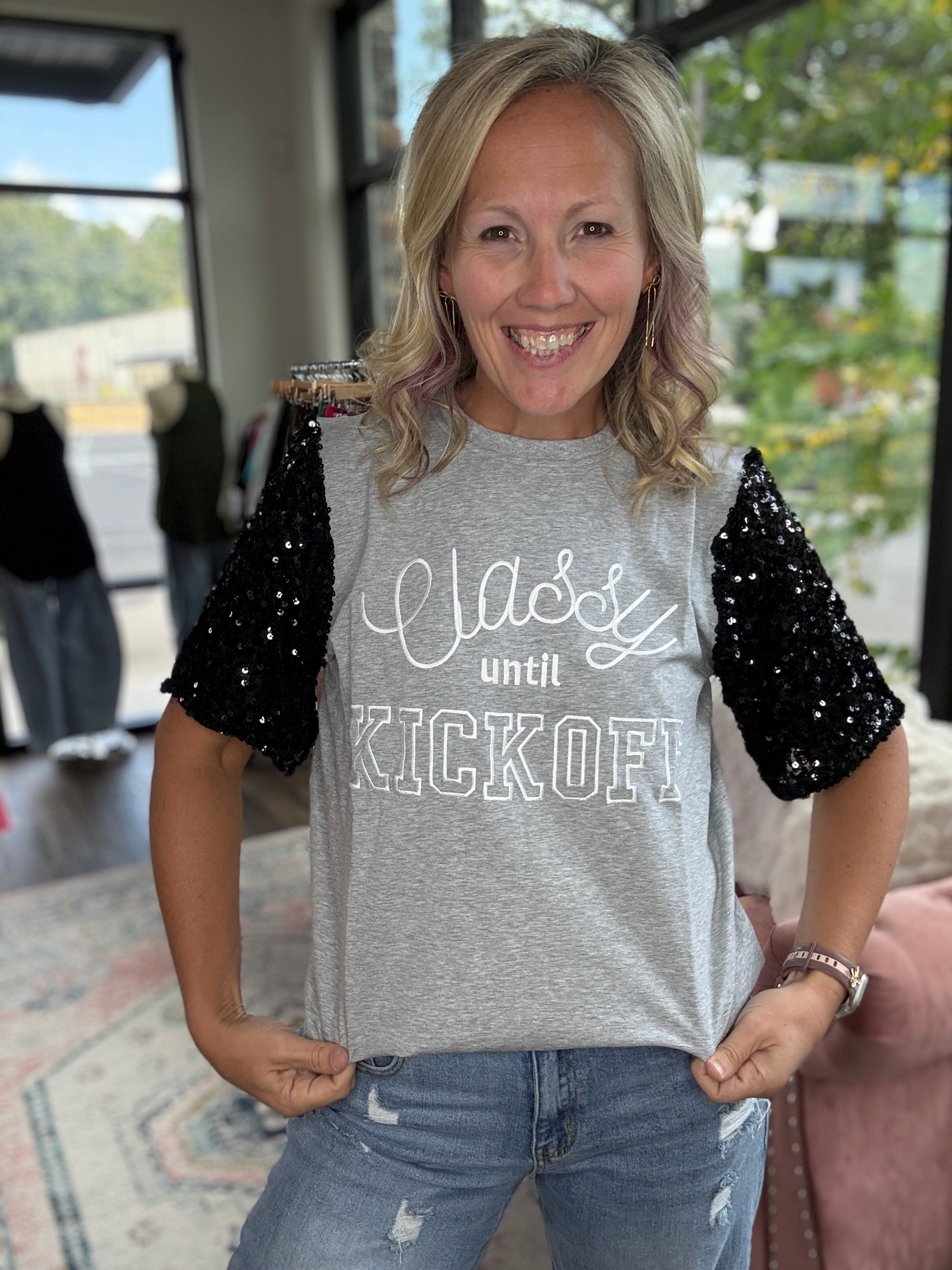 The cutest football tee with sparkly sleeves! Super soft sequins!
