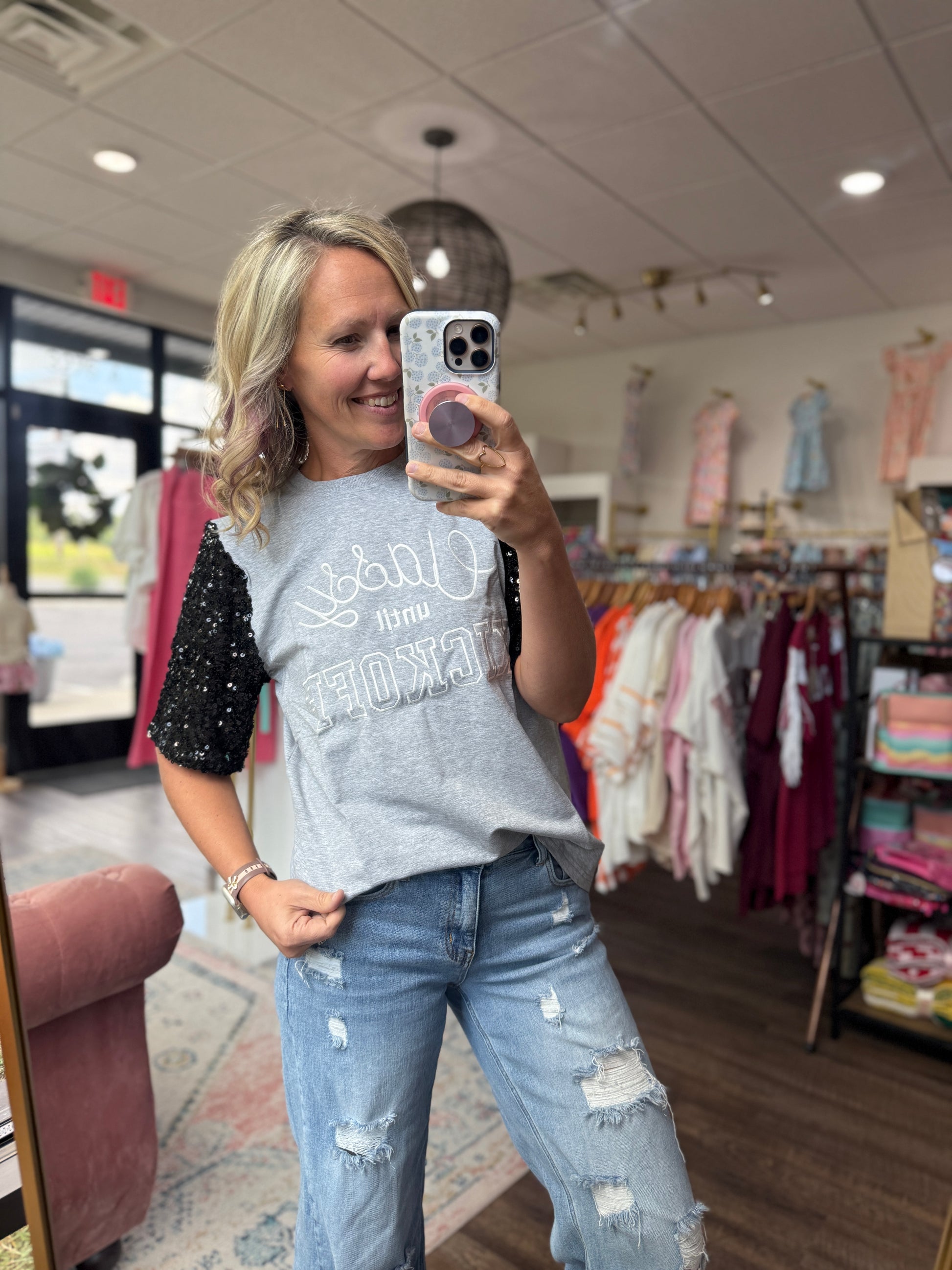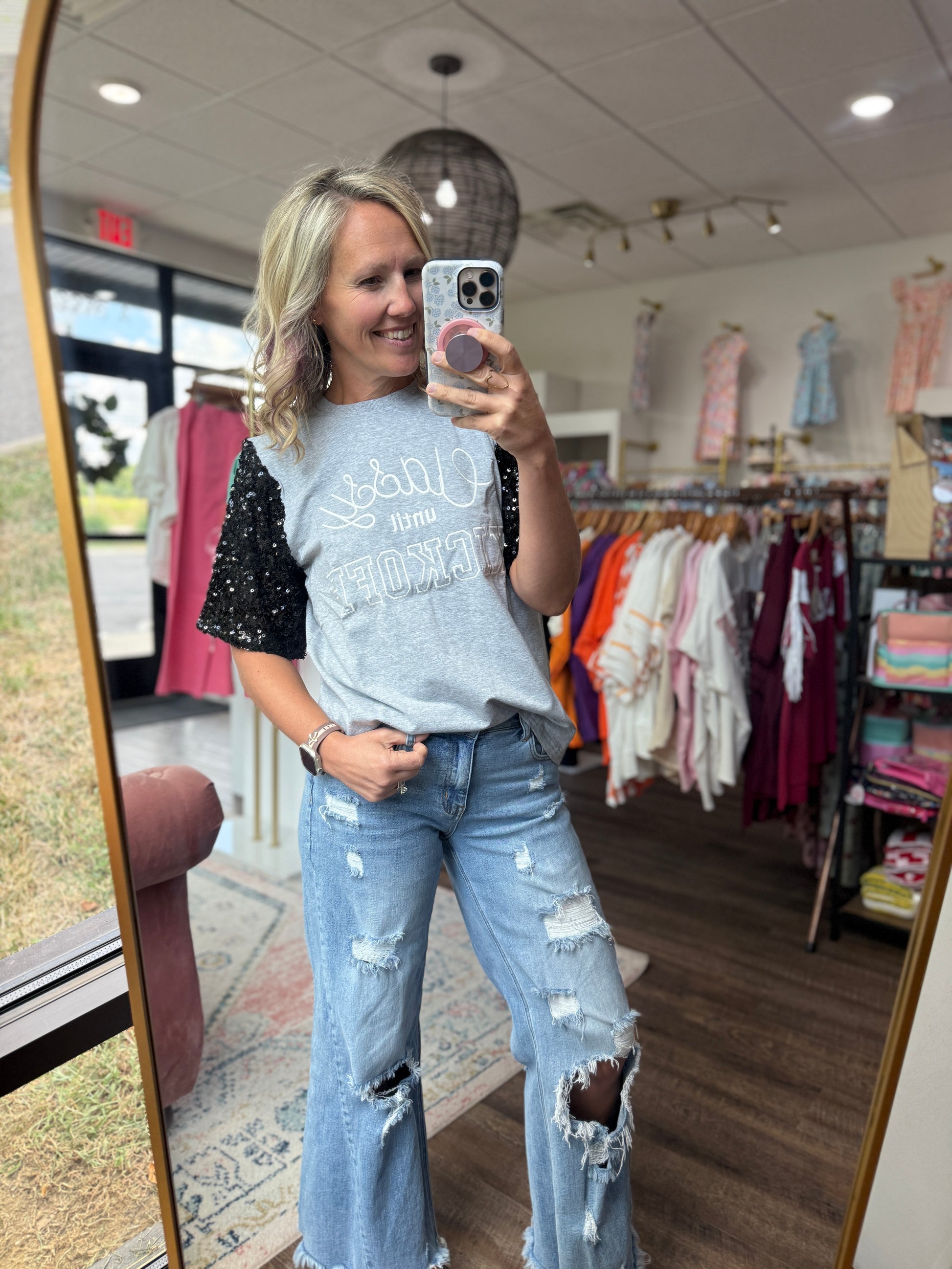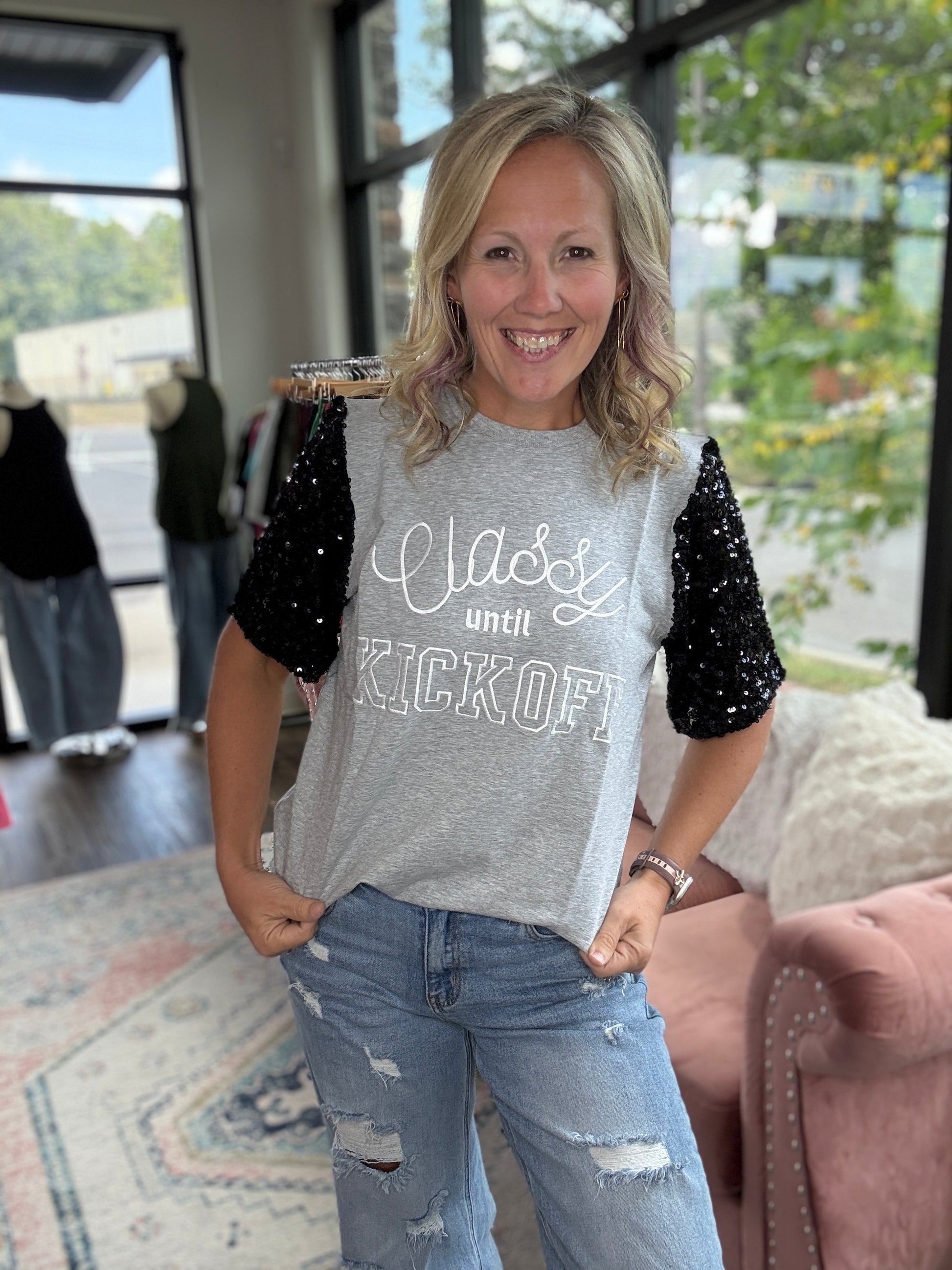 The cutest football tee with sparkly sleeves! Super soft sequins!