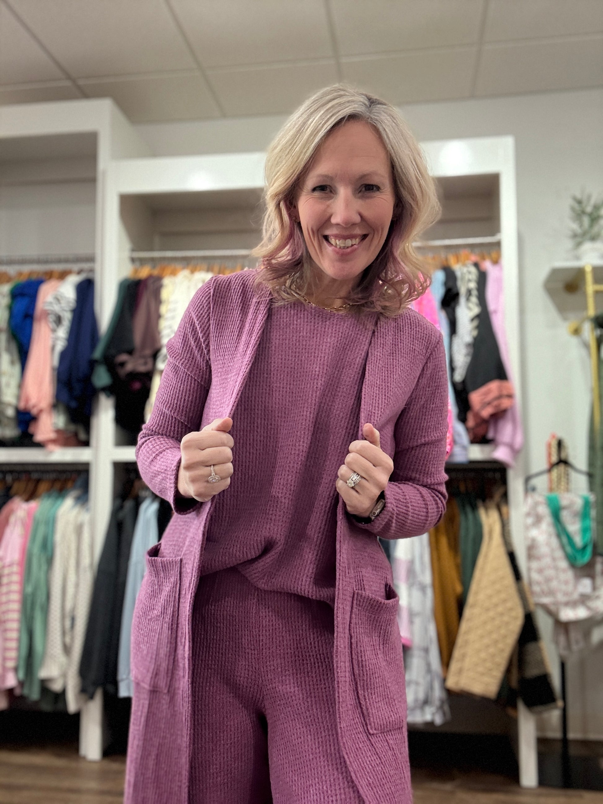 The Cozy Trio Thermal Set is the three-piece outfit that takes lounging to a new level of style. Made from a soft brushed thermal fabric, this set includes a sleeveless tank, a long relaxed cardigan, and matching easy-fit pants for a coordinated look that feels as good as it looks.