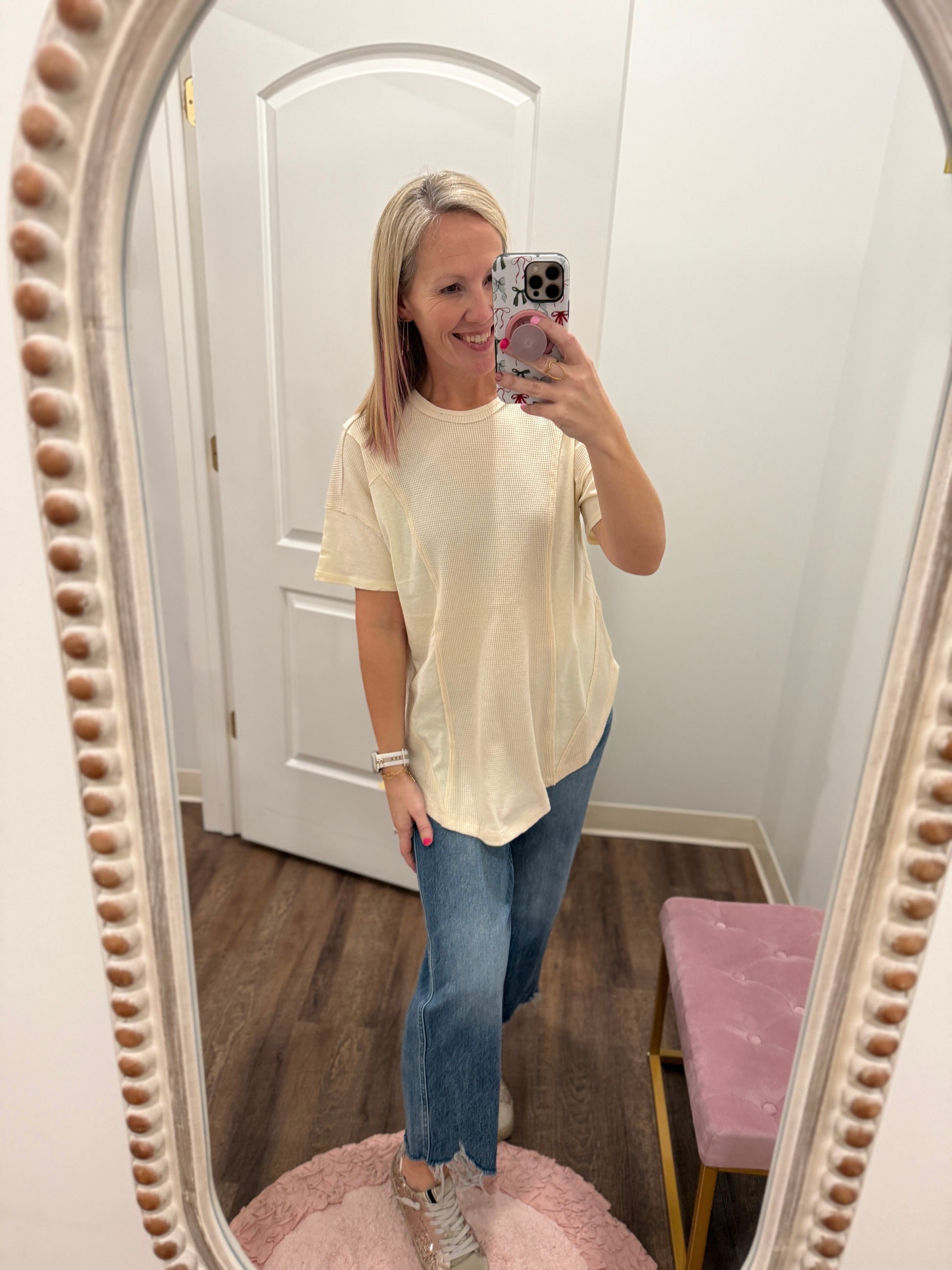 The Cream Block Cozy Tee is the easy, everyday knit you’ll reach for all season long. Crafted from a soft cream knit, this top features a classic crew neckline, short sleeves, and subtle color-block detailing that adds a modern touch. The raw seam accents and round side slits give it a relaxed, laid-back feel while the longer length makes it perfect for pairing with leggings or layering under cardigans and sweaters.