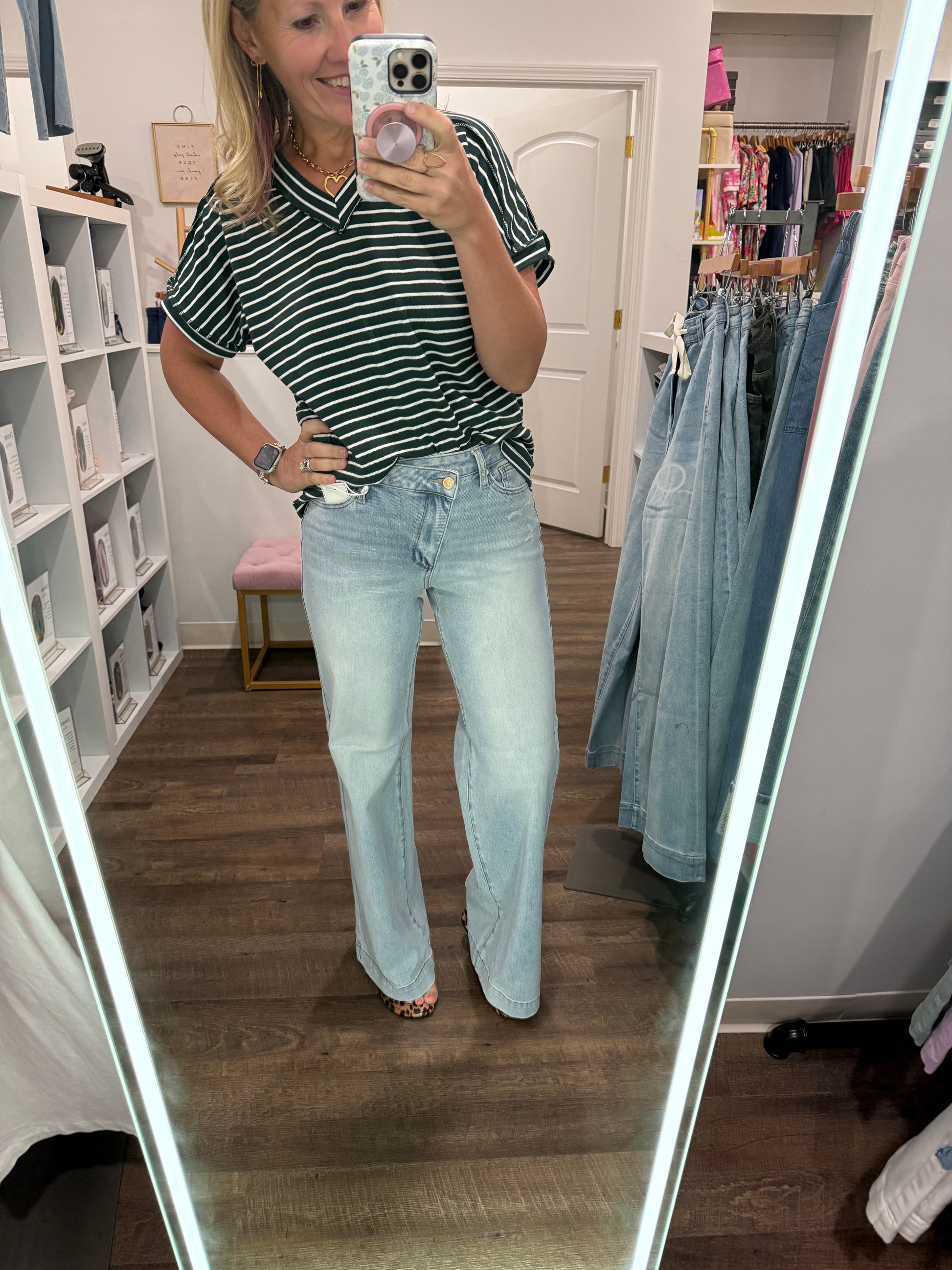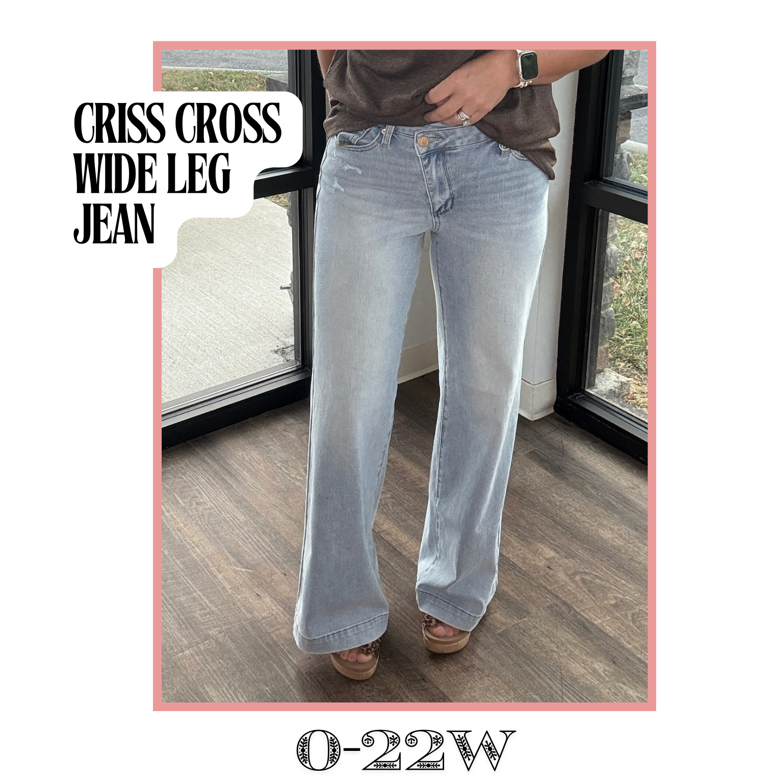 Classic meets modern in the Retro Cuff Criss-Cross Wide Leg Jeans by Judy Blue. This light wash beauty features a statement thick cuff and an eye-catching criss-cross button waistband that instantly elevates your denim game. The wide leg silhouette keeps things on-trend, while the no-hole design with just a touch of distressing near the pockets makes them perfect for both workdays and nights out.
