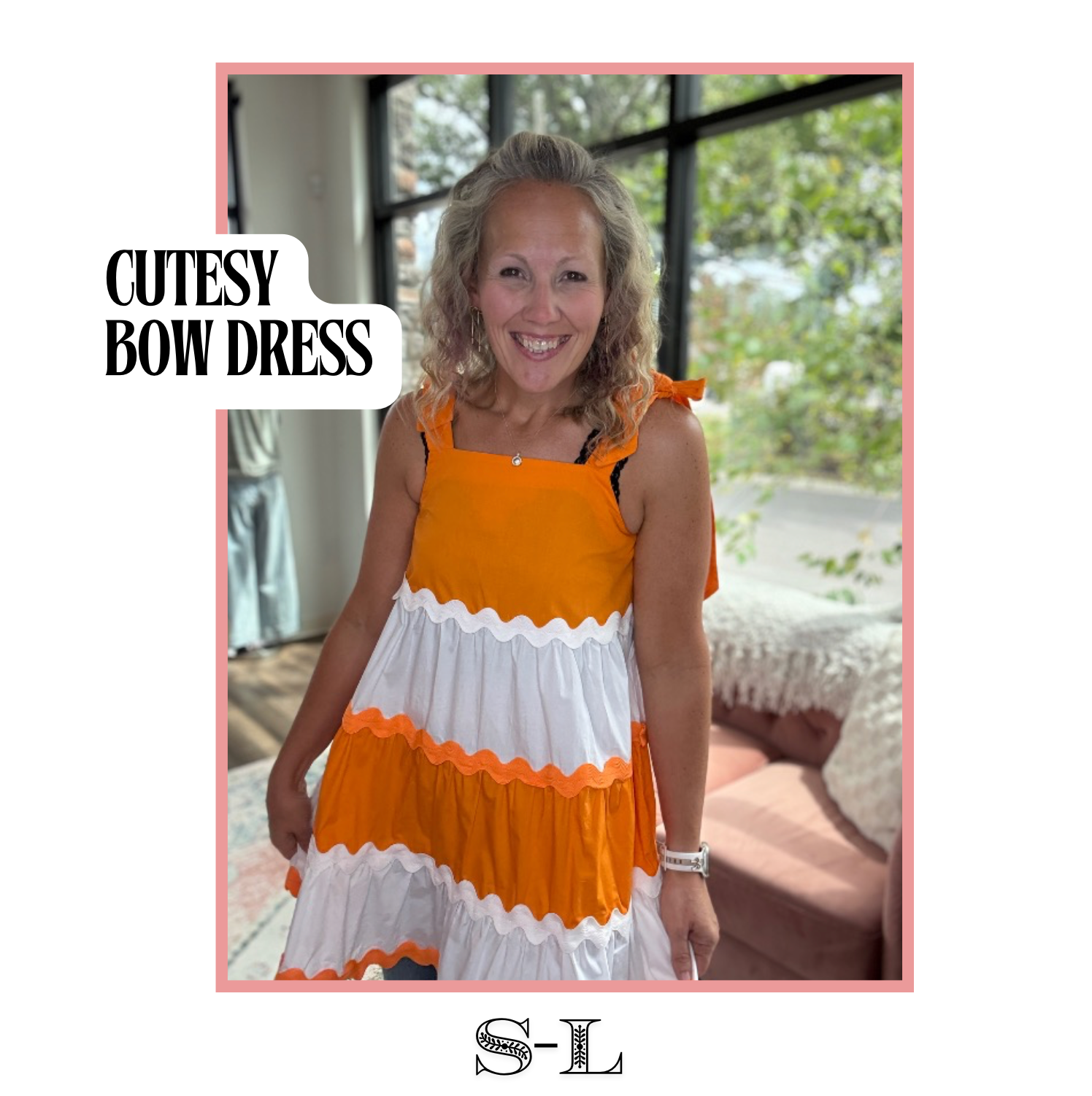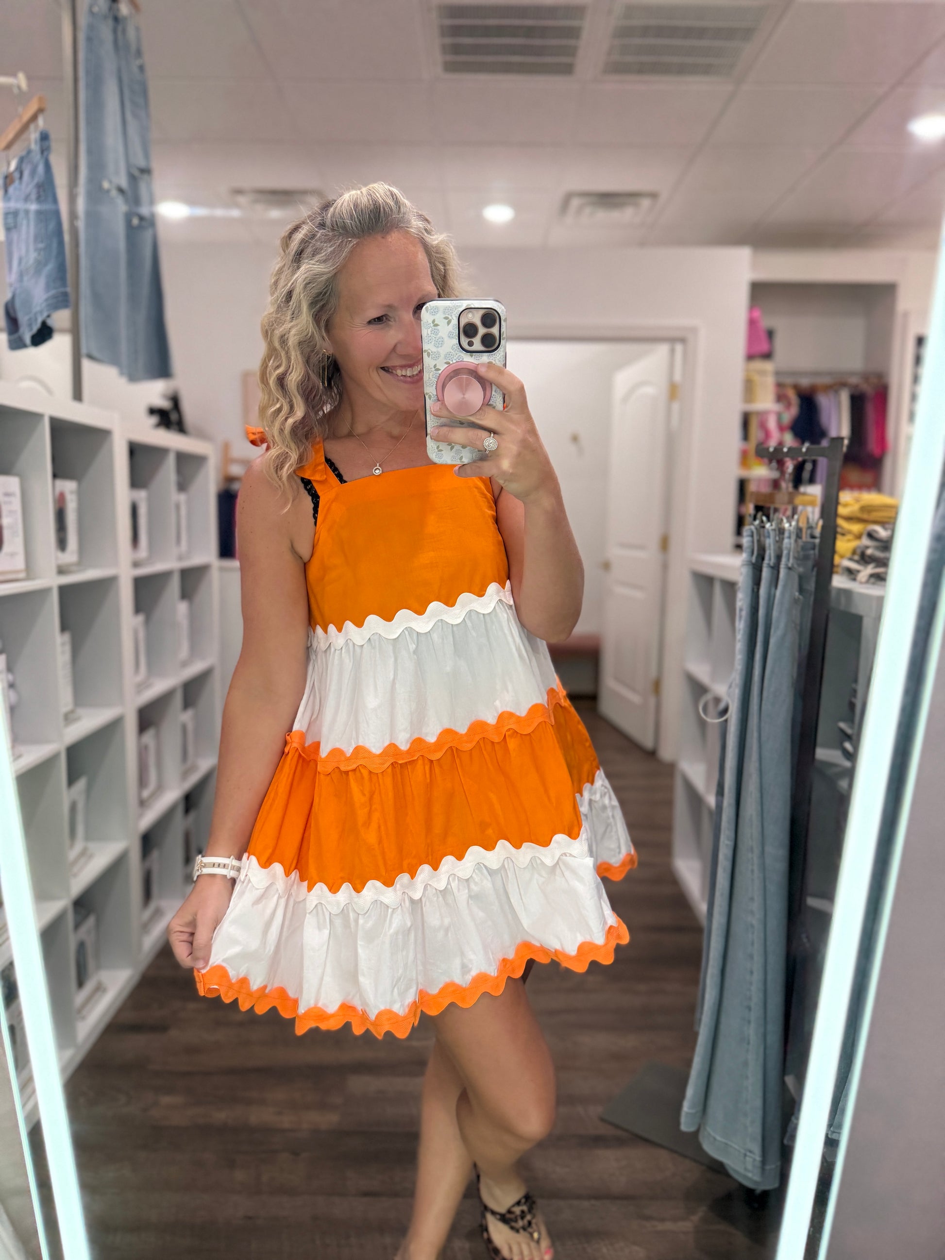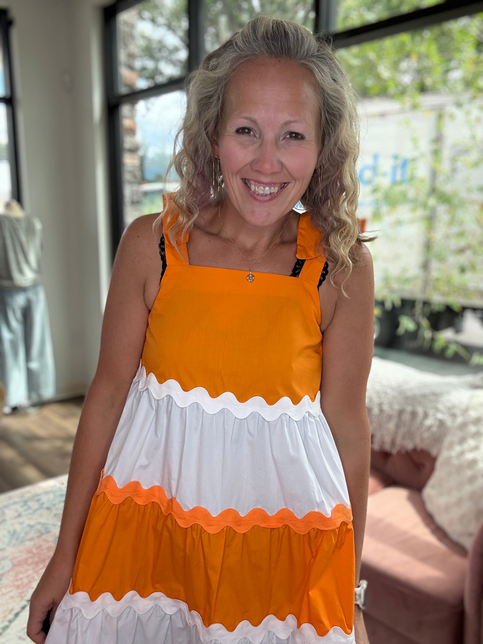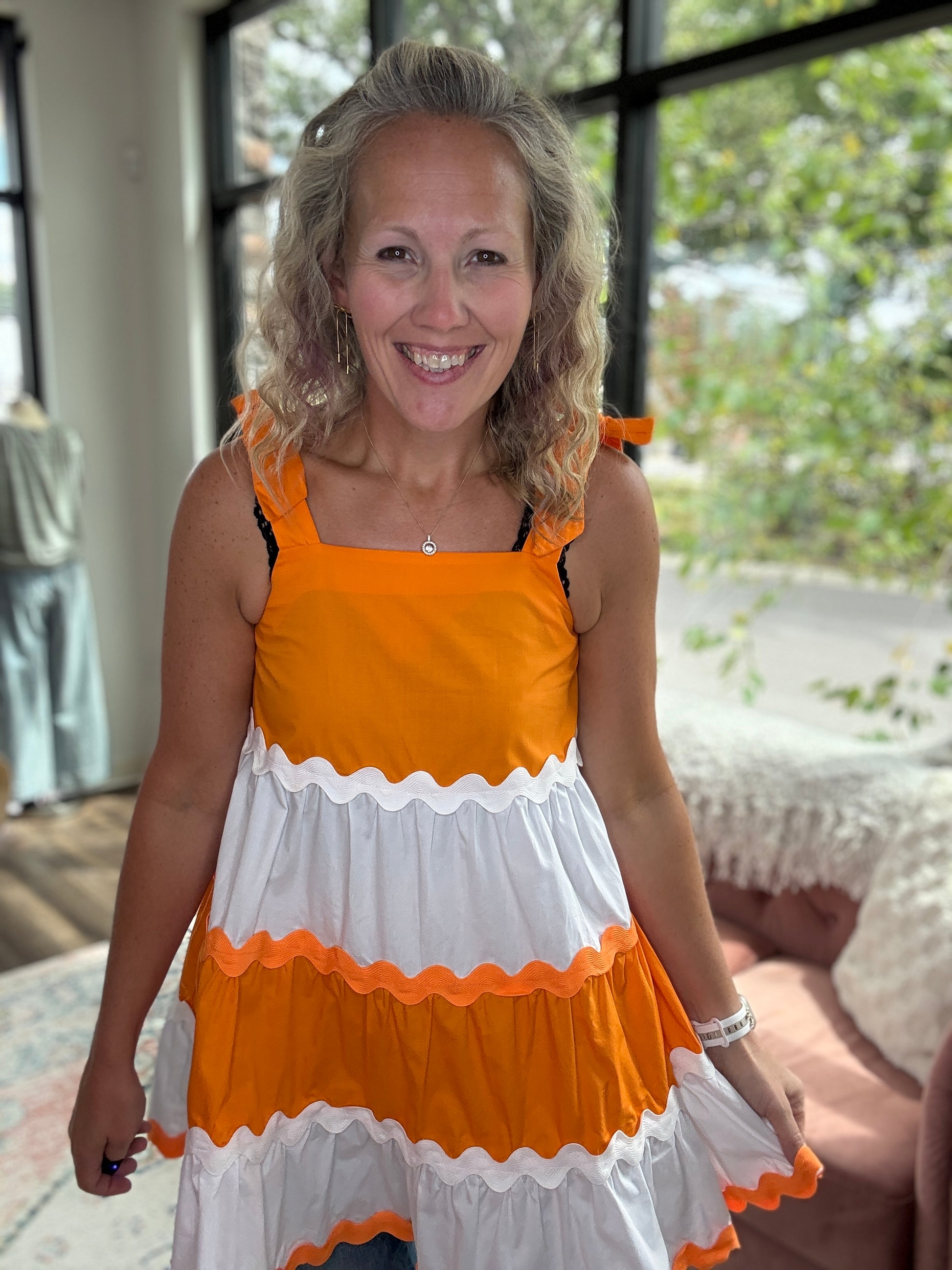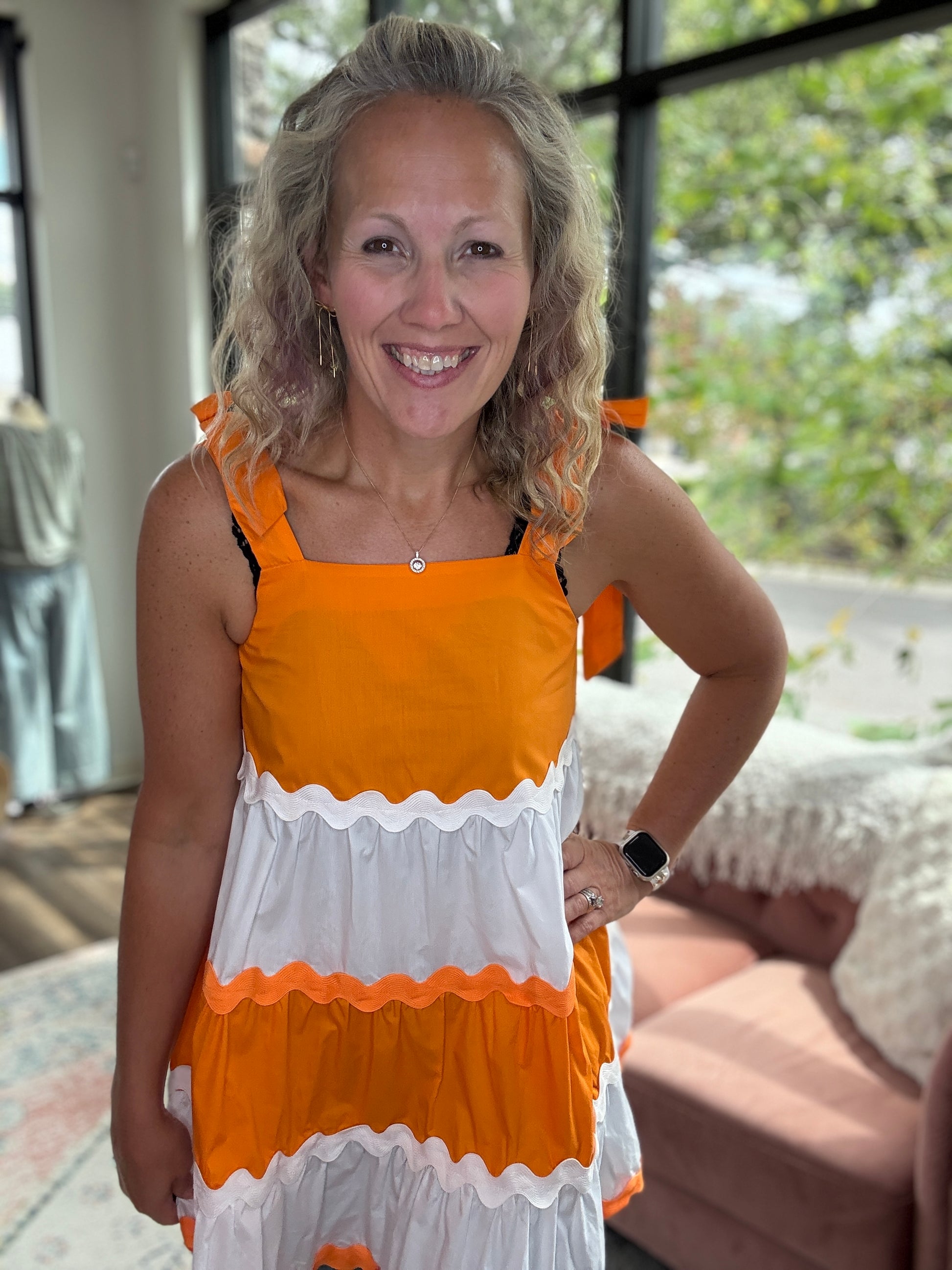 Get your Game Day festivities on with this cute bow dress. Orange and white with bow detail. Ric Rac trim to add to the fun details!