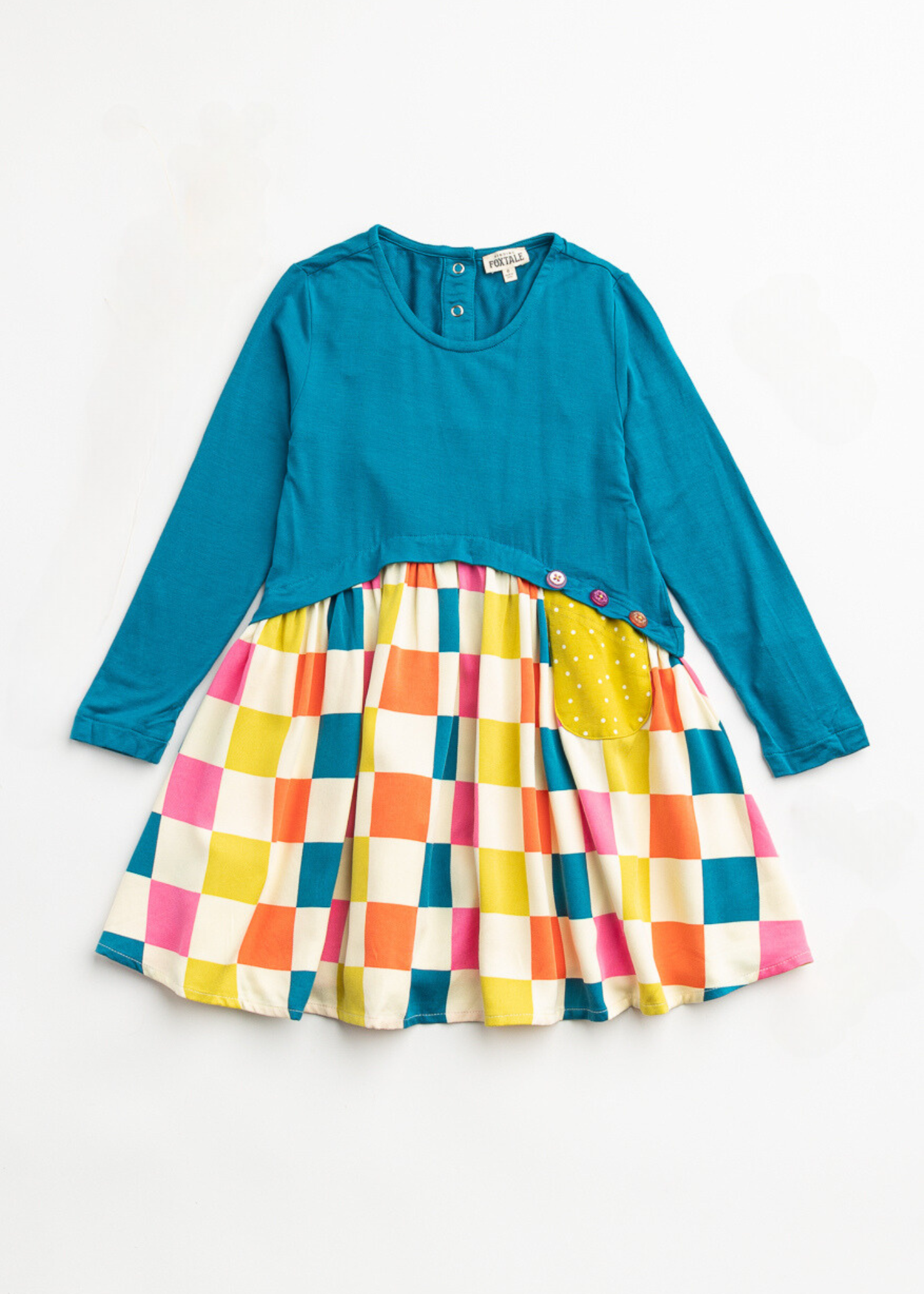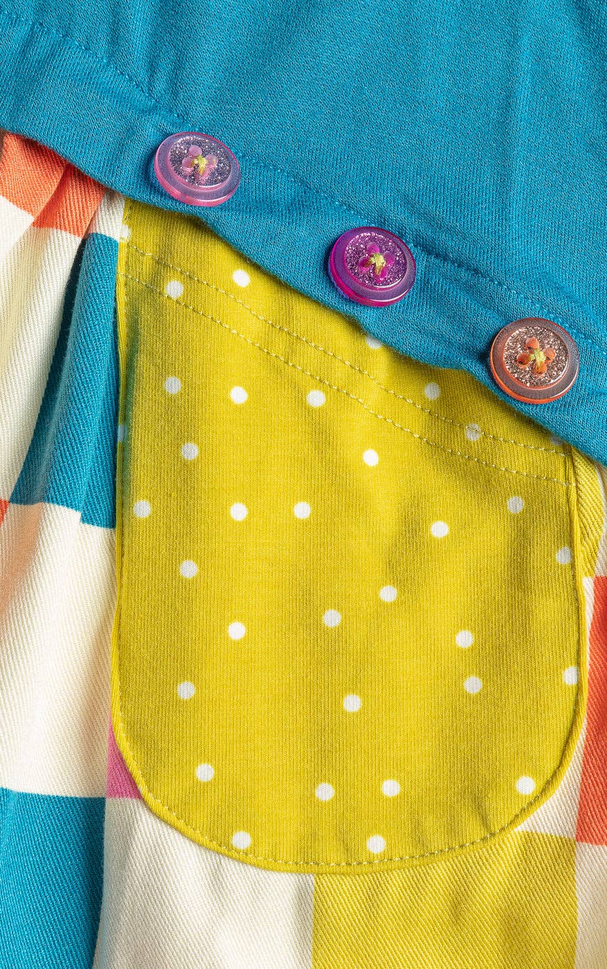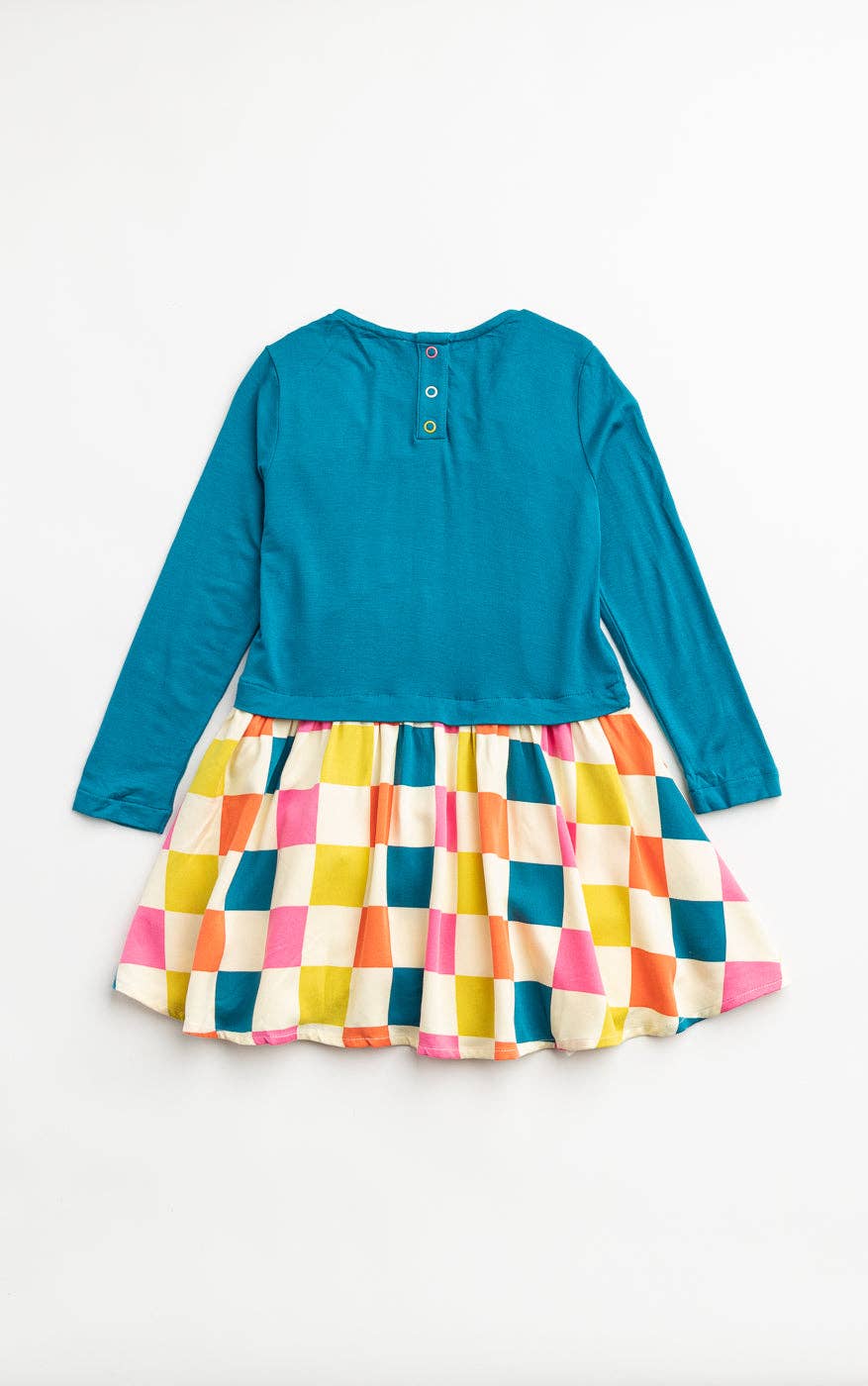 The time for cuteness and comfort has arrived in our colorfully mixed Celestial Blue and Rainbow Checker Print Dance Floor Dress. With a soft fleece-like bodice, sparkly buttons at the waist, a perfectly placed pocket, and a swingy rayon skirt, this style is ready to party and shouts, “Everybody dance now!”