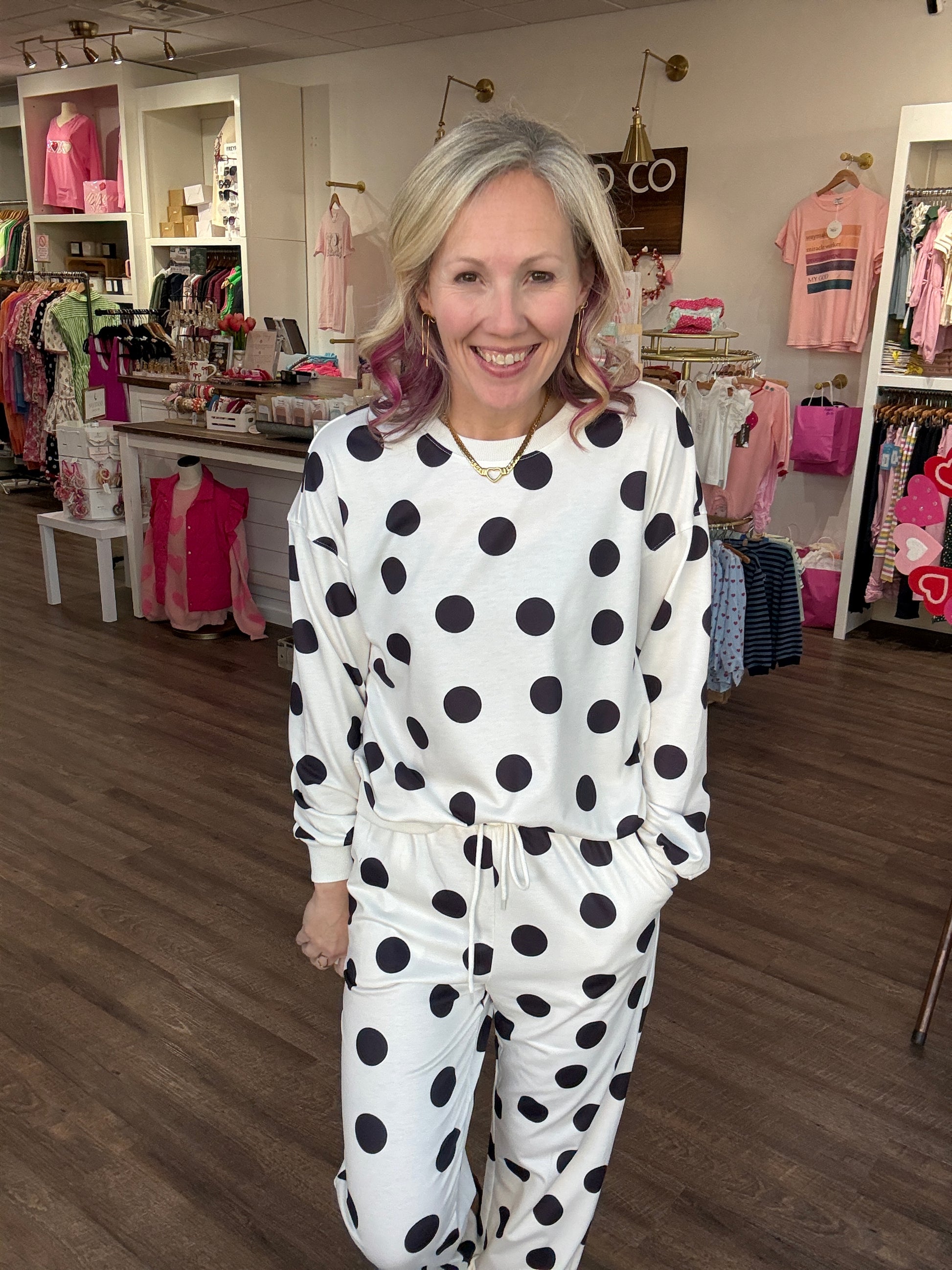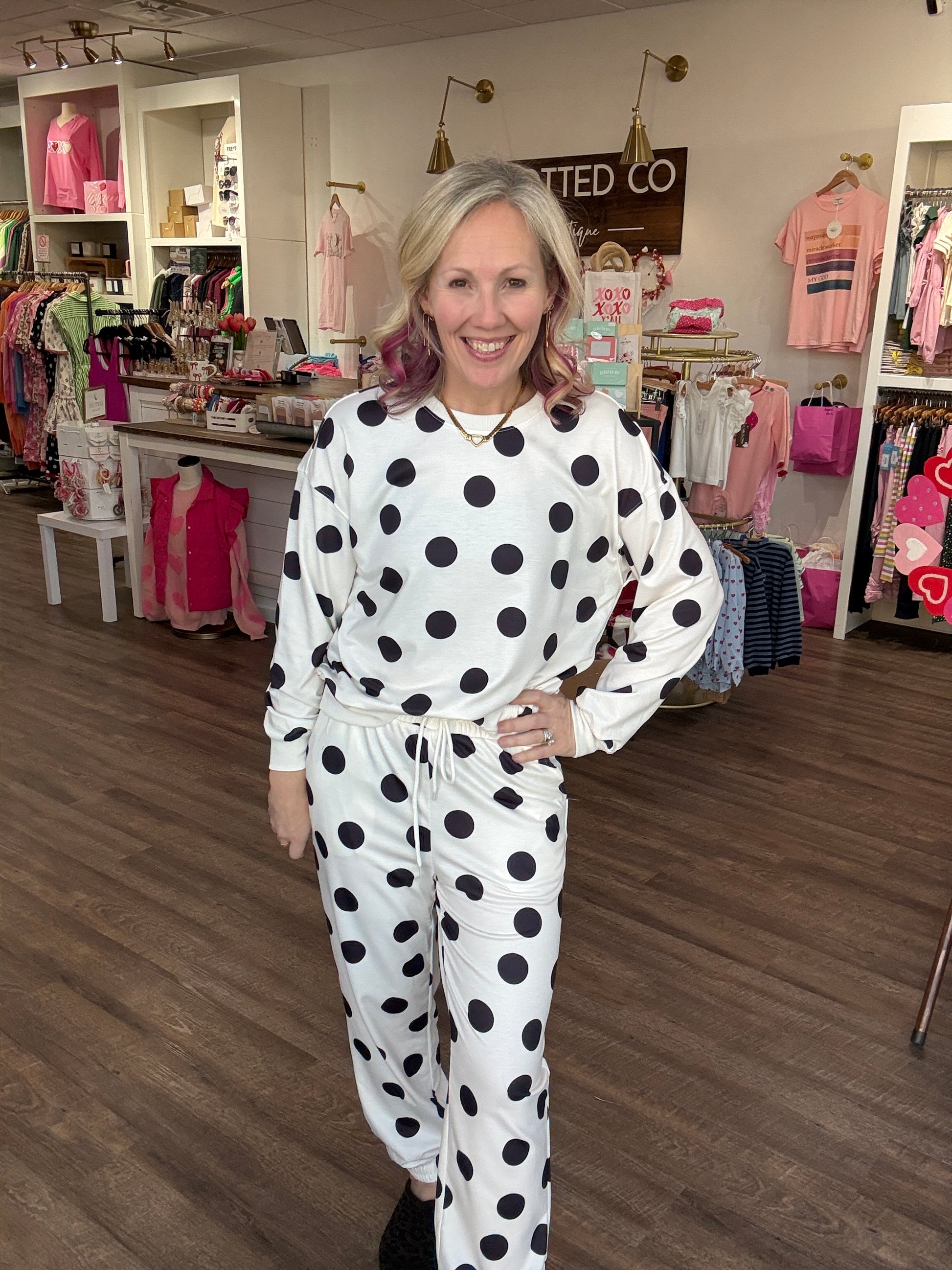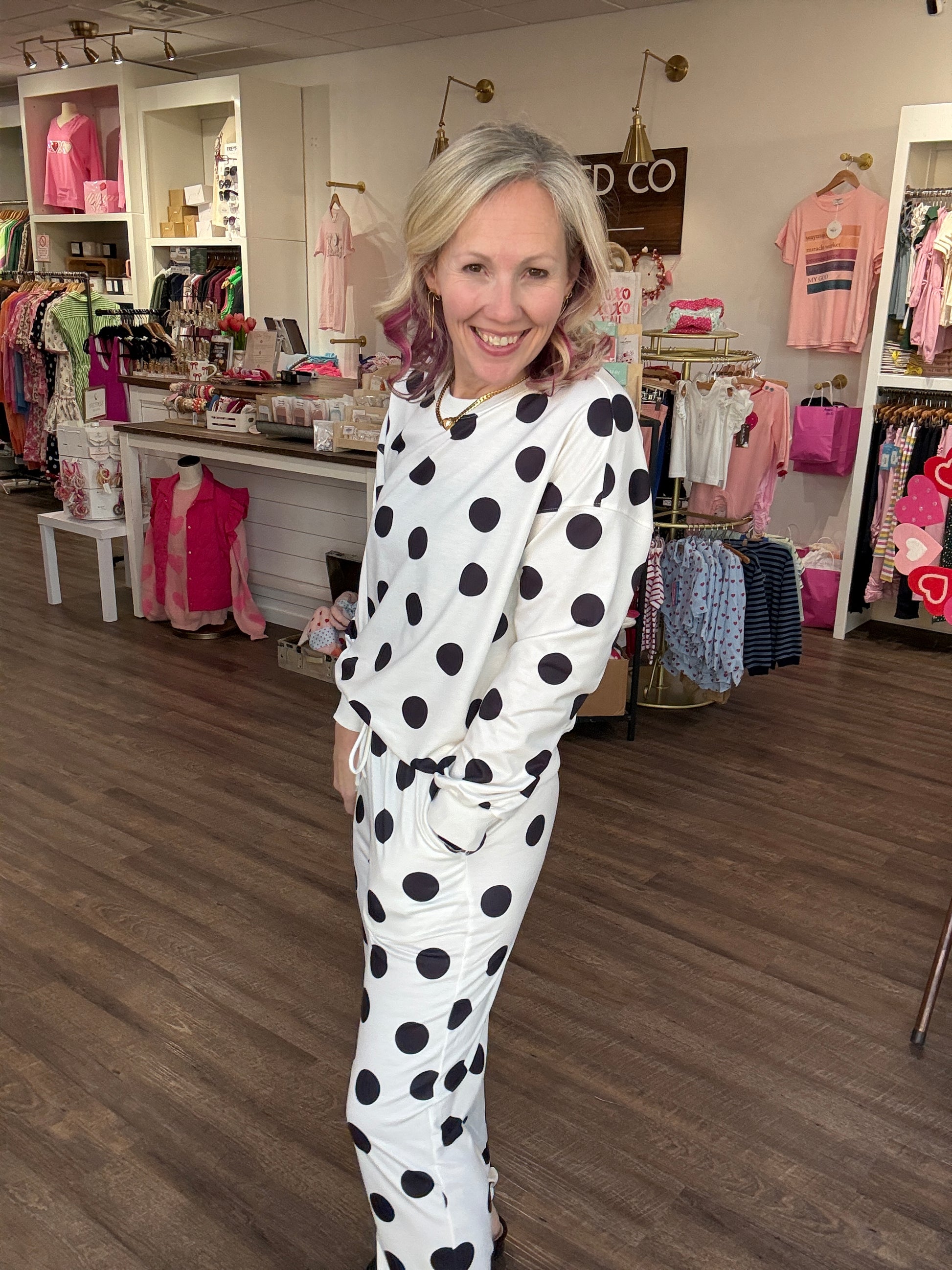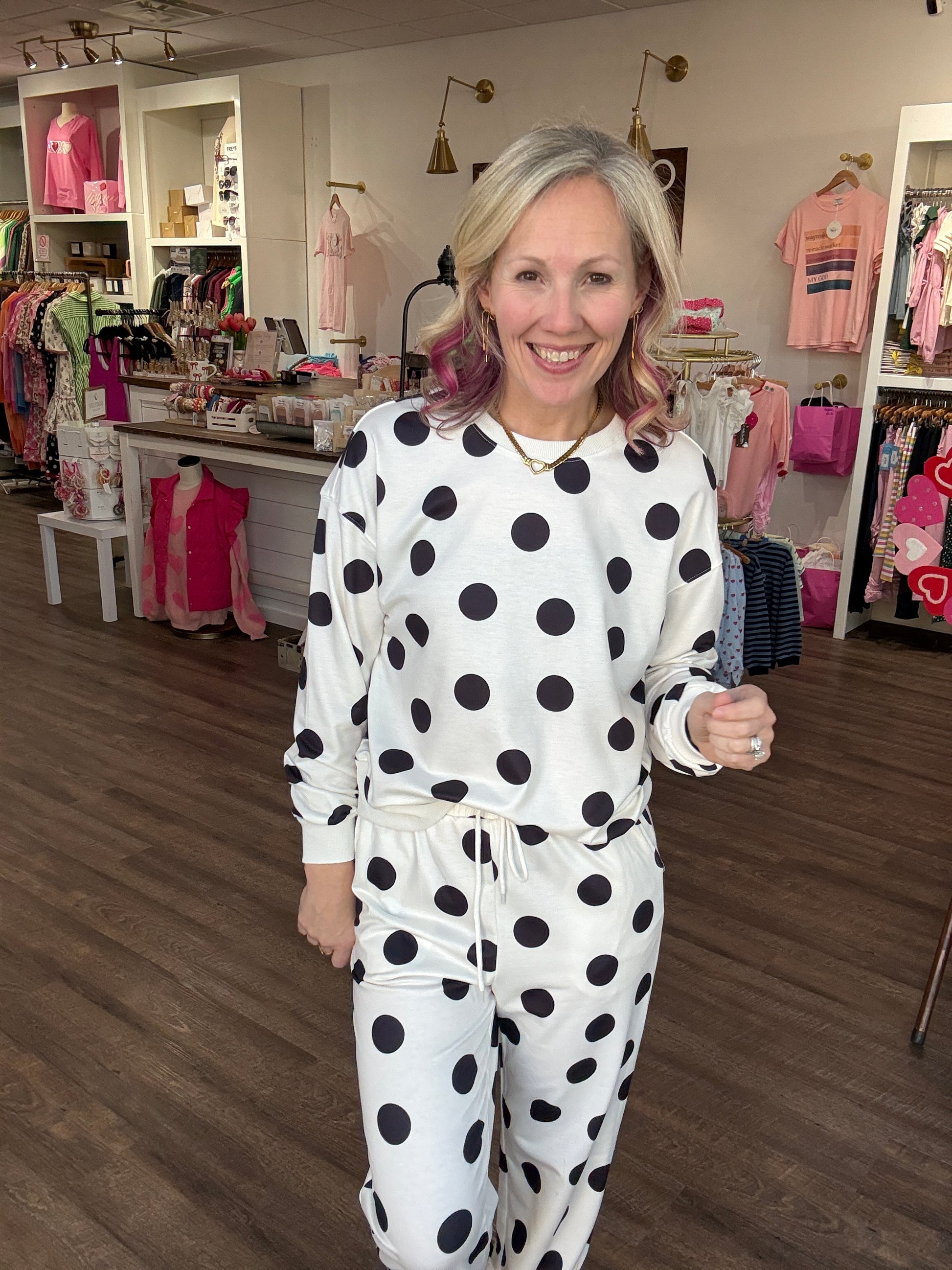Meet the cutest set for that in-between season we all love. The Dot the Way Jogger Set features a crisp white base with classic black polka dots for a playful, timeless look that feels fresh for spring. Designed with comfort in mind but styled to look put together, this set is an easy favorite.