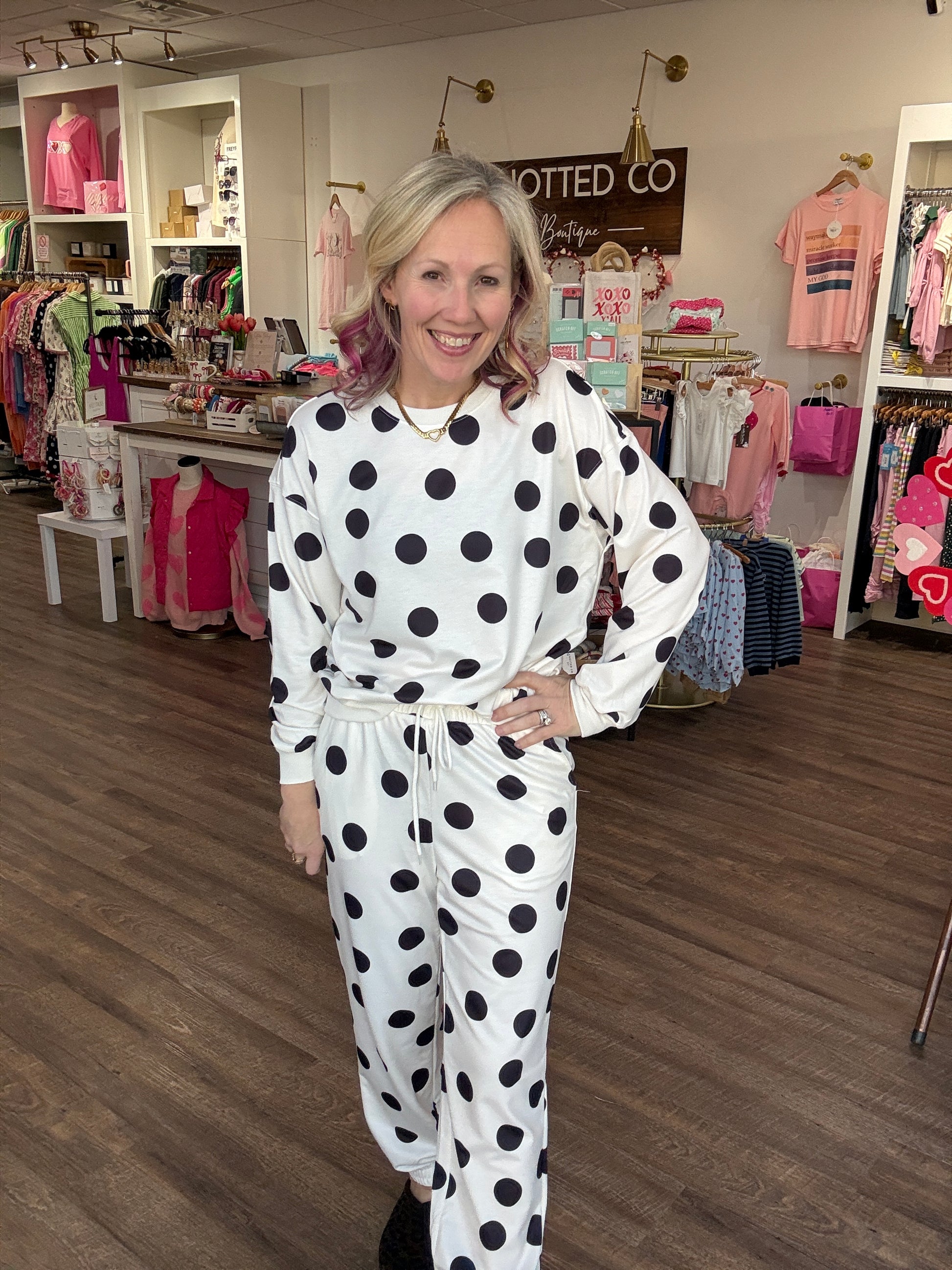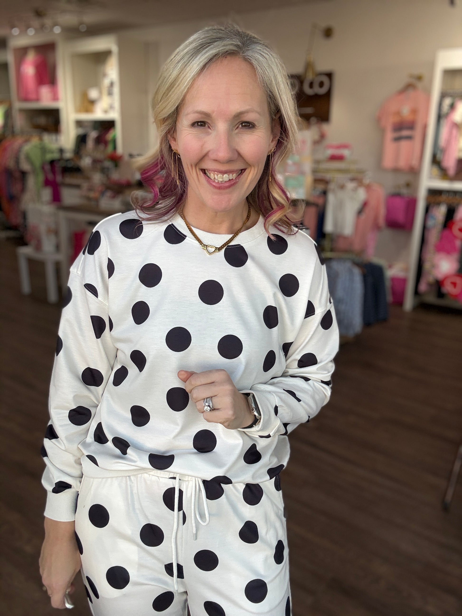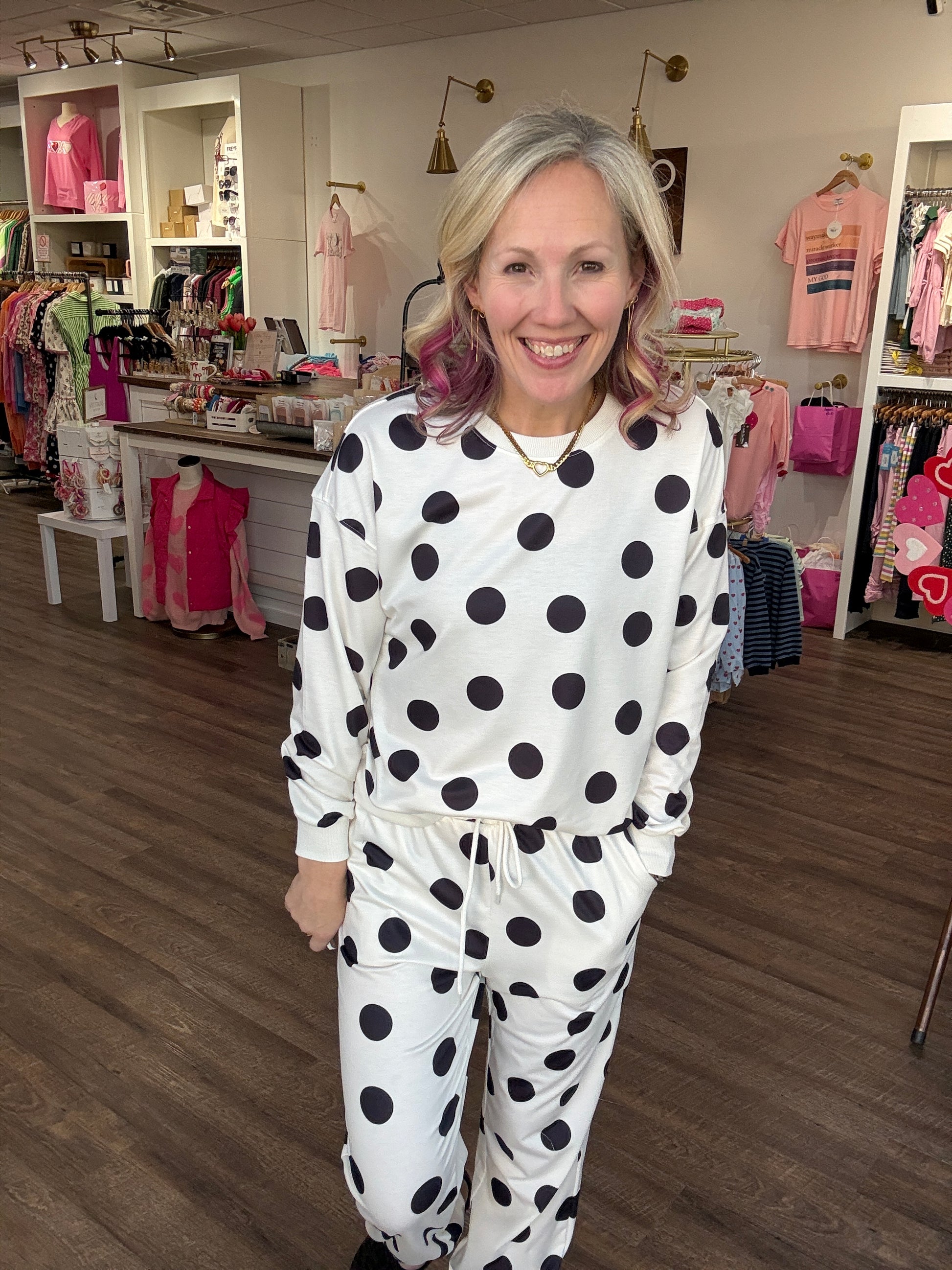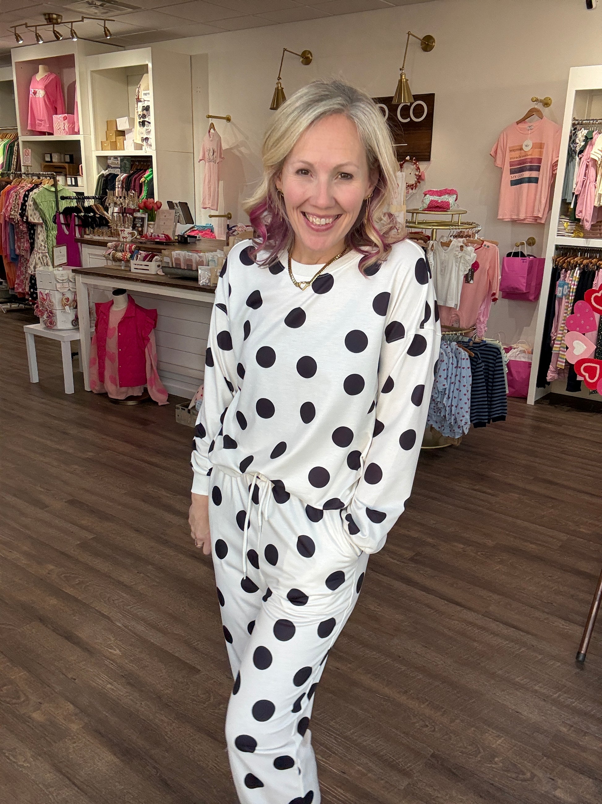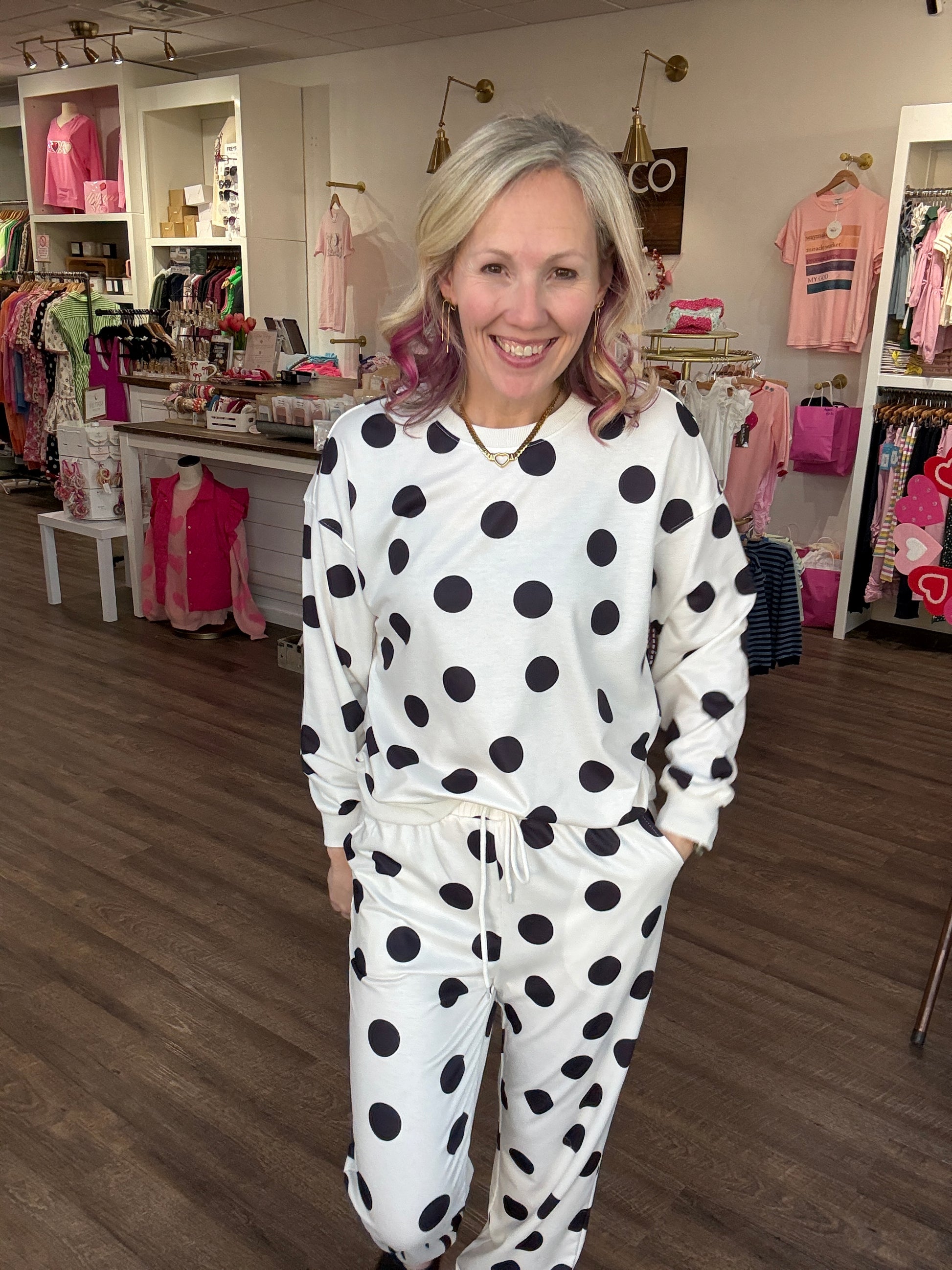 Meet the cutest set for that in-between season we all love. The Dot the Way Jogger Set features a crisp white base with classic black polka dots for a playful, timeless look that feels fresh for spring. Designed with comfort in mind but styled to look put together, this set is an easy favorite.