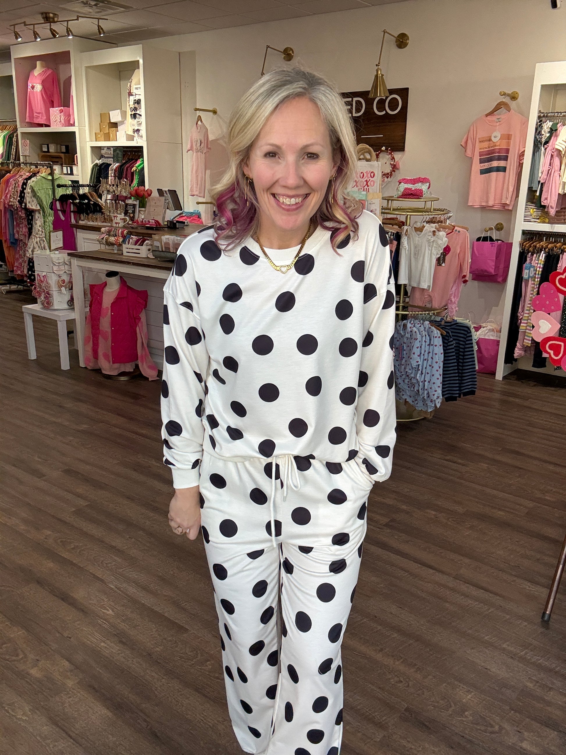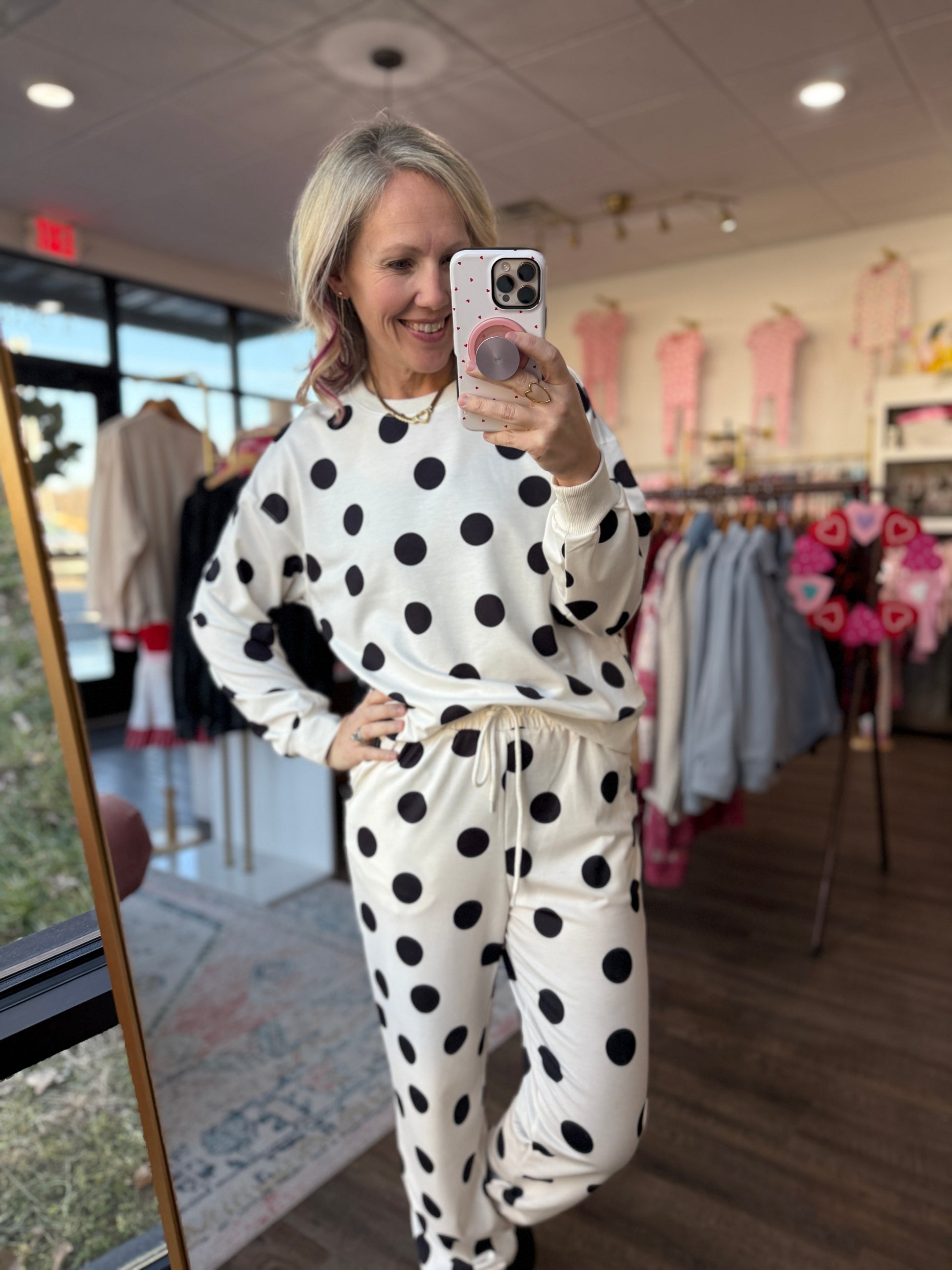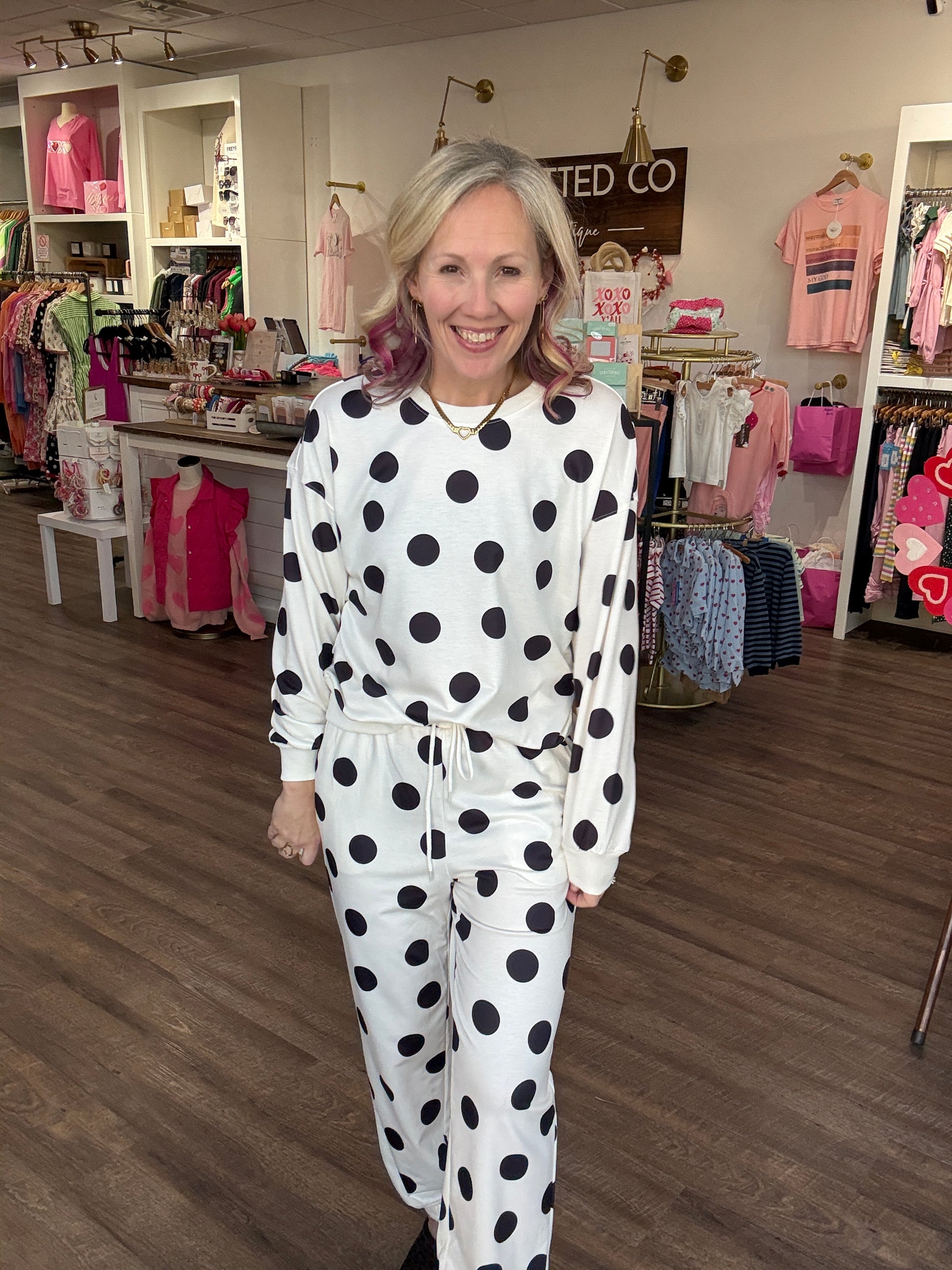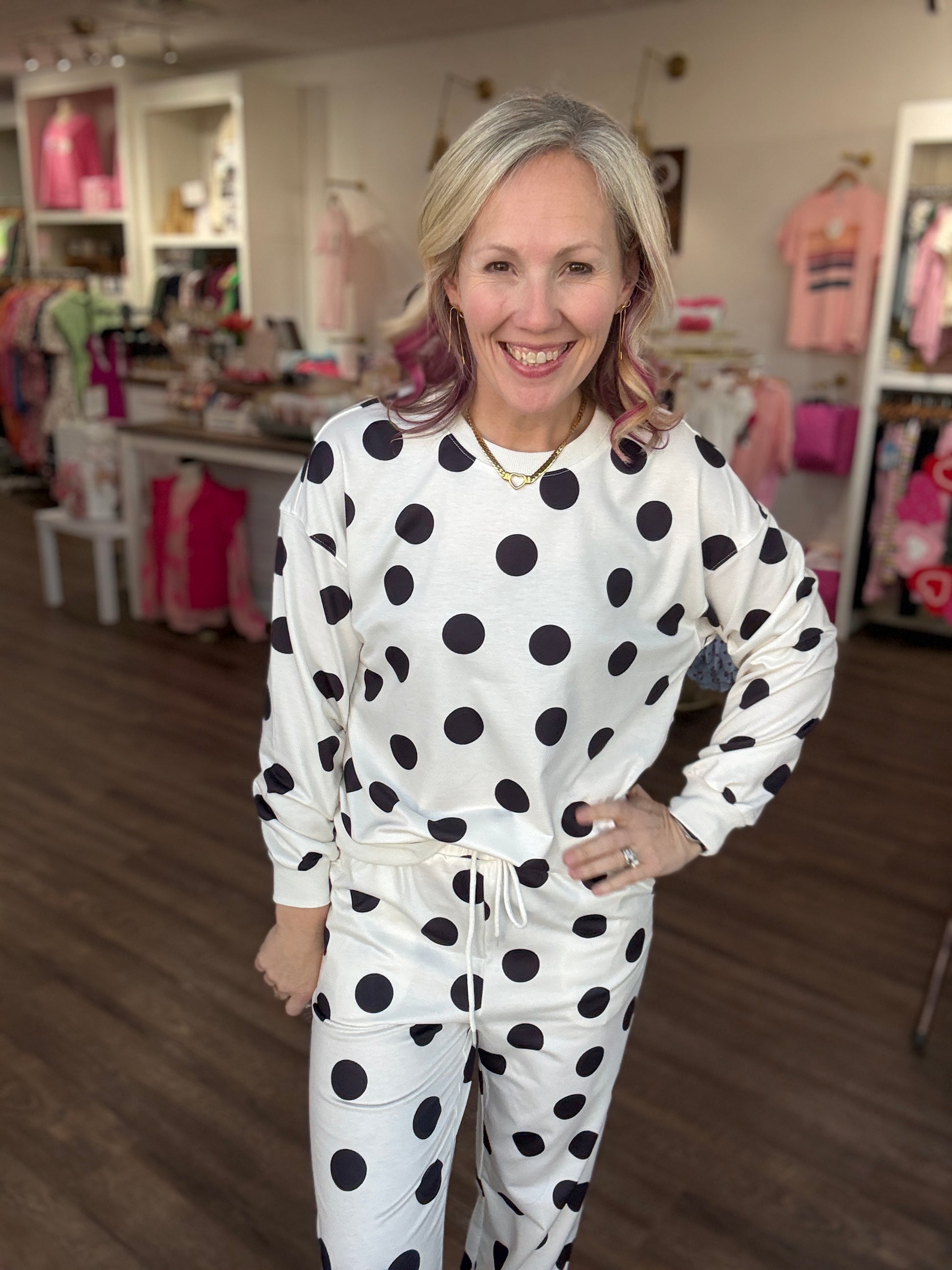 Meet the cutest set for that in-between season we all love. The Dot the Way Jogger Set features a crisp white base with classic black polka dots for a playful, timeless look that feels fresh for spring. Designed with comfort in mind but styled to look put together, this set is an easy favorite.
