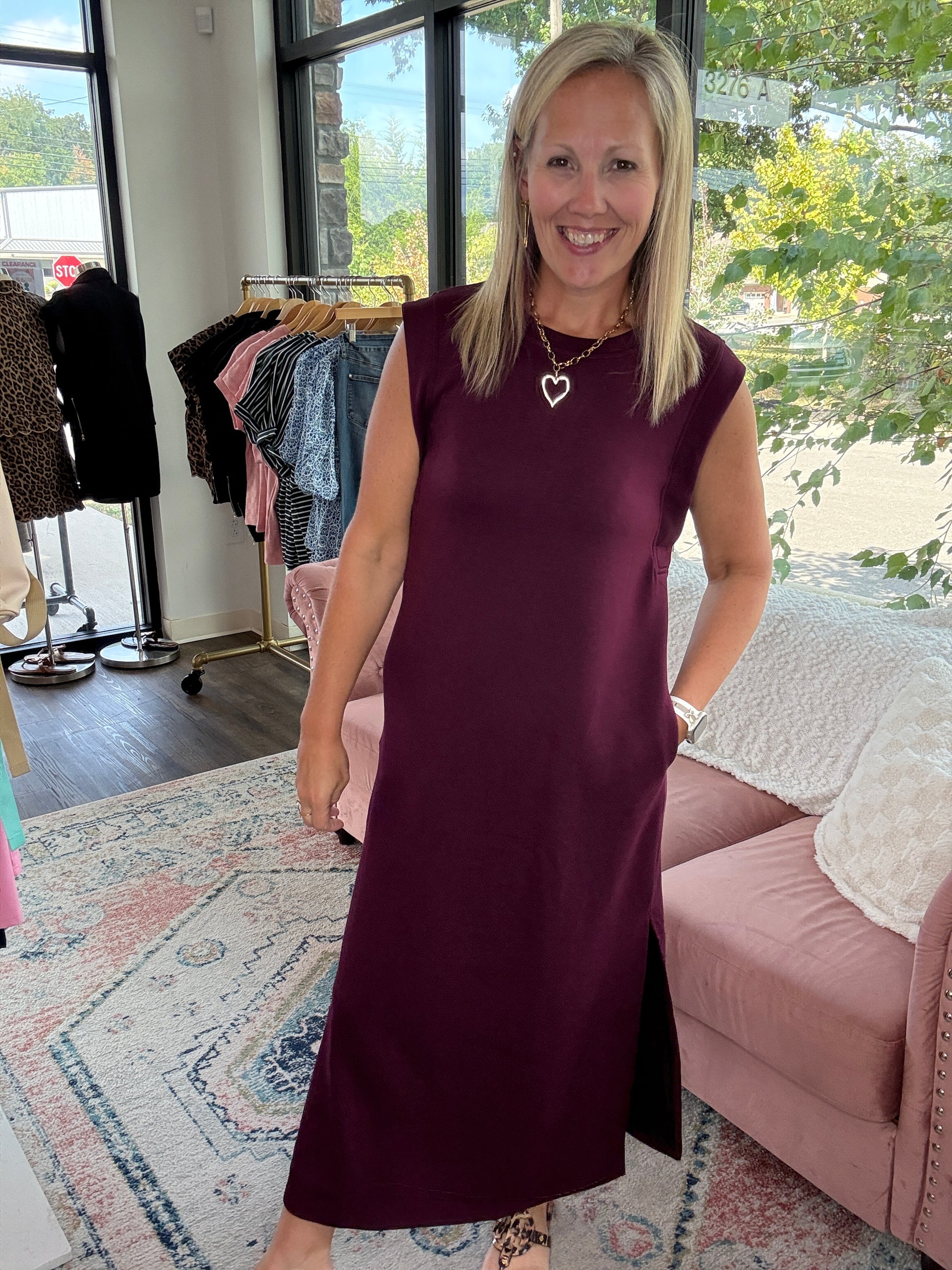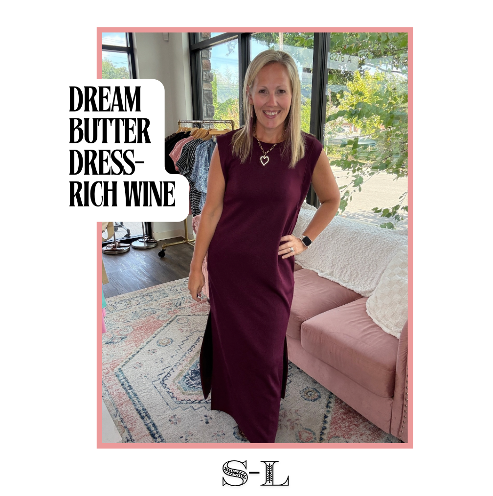 The Dream Butter Knit Midi Dress – Once you slip this on, you’ll understand why we call it amazing. Made from our signature butter knit fabric, it’s unbelievably soft with just the right weight to wear now and layer into cooler months. The midi length keeps it classy, while a knee-high side slit adds the perfect touch of movement. Thoughtful gusset detail under the arm keeps your bra hidden, and yes—there are pockets. Available in rich wine, deep navy, and lush forest green, this is the dress you’ll reach for again and again.