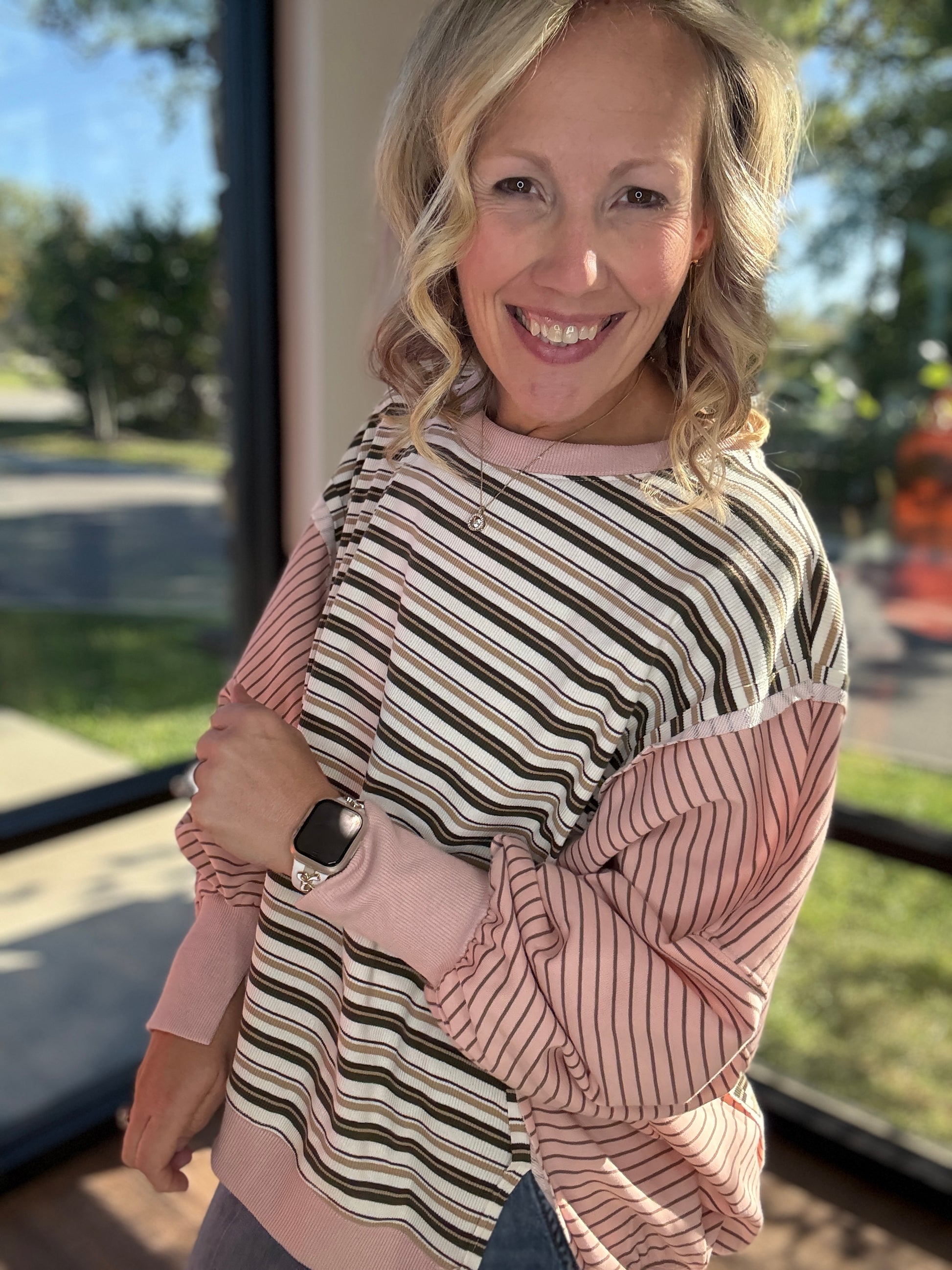 Laid-back, comfy, and full of charm — the Easy Days Striped Sweatshirt is your new everyday favorite. With a mix of pink, mocha, and green stripes, this oversized pullover brings a playful touch to your casual look.