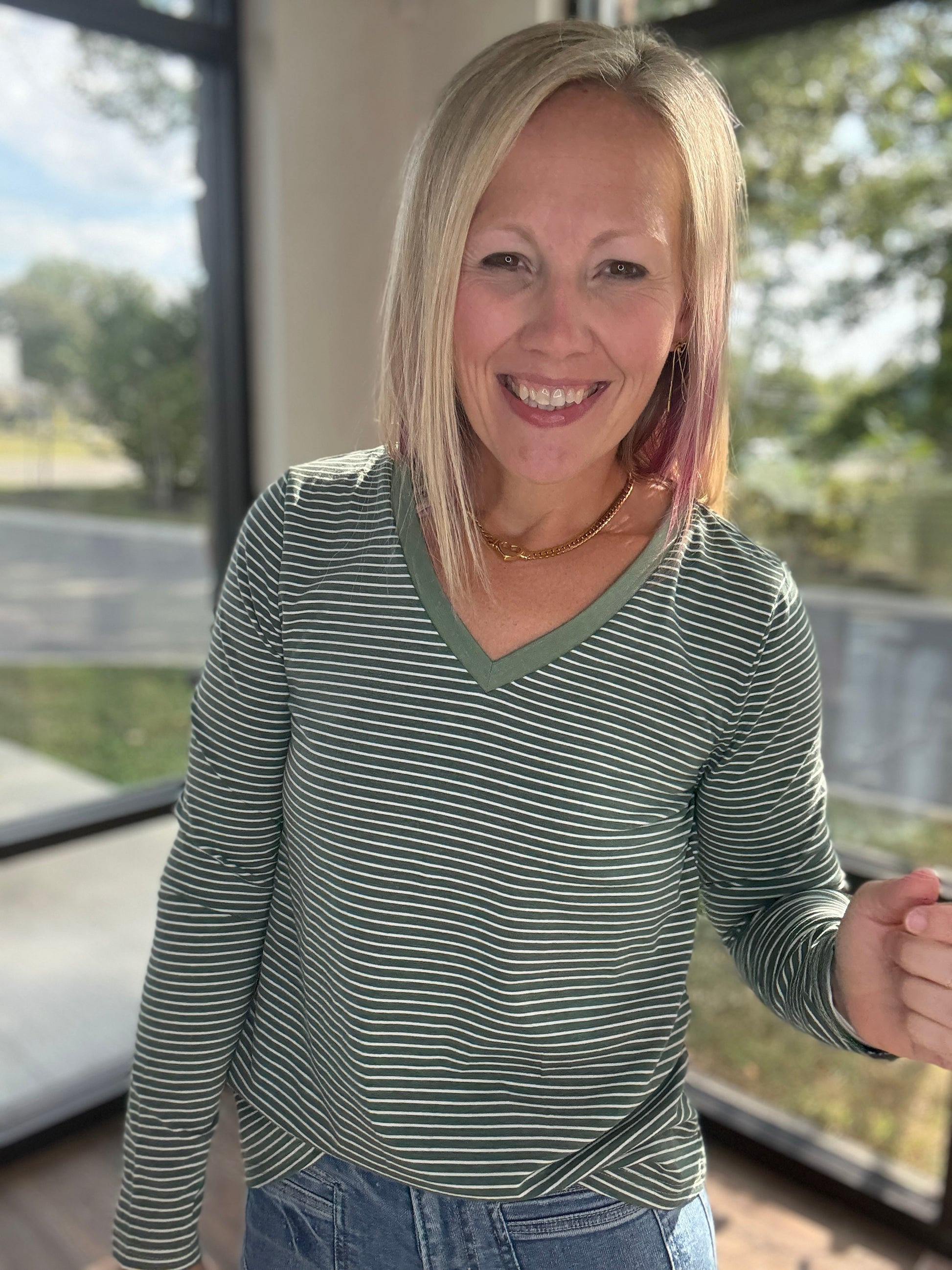 Fresh, flattering, and oh-so-comfy — the Evergreen V-Neck Top is your new go-to for easy everyday style. With its classic green stripes, soft stretchy fabric, and a flattering V-neckline, this long sleeve is as versatile as it is cute. Dress it up with trousers and booties or keep it casual with denim and sneakers — either way, you’ll love how effortless it feels. Perfect for layering into fall or wearing solo when you want comfort that still looks put-together.