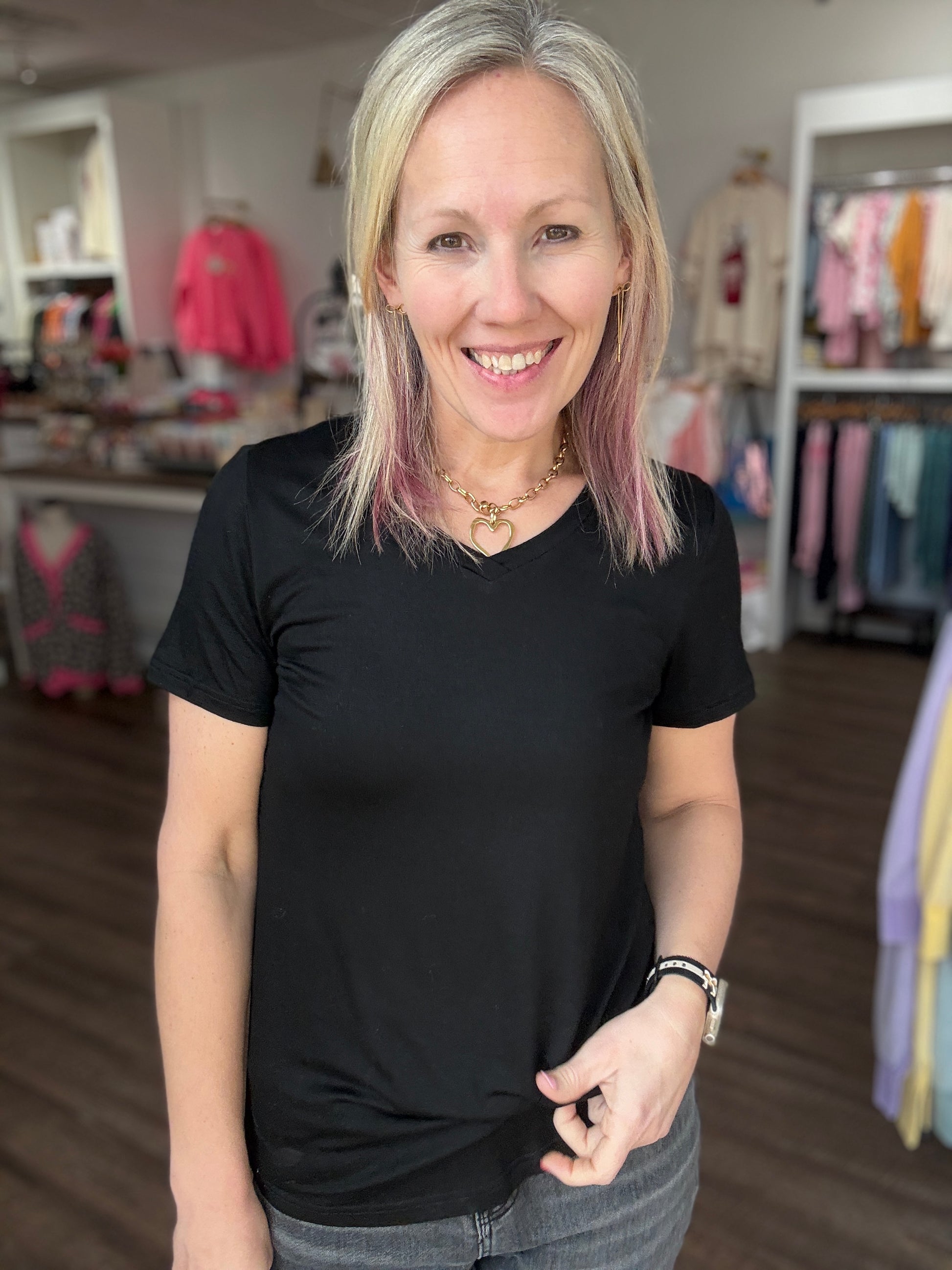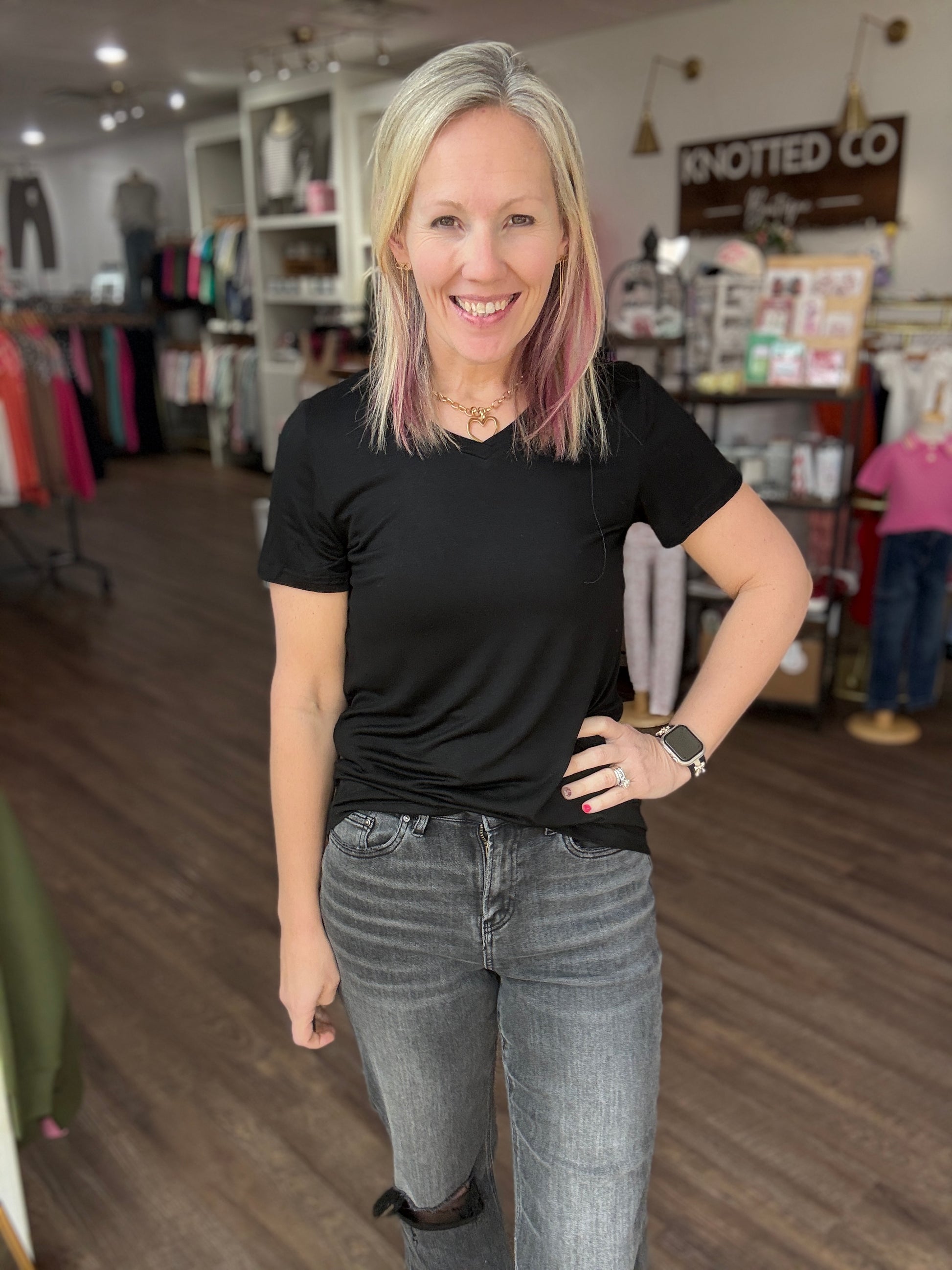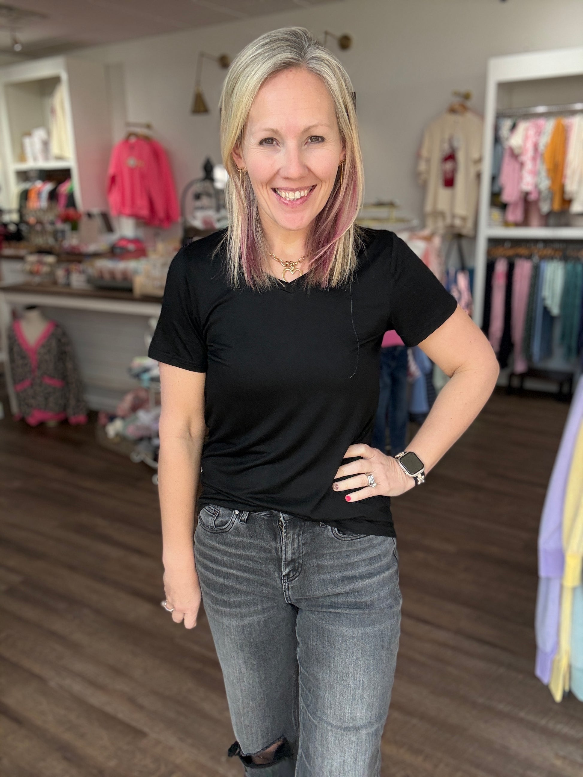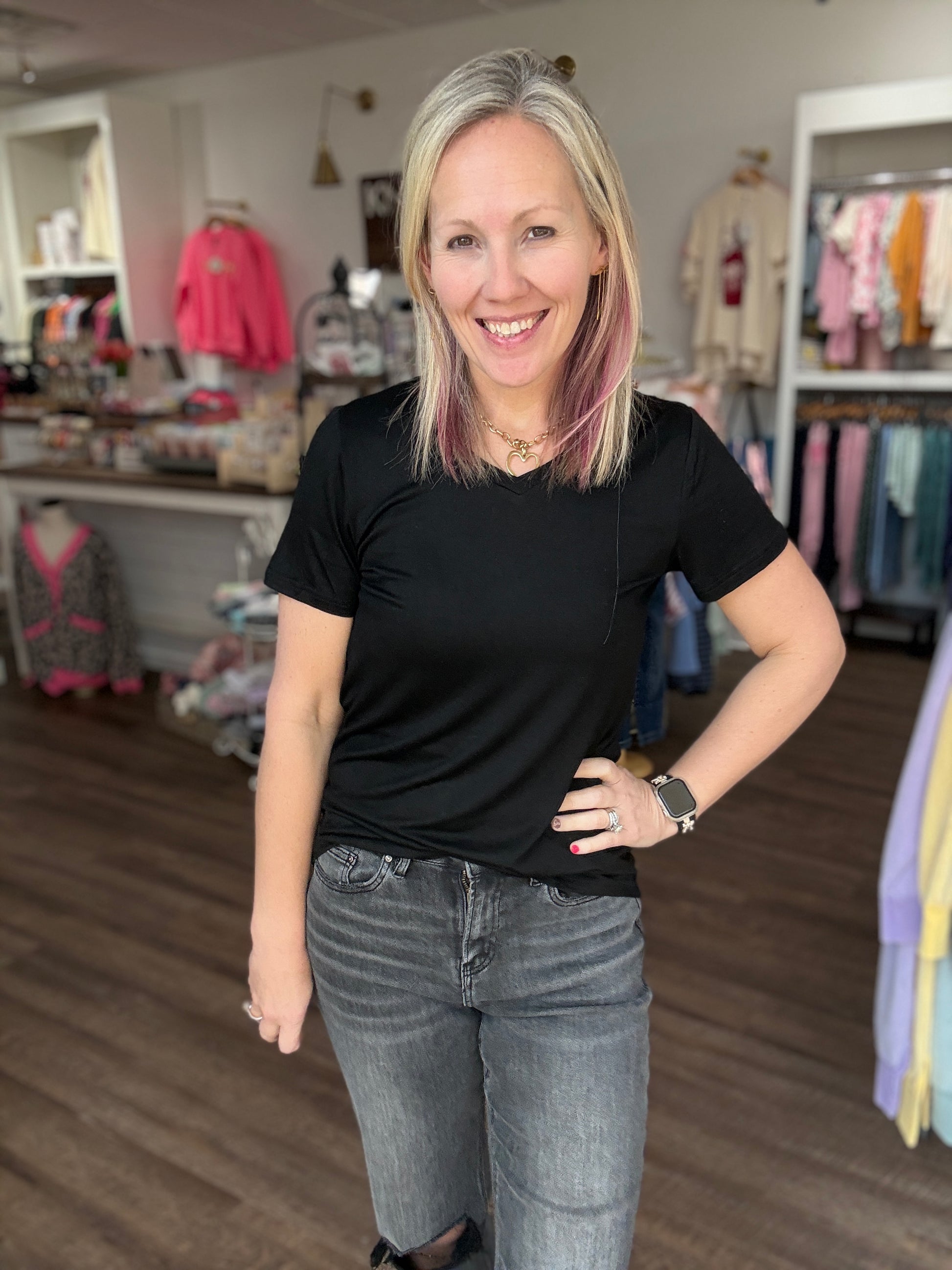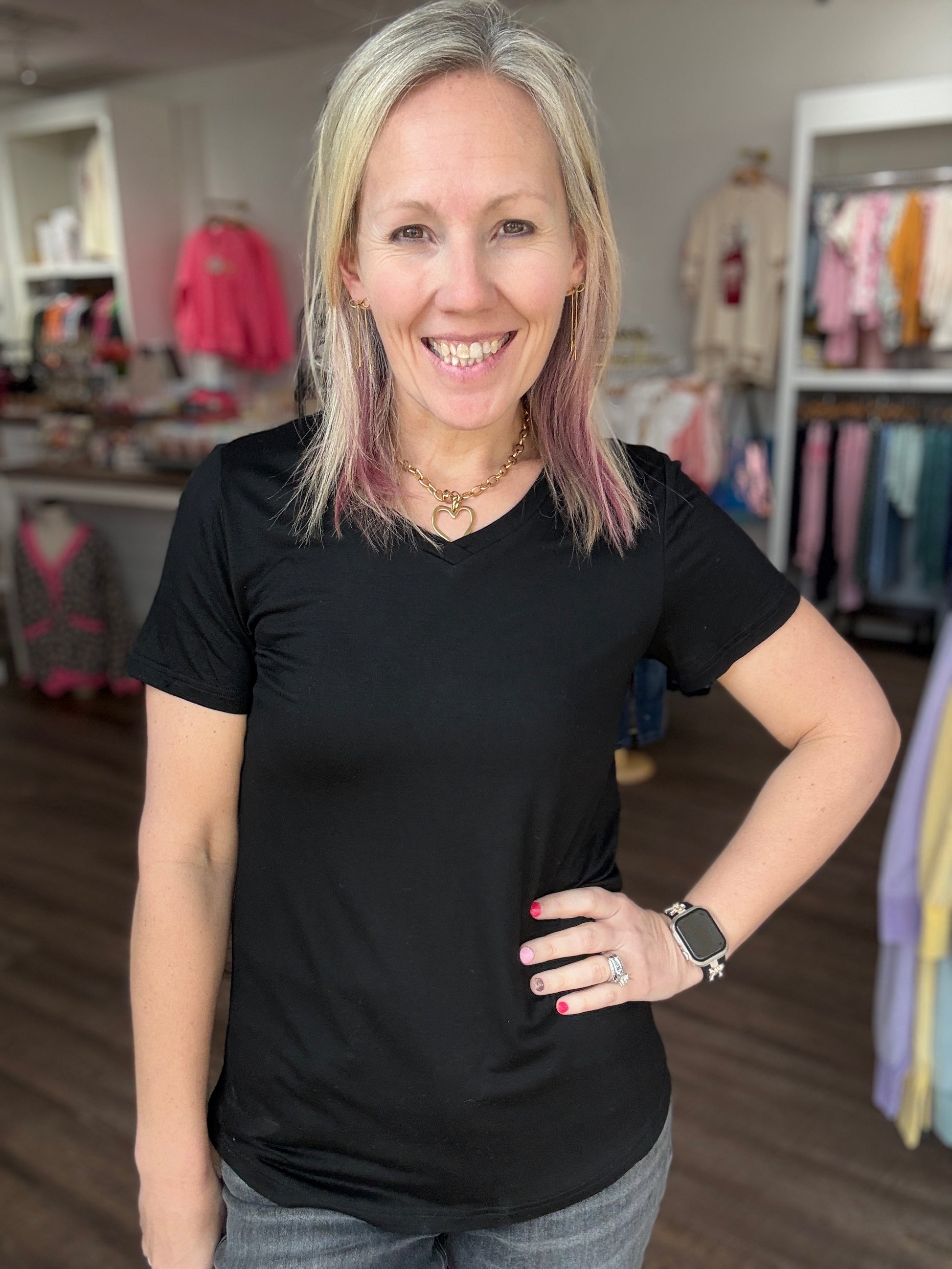 We know we're always on the lookout for a good, comfy basic! This basic tee is definitely one of those pieces! It's comfy and a perfect fit that makes it so easy to wear and the colors make styling and layering it a breeze! This top features short sleeves, a v-neck, and a rounded hemline. Order your normal size for a true fit or size up for a more relaxed style Fabric: 95% Rayon, 5% Spandex