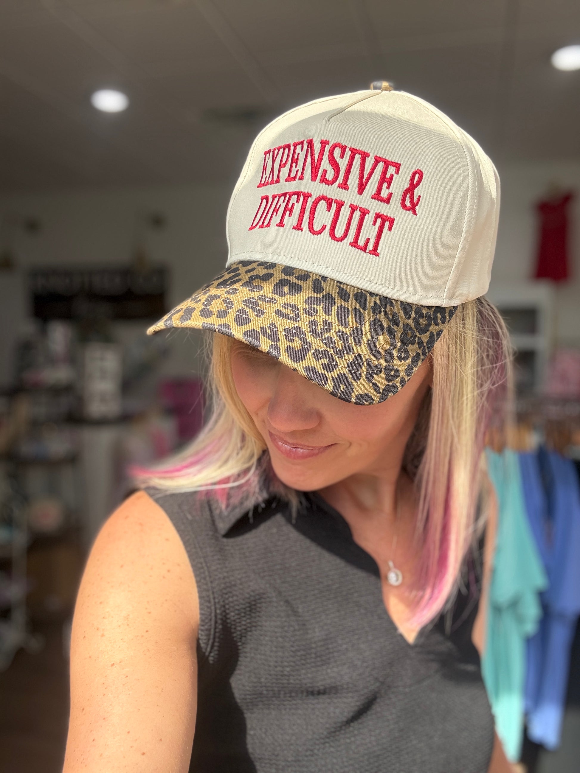 Say it louder for the people in the back—this one’s for the girls who know their worth and don’t water it down. The Expensive & Difficult Hat brings the attitude with bold red embroidered lettering that makes a statement before you even say a word. Finished with a fierce leopard print bill, it’s the perfect mix of sass and style to top off any outfit.