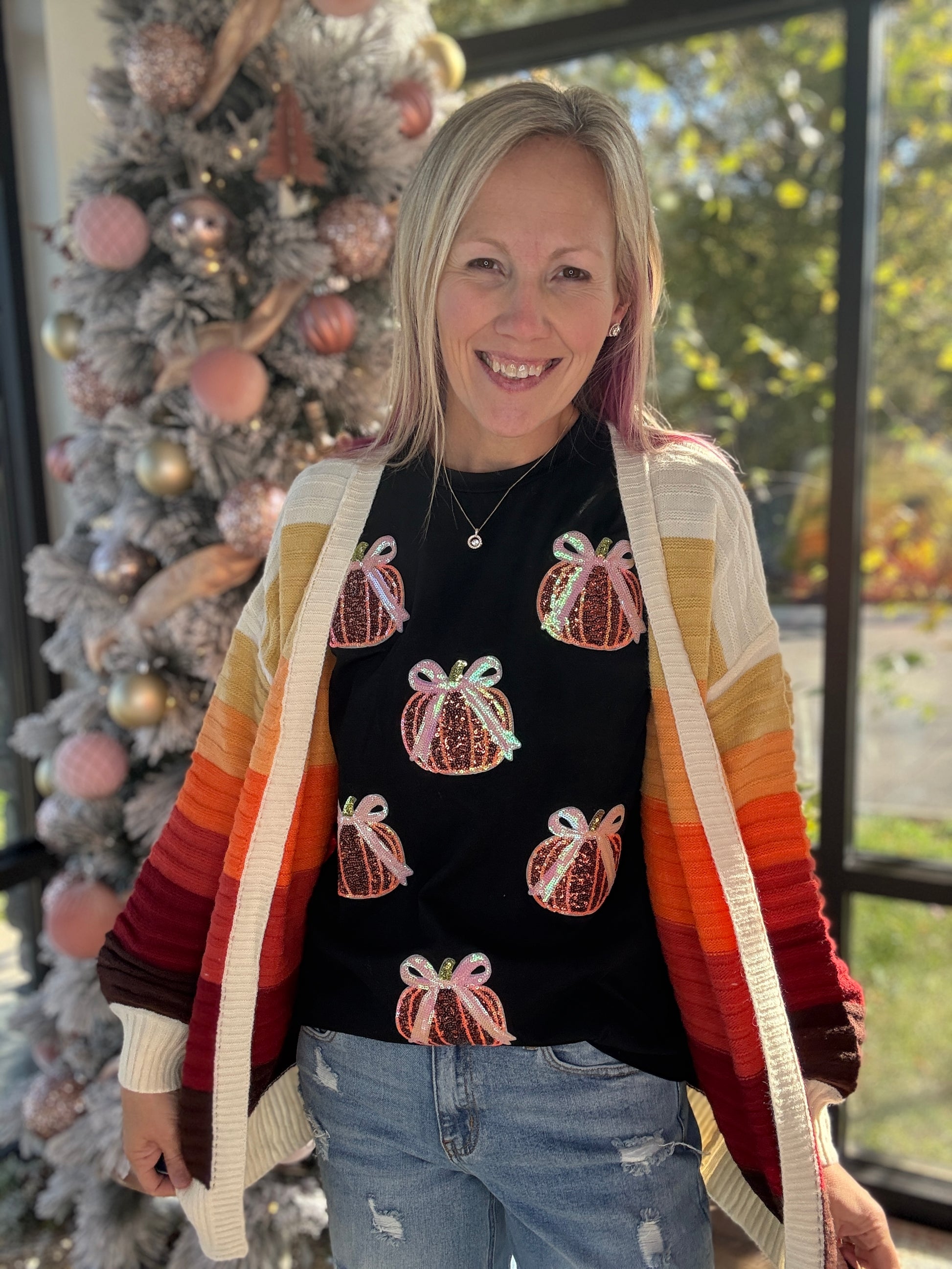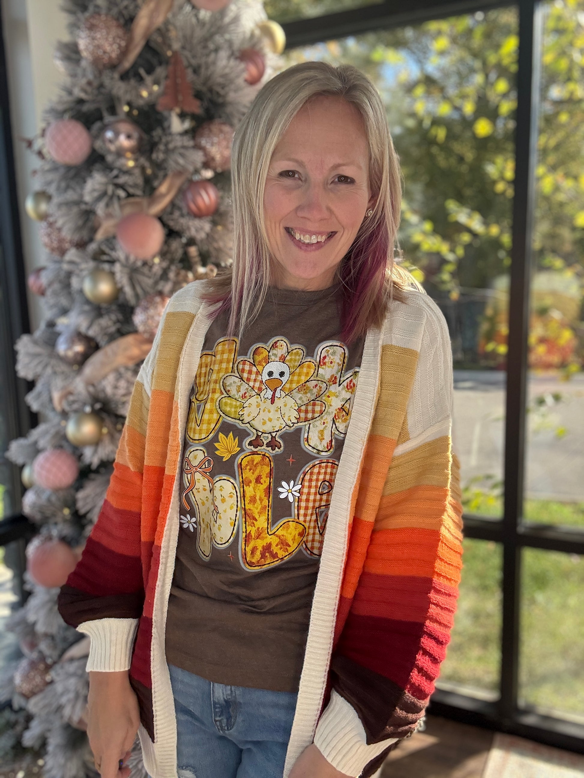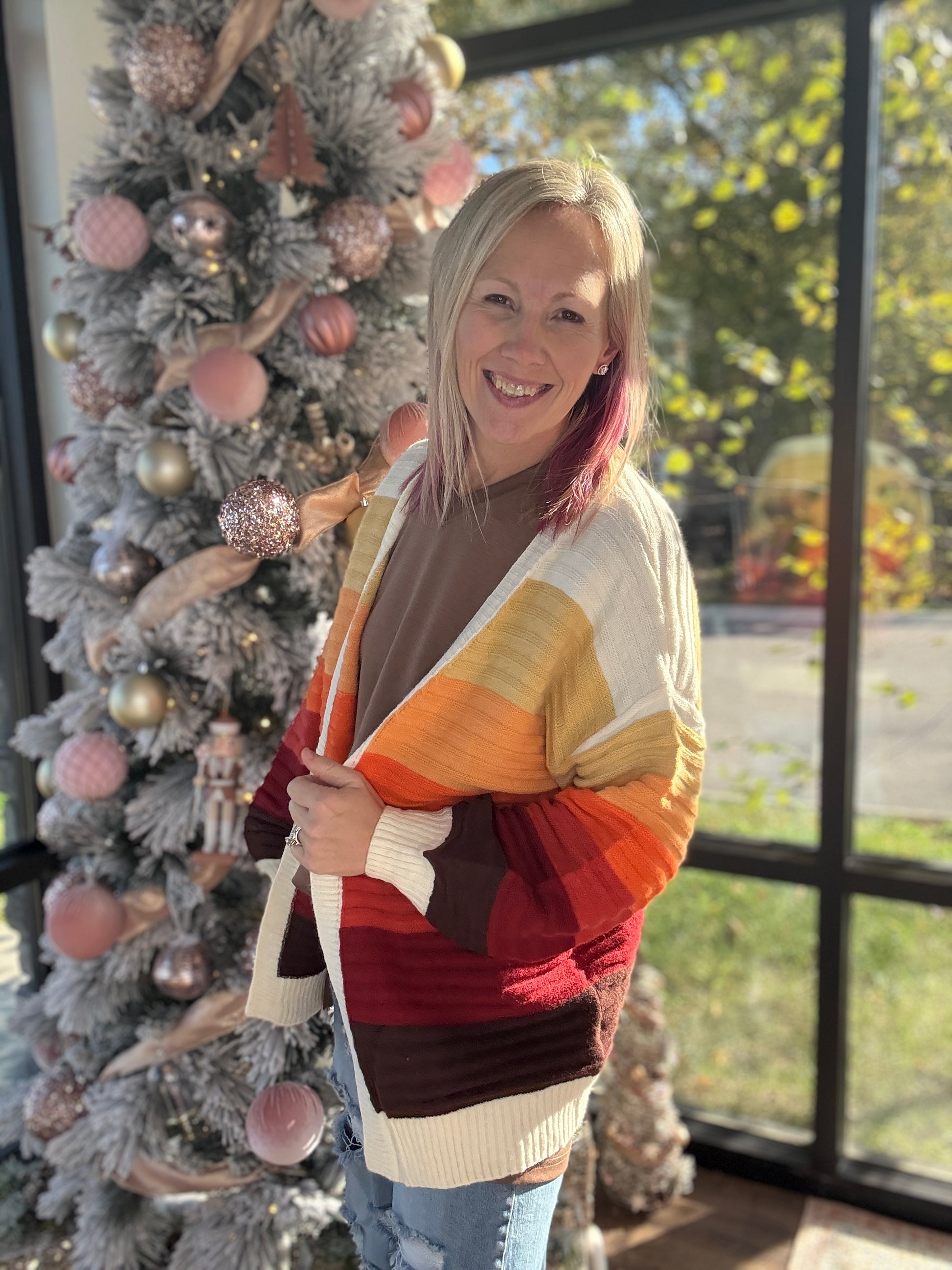 The Fall Dreams Cardigan features a vibrant ombre of autumn hues that catch the eye. Cozy up on crisp fall days and style it with your favorite booties for a fun, seasonal look! Fabric: 39% Acrylic, 31% Polyester, 30% Polyamide