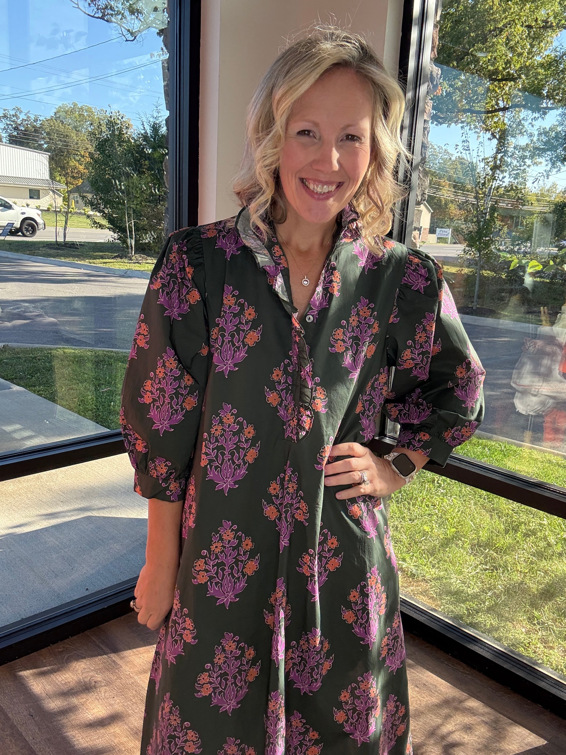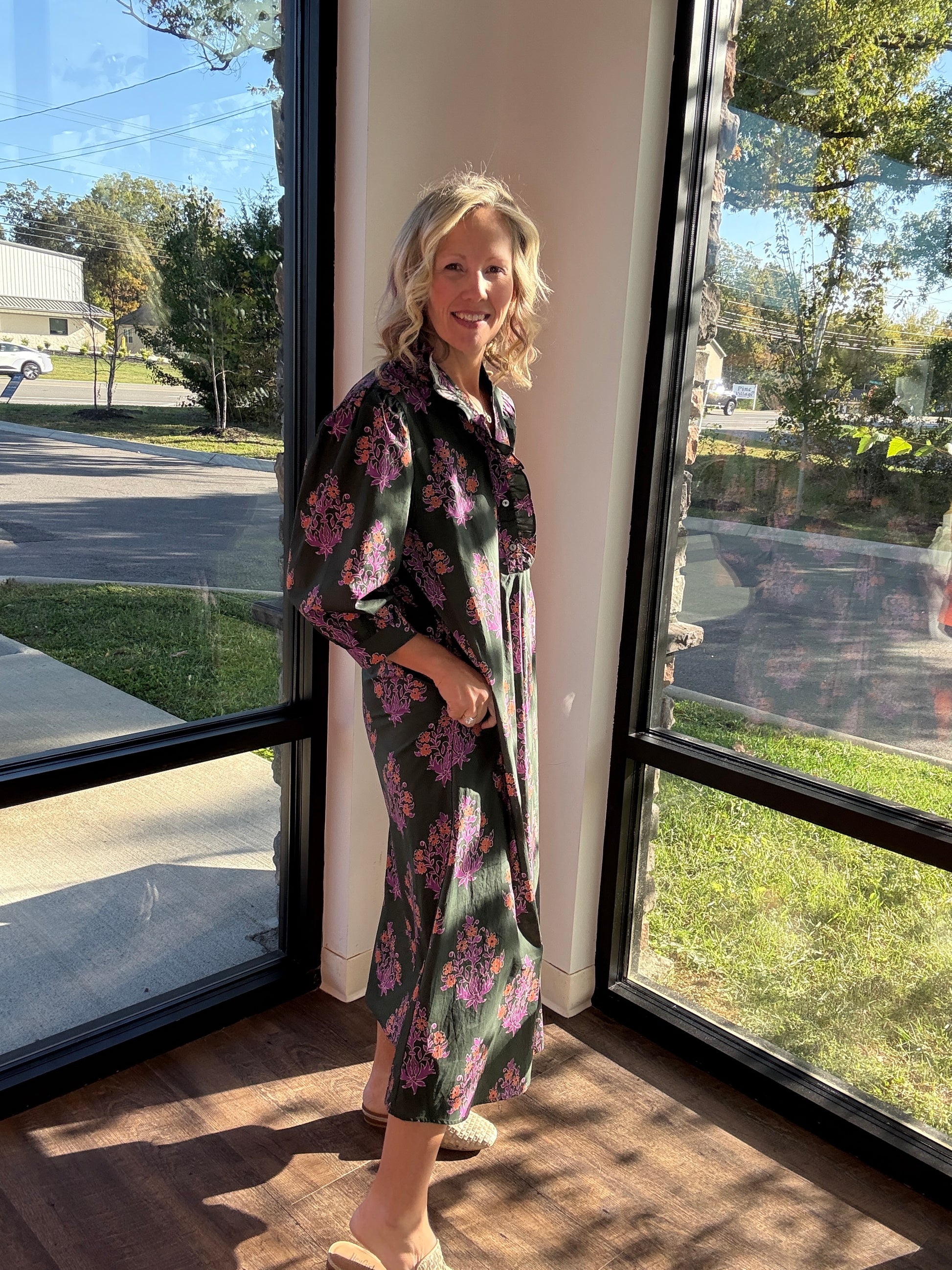 Romantic, effortless, and oh-so-perfect for fall—the Falling For Florals Midi Dress is everything you need this season. Featuring a soft botanical print with delicate ruffle trim along the collar and front placket, this woven beauty adds a touch of feminine charm to your fall wardrobe. The ¾ sleeves, button-front closure, and side pockets make it as functional as it is flattering. Lined, lightweight, and flowy—this dress moves beautifully from workdays to weekend brunches.