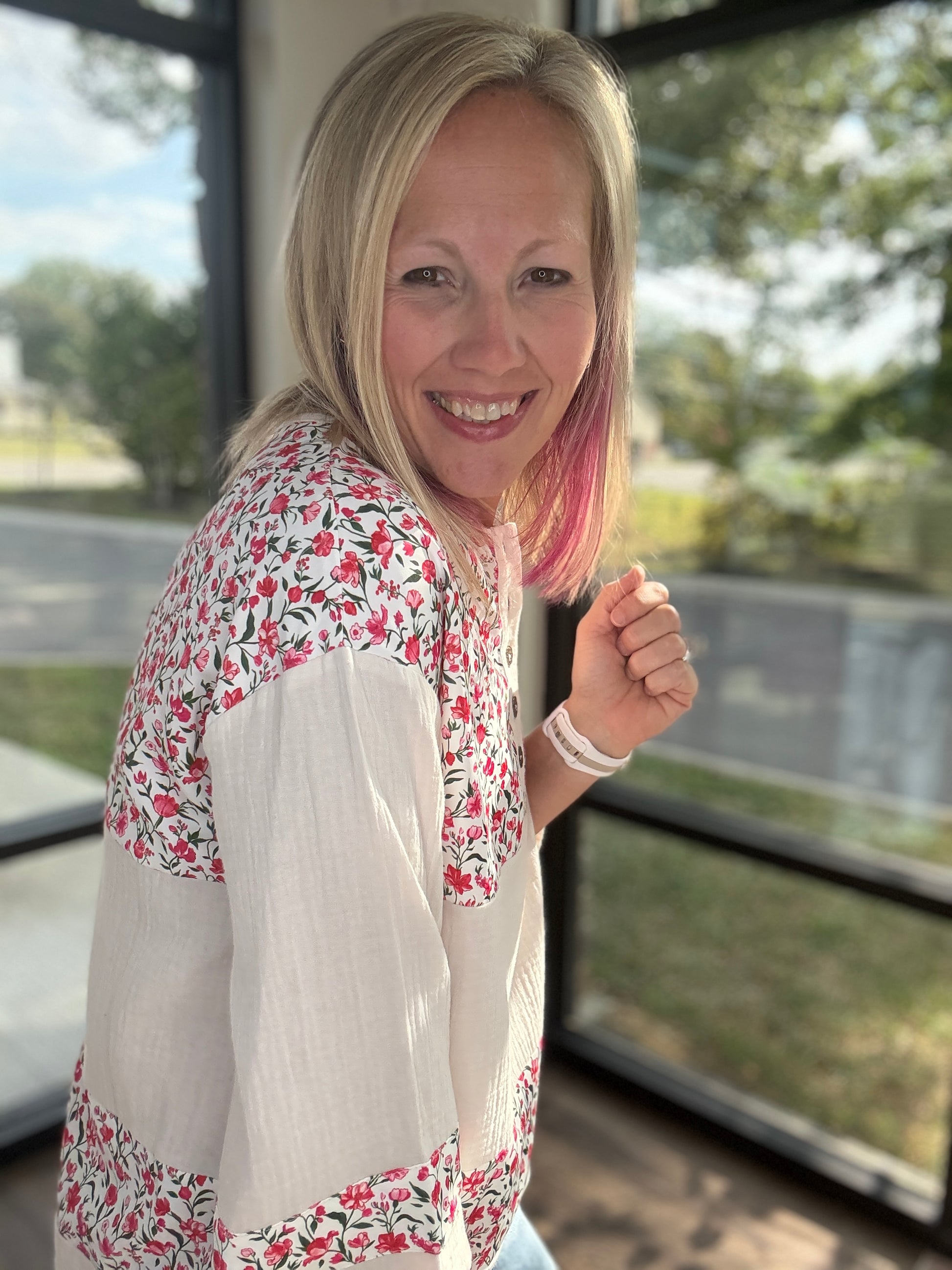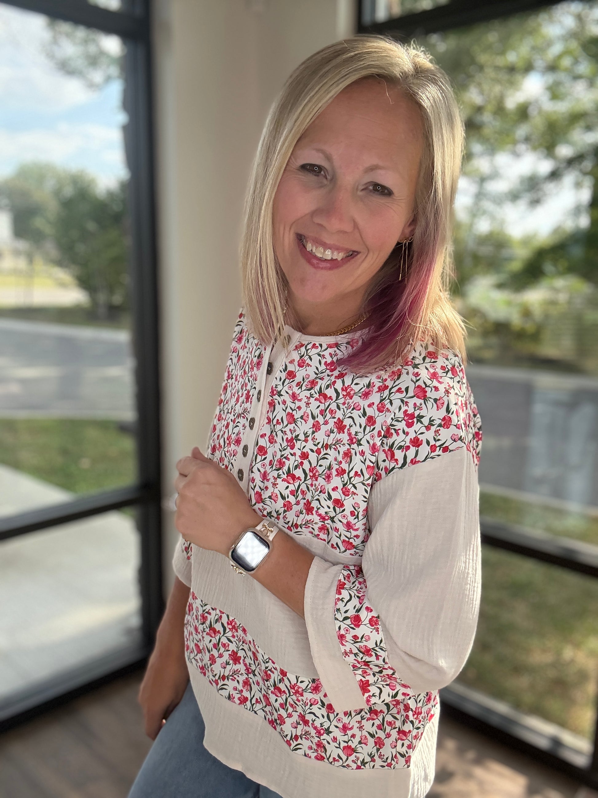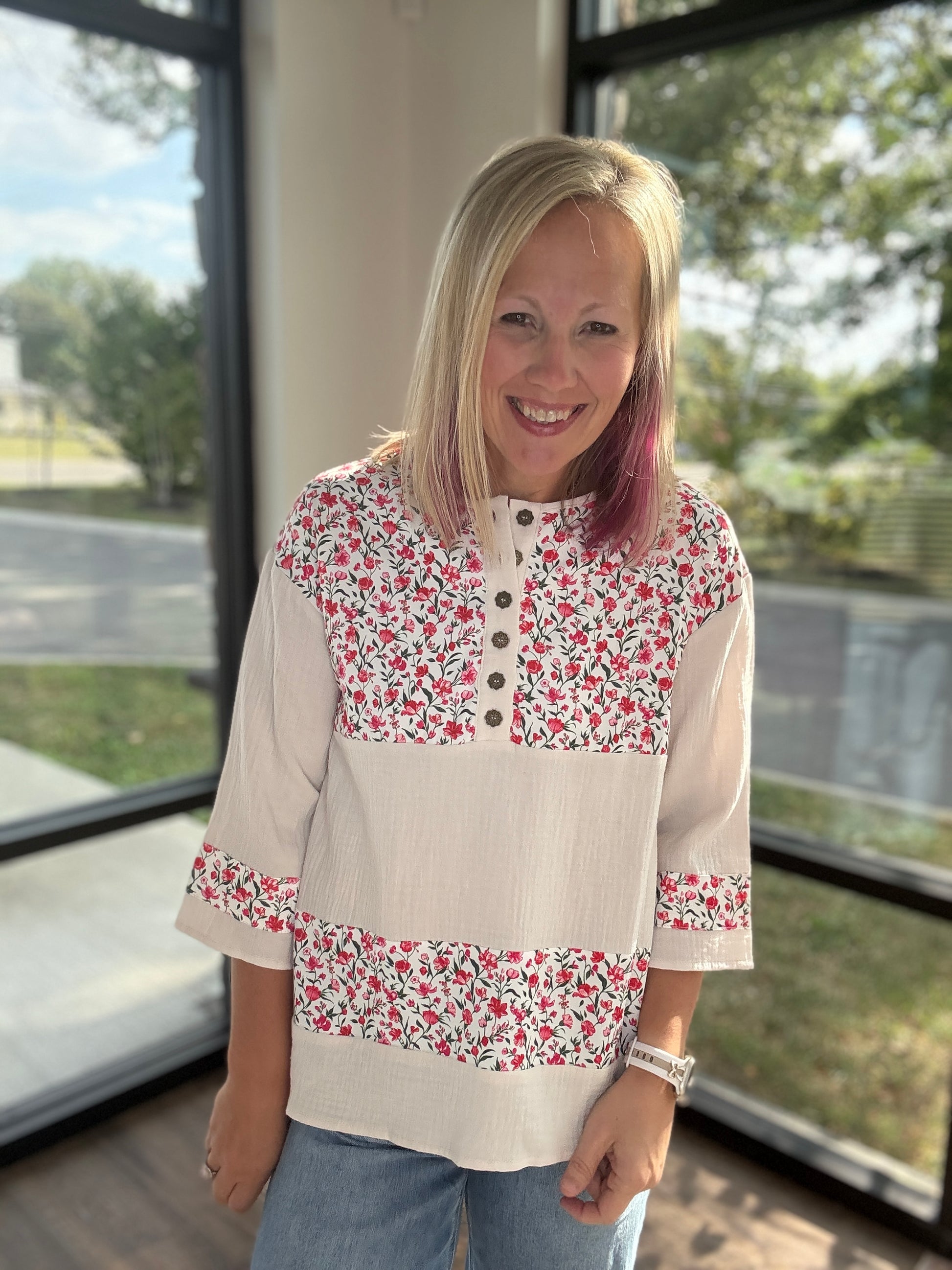 Fresh, feminine, and a little bit playful — the Floral Patch Henley Blouse is the top you’ll reach for again and again. Featuring a relaxed Henley neckline with button details and breezy 3/4 sleeves, this blouse is perfectly accented with patchwork-inspired floral prints for just the right touch of charm. Lightweight and easy to style, it pairs effortlessly with denim for a casual day look or dresses up with trousers for a polished vibe. Comfort meets chic in this everyday staple!