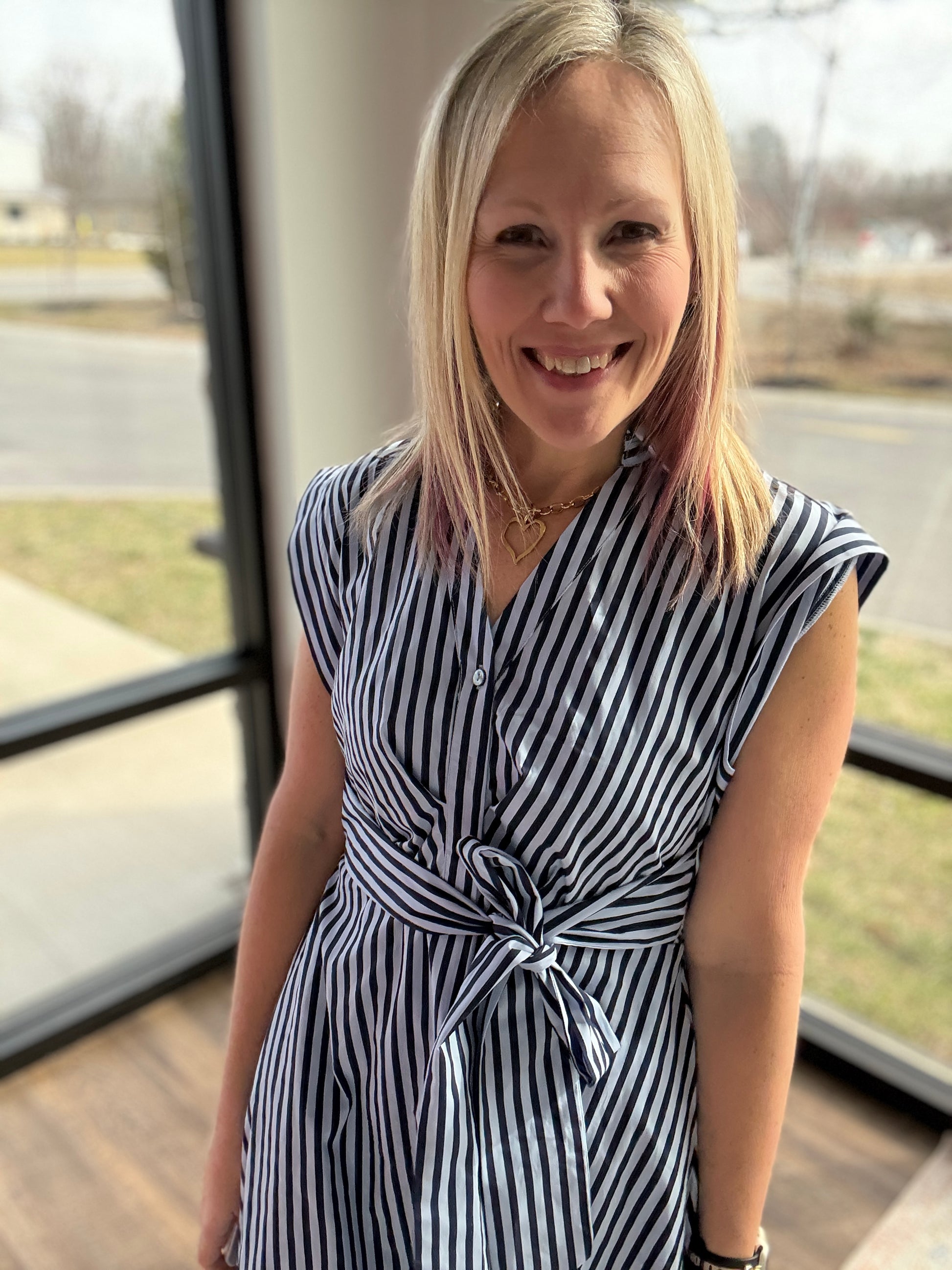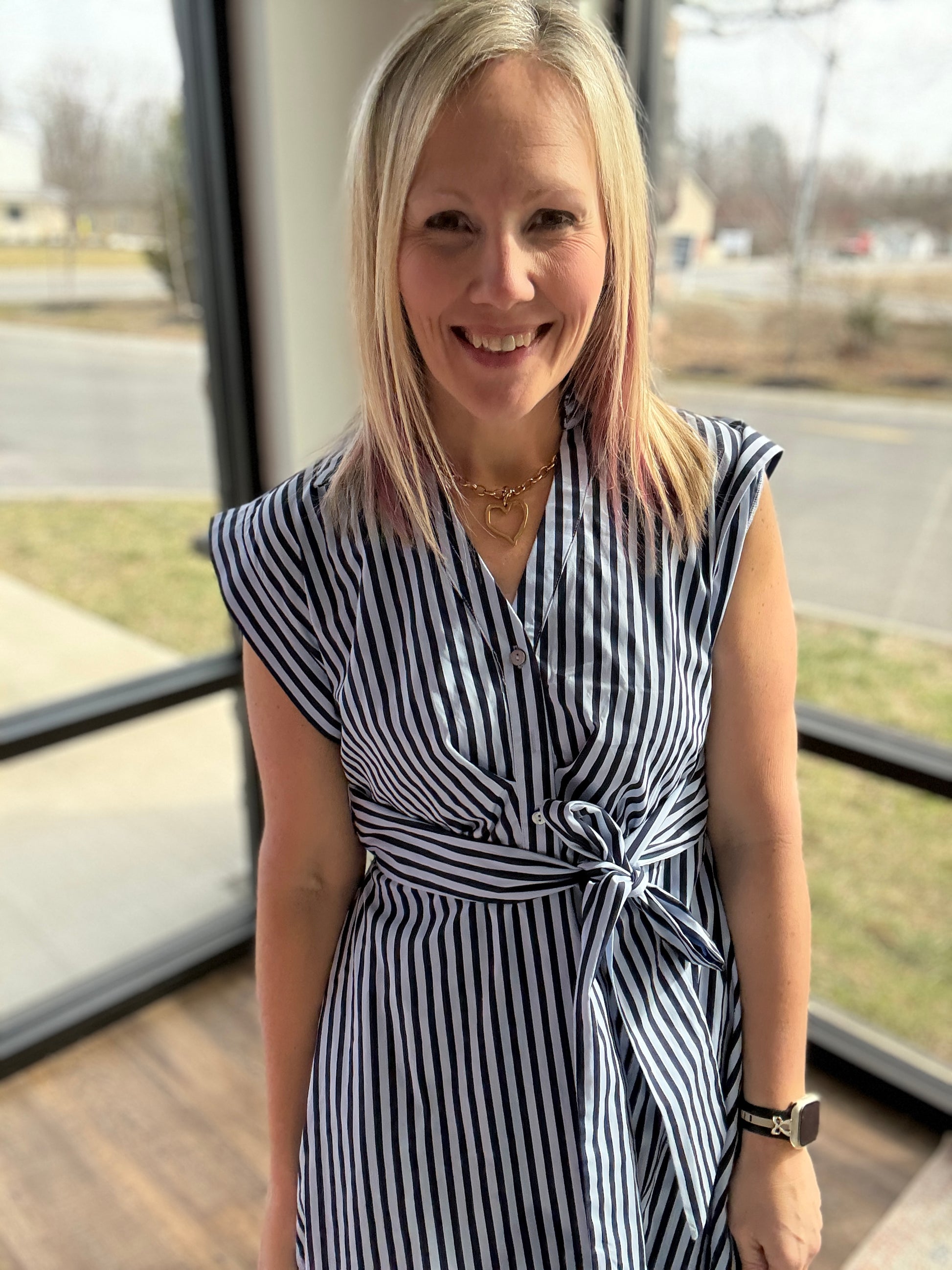 The V-neckline with collar and cap sleeves create a polished look, while the tie waist defines your shape in the prettiest way. A fun twist of horizontal stripes at the bottom panel adds boutique charm, and yes — it has pockets.