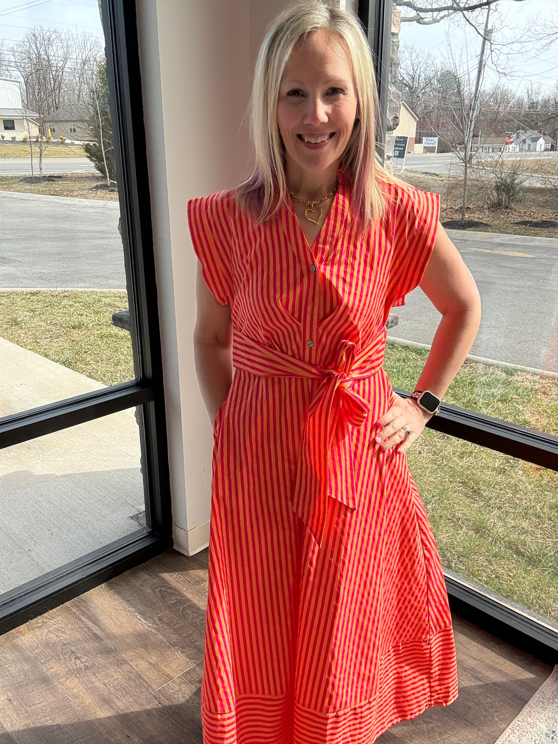 The V-neckline with collar and cap sleeves create a polished look, while the tie waist defines your shape in the prettiest way. A fun twist of horizontal stripes at the bottom panel adds boutique charm, and yes — it has pockets.