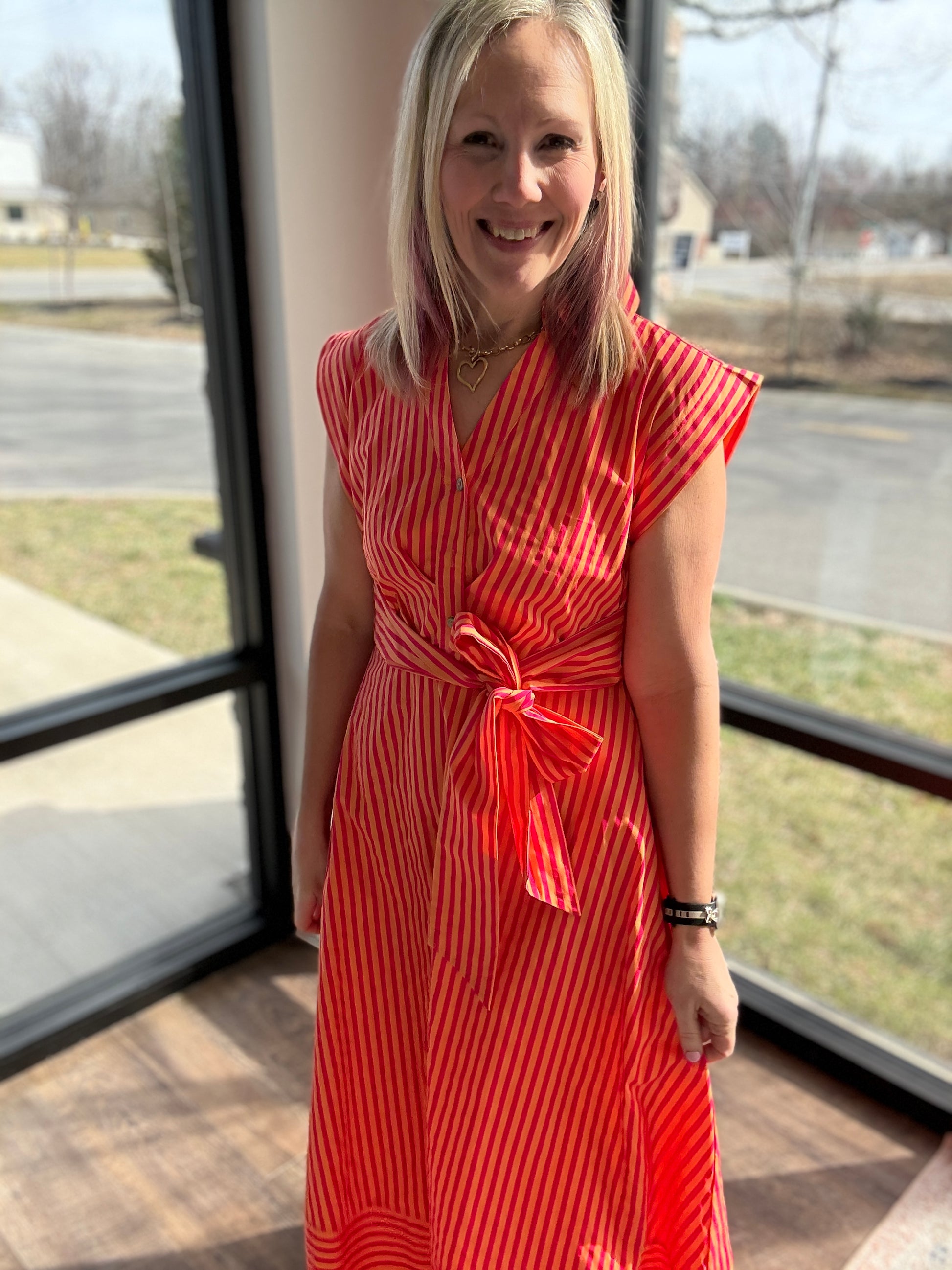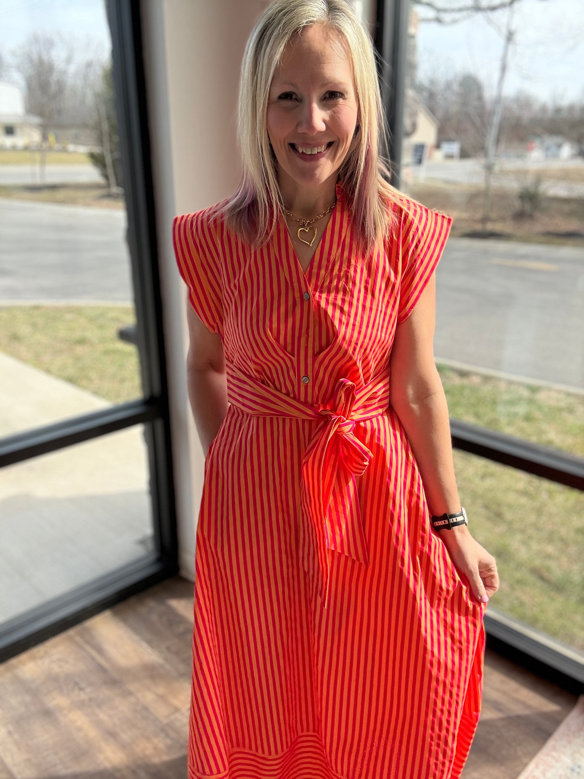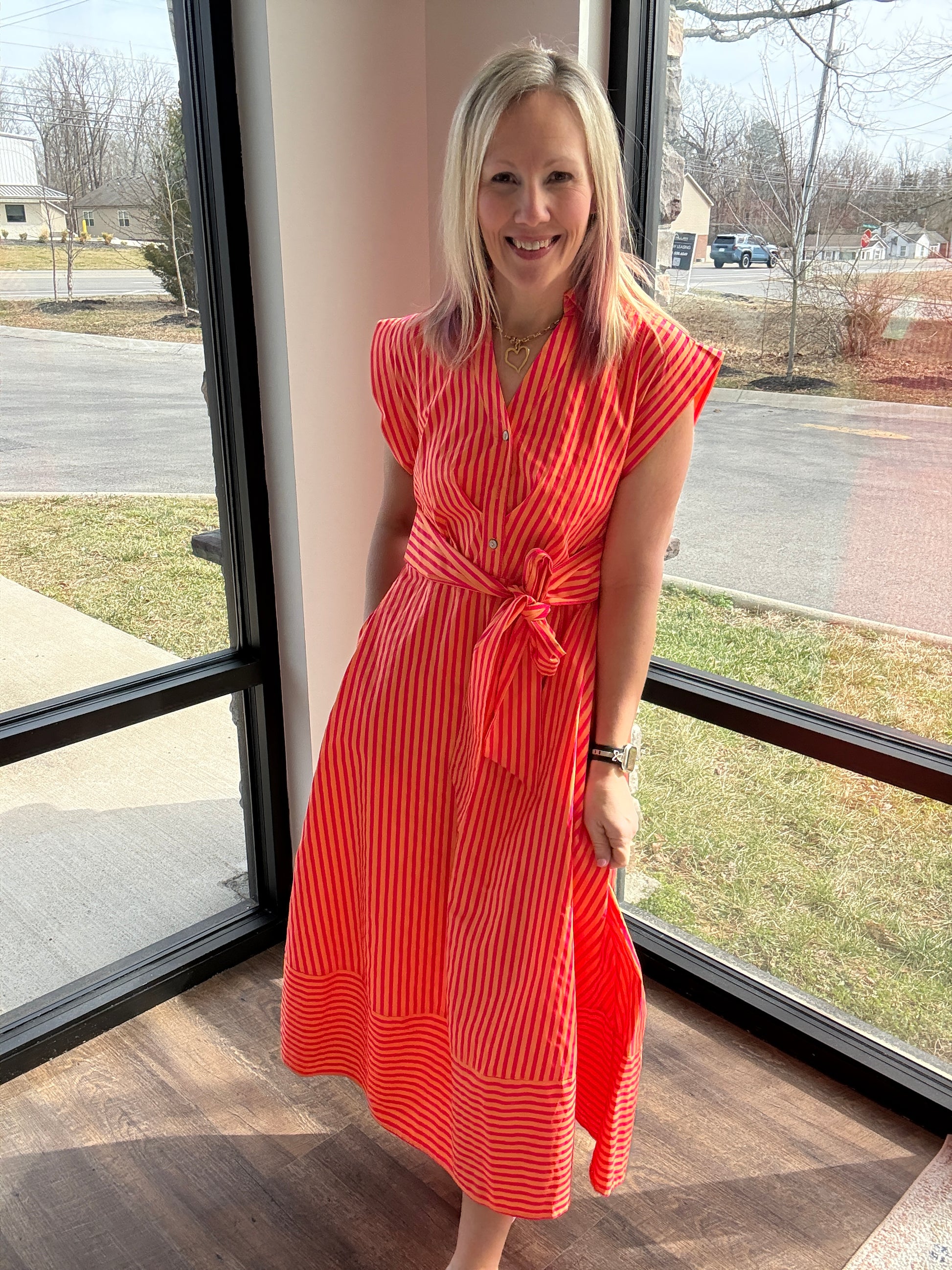 Say hello to your new spring go-to — the Fresh Lines Tie-Waist Maxi Dress. Designed with slimming vertical stripes and a flattering button-front silhouette, this dress was made to move with you from now through the warmer months.