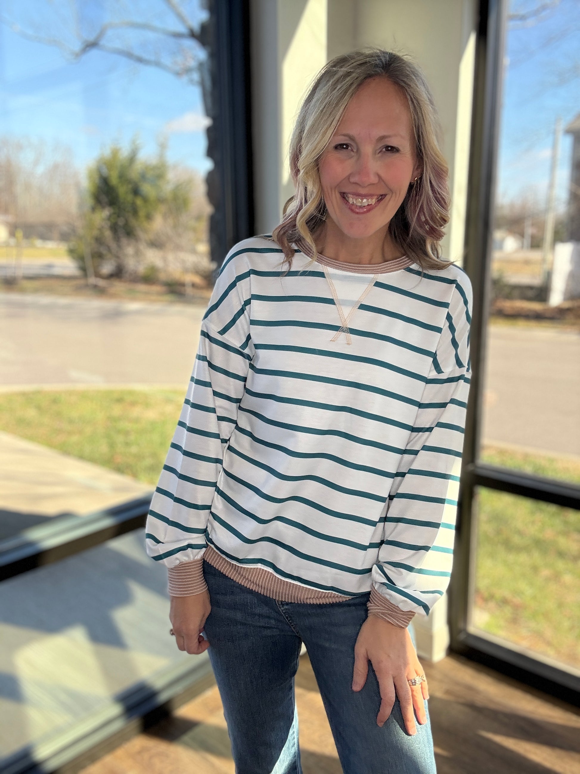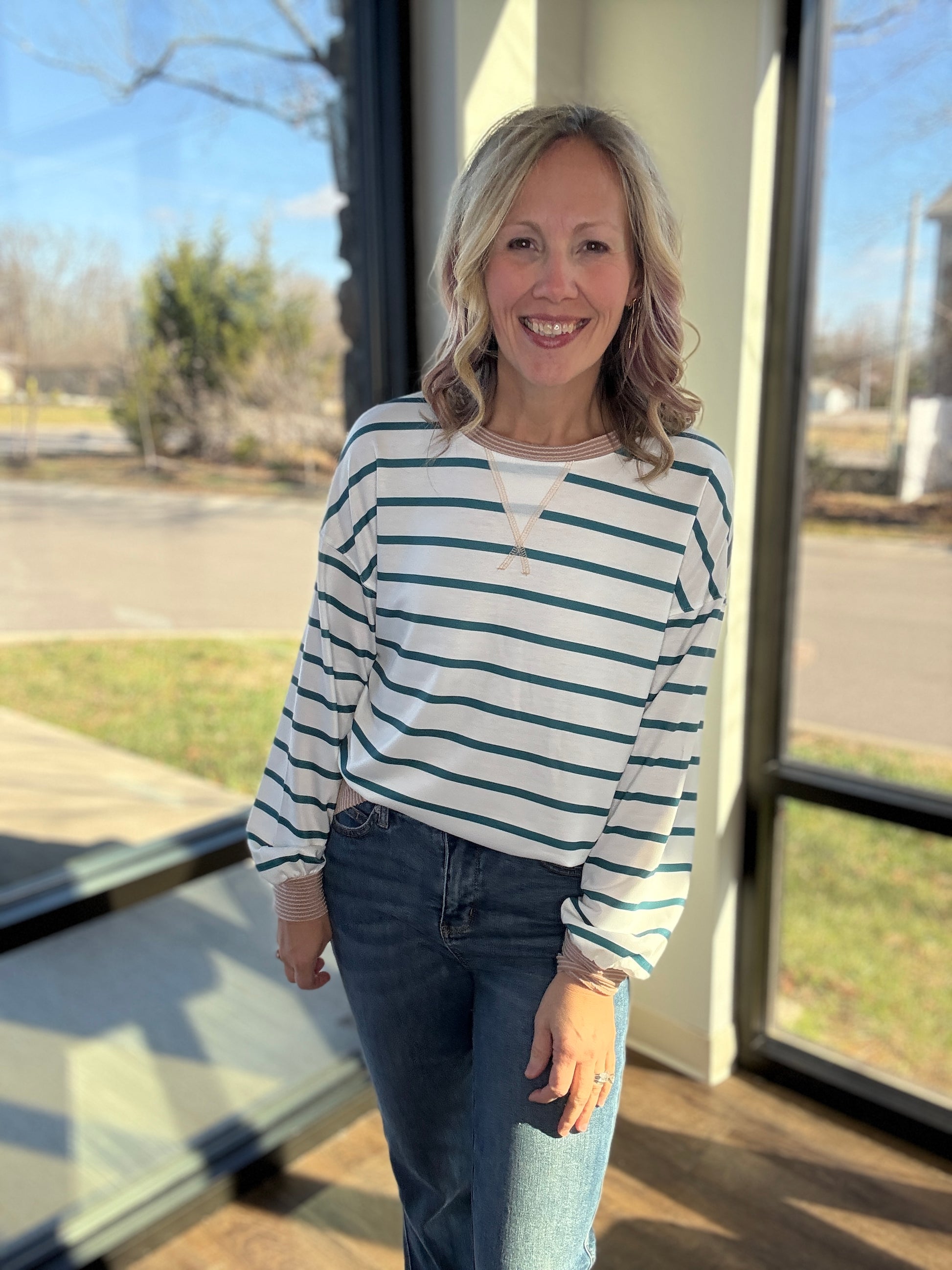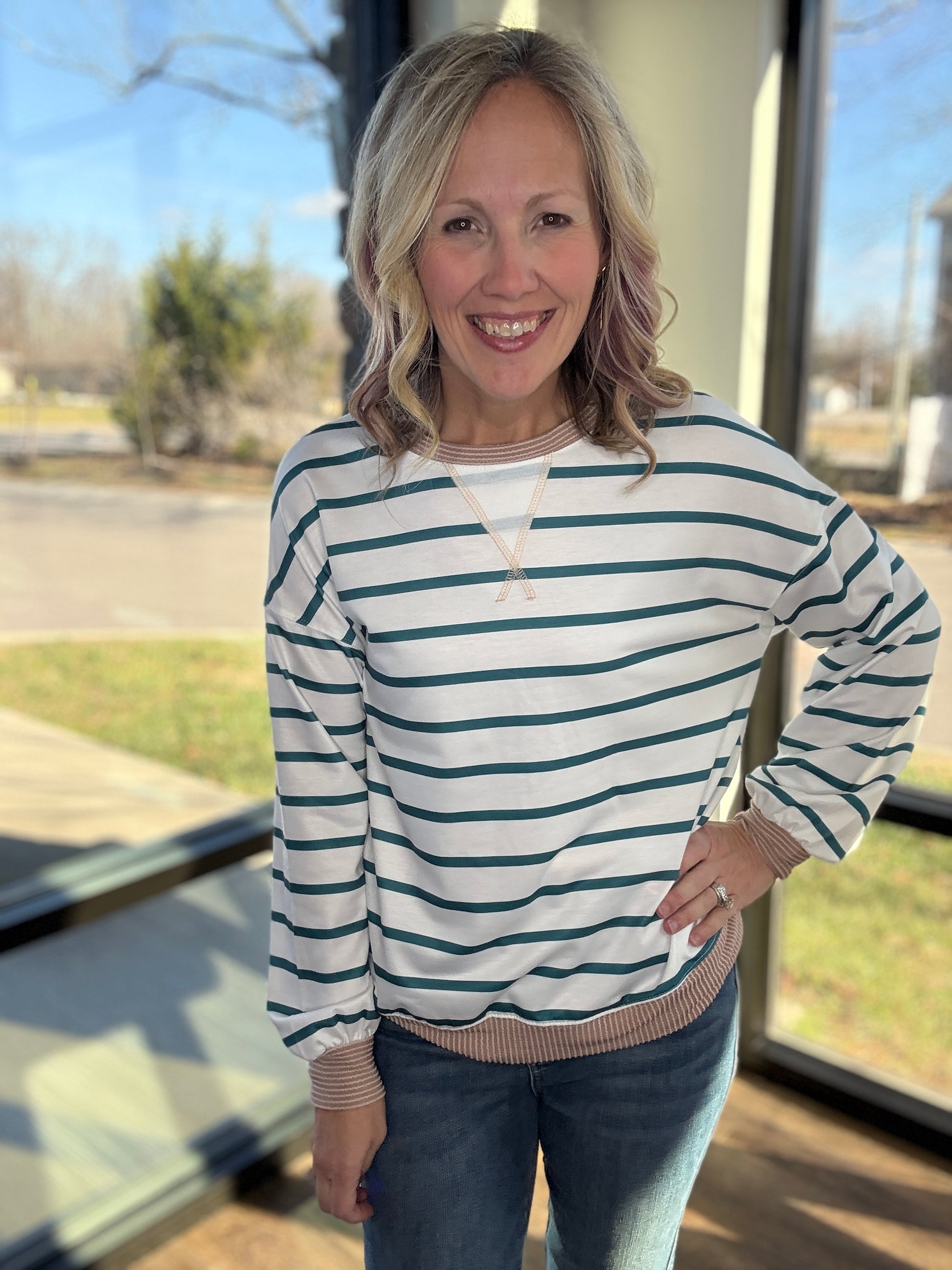 Meet the Fresh Start Stripe Long Sleeve Top—your new everyday essential with a pop of color. This green striped beauty features contrast ribbed cuffing at the waist, neckline, and wrists, giving it that extra boutique detail you love.