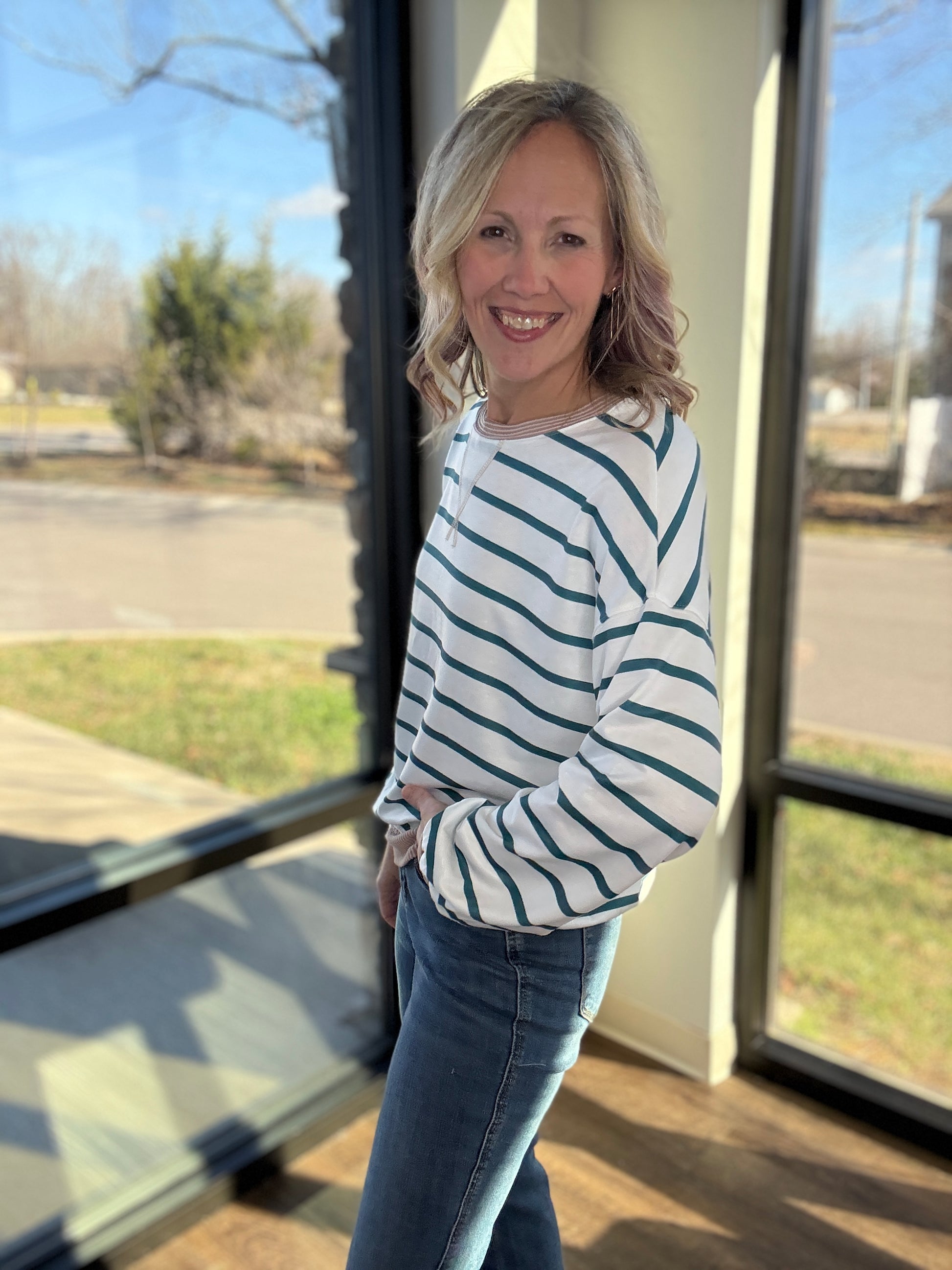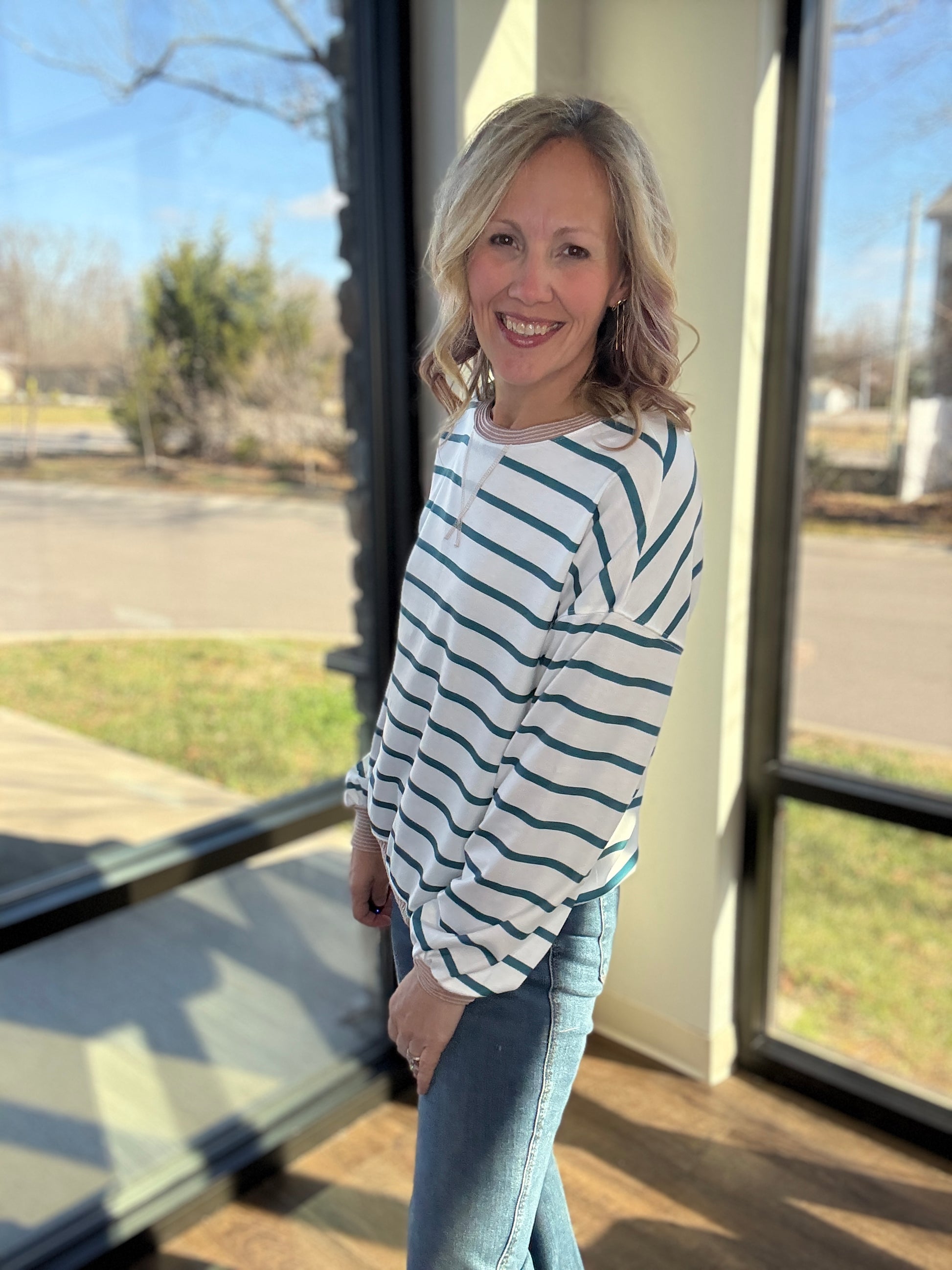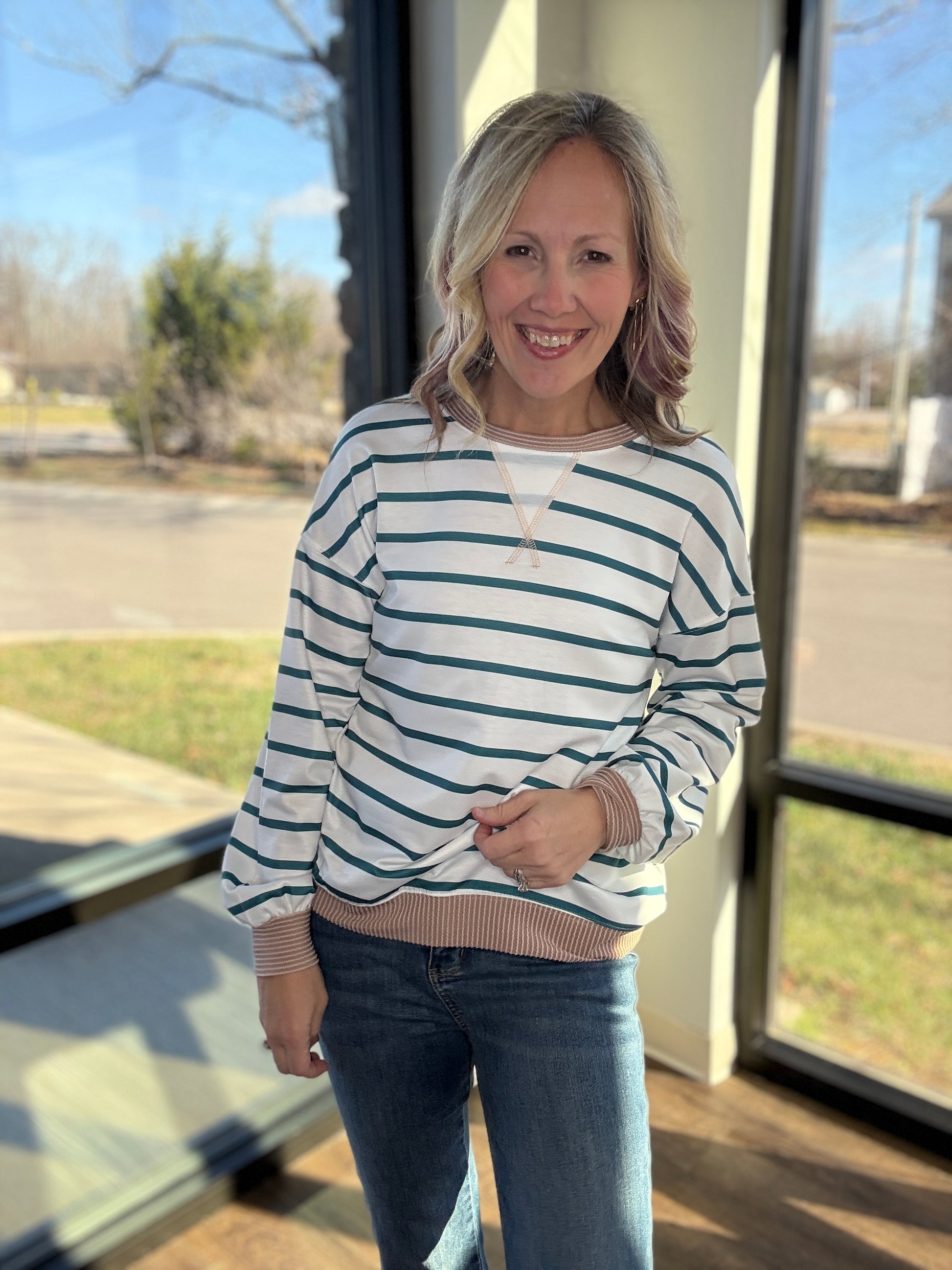 Meet the Fresh Start Stripe Long Sleeve Top—your new everyday essential with a pop of color. This green striped beauty features contrast ribbed cuffing at the waist, neckline, and wrists, giving it that extra boutique detail you love.