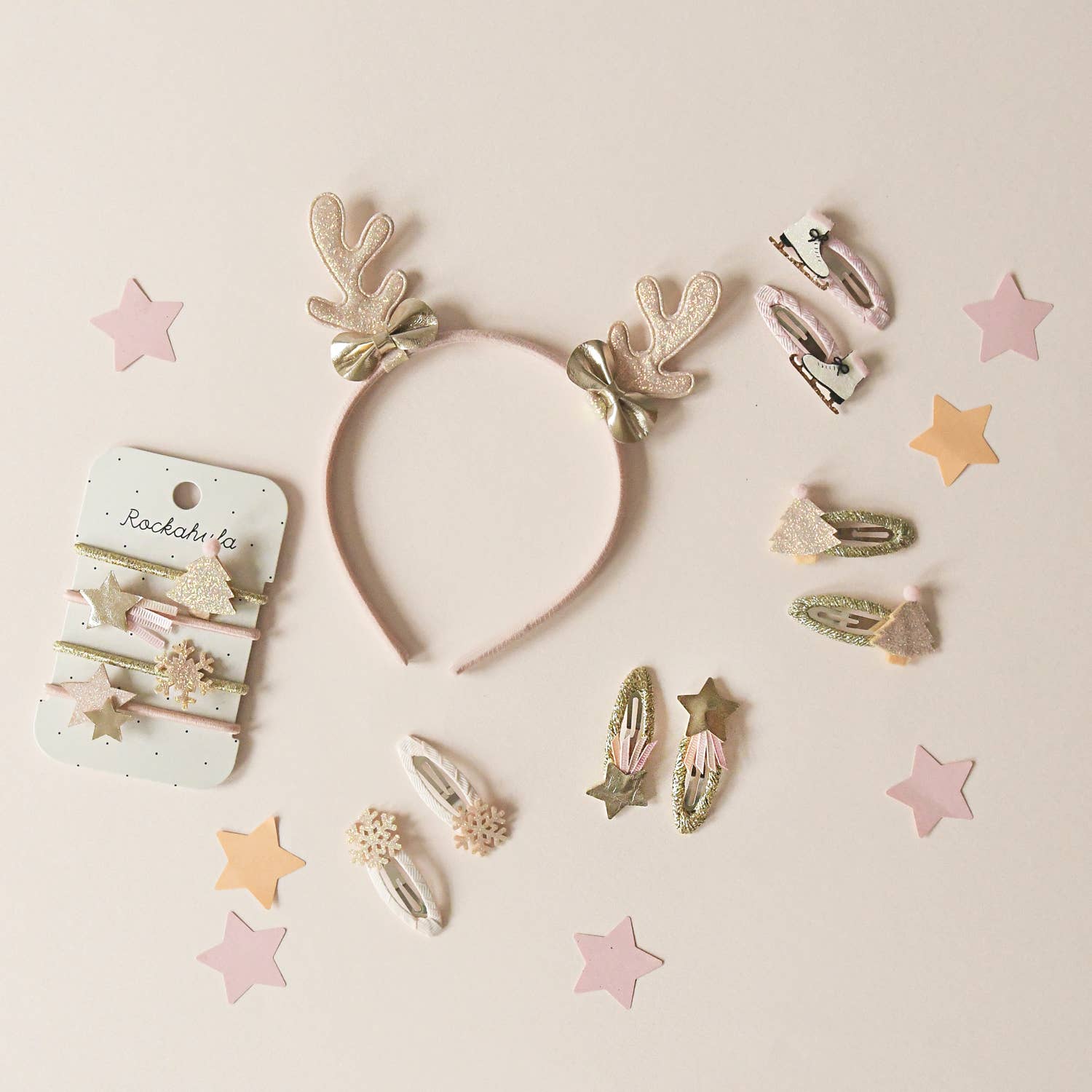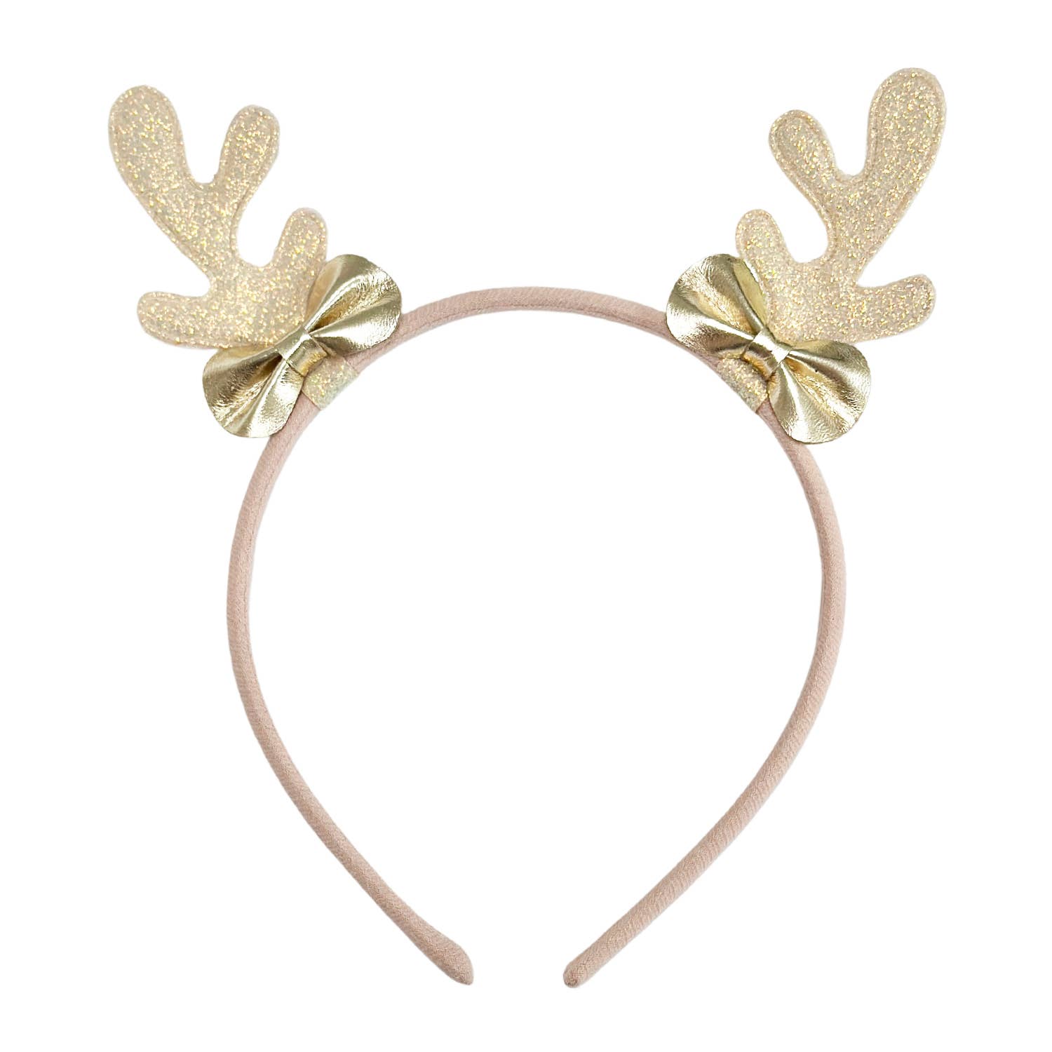The prettiest reindeer ears to add a little festive fun to your Christmas! These pastel pink glitter reindeer ears are adorned with gold PU bows on each side. They are set securely onto a blush pink fabric-covered band, which is designed to provide a comfortable fit for little heads.
