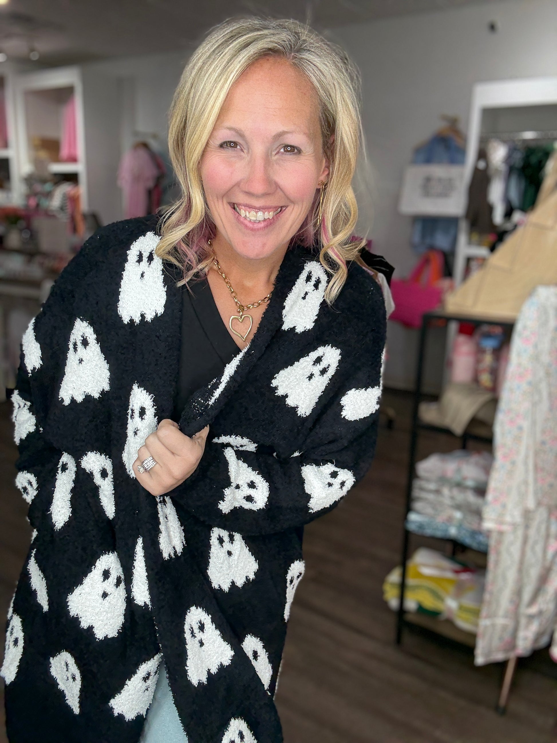 Trust us when we say you NEED this cardigan! Our Cloud Cardigans are so comfy, cozy and oh so soft! Similar to Barefoot Dreams Fabric (but softer). Trendy and REVERSIBLE ghost pattern with hidden side pockets that can be turned inside out depending on which side you want to wear.