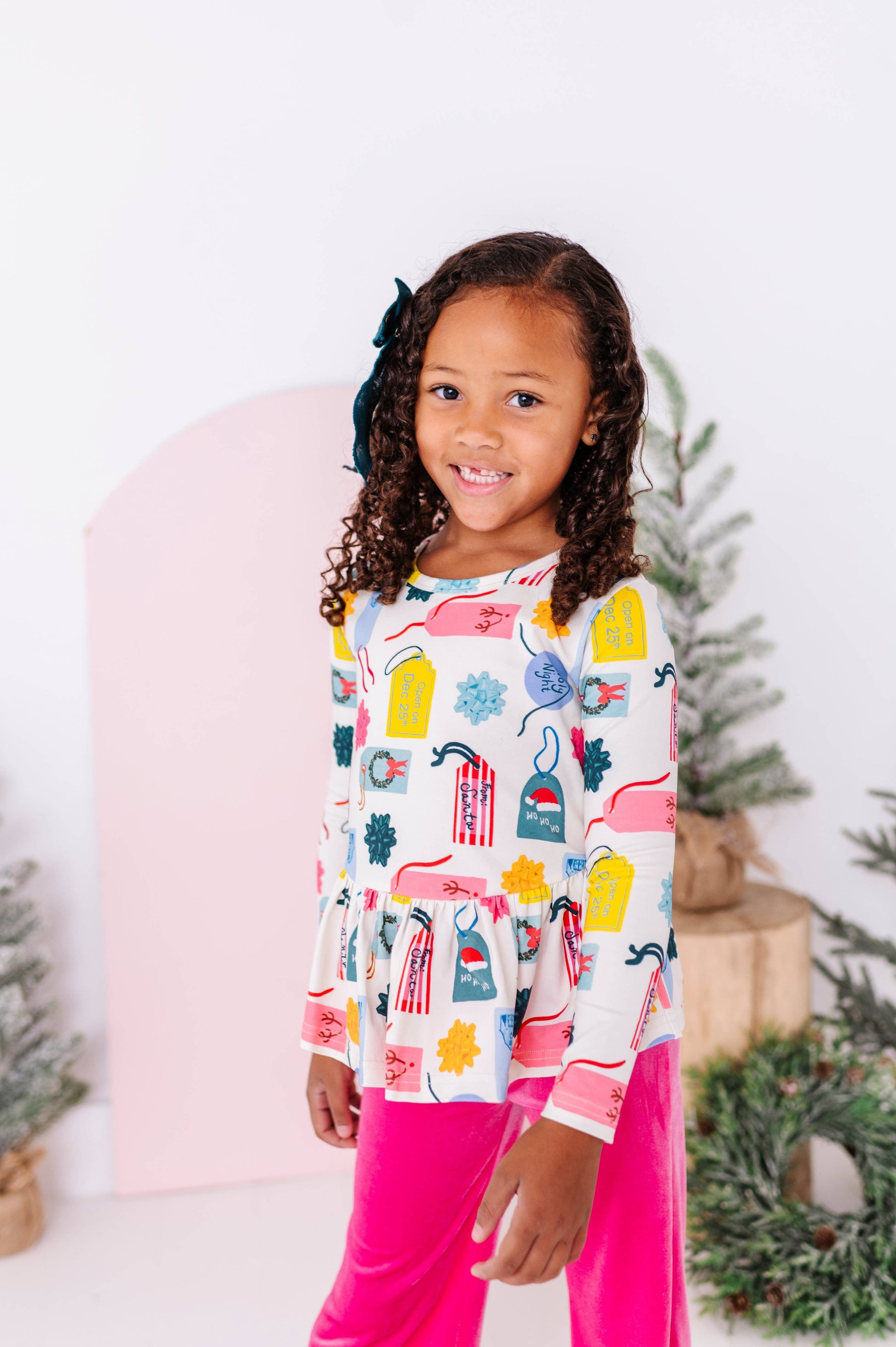 The Gift Wrapped Peplum Top is a festive favorite made for twirling, celebrating, and everyday holiday fun. Covered in the cutest holiday tag print, this top features a soft fabric and a peplum hem that adds just the right amount of flounce. Comfortable enough for school and playful enough for photos, it pairs easily with leggings, denim, or skirts.
