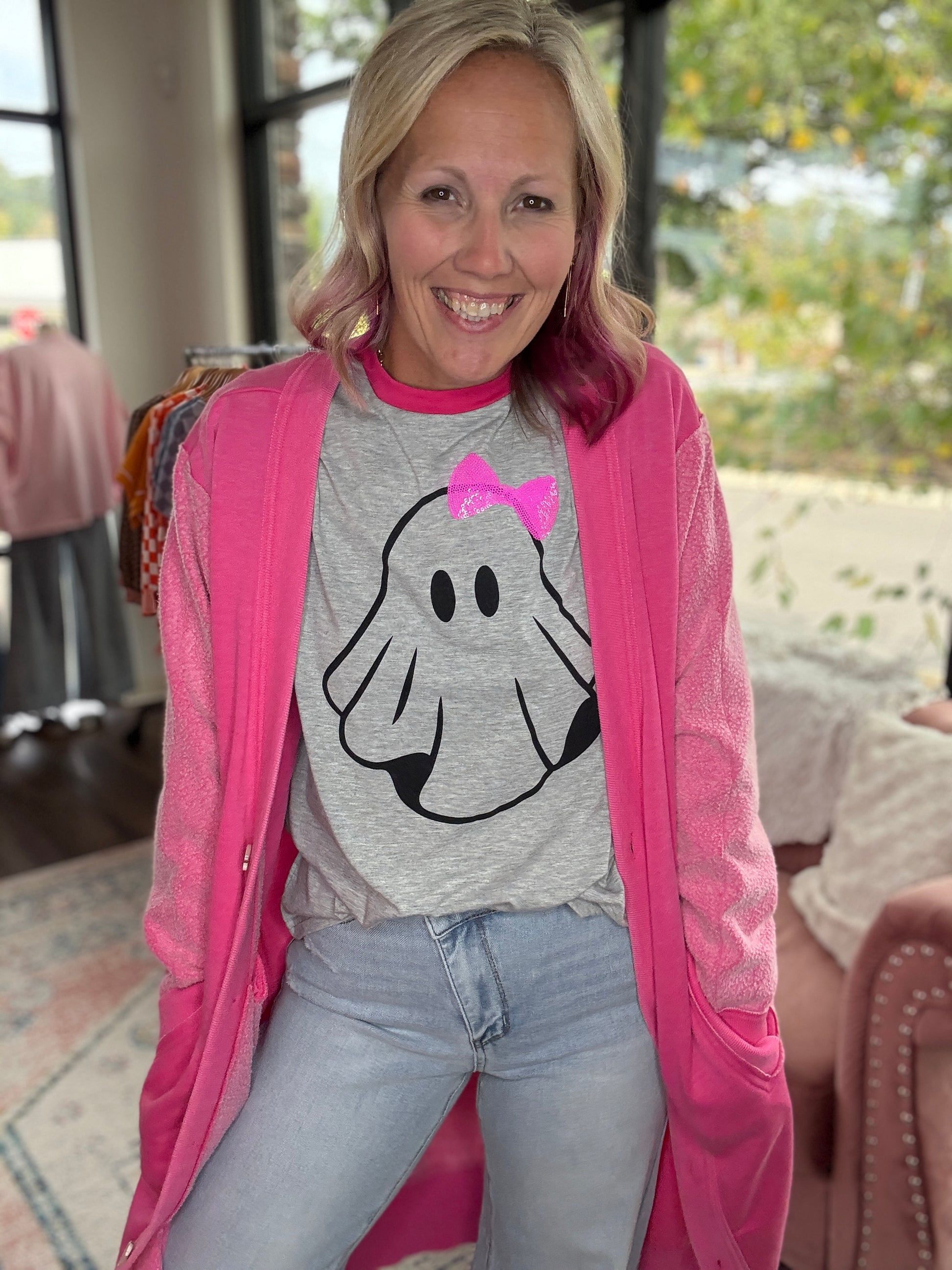 Introducing Gigi the Ghost Tee - featuring the iconic Jess Lea "Gigi The Ghost" design in a printed design with a playful sequin bow. Made with soft t-shirt material for ultimate comfort and style. Boo-tifully unique! Fabric: 60% Polyester, 35% Rayon, 5% Spandex