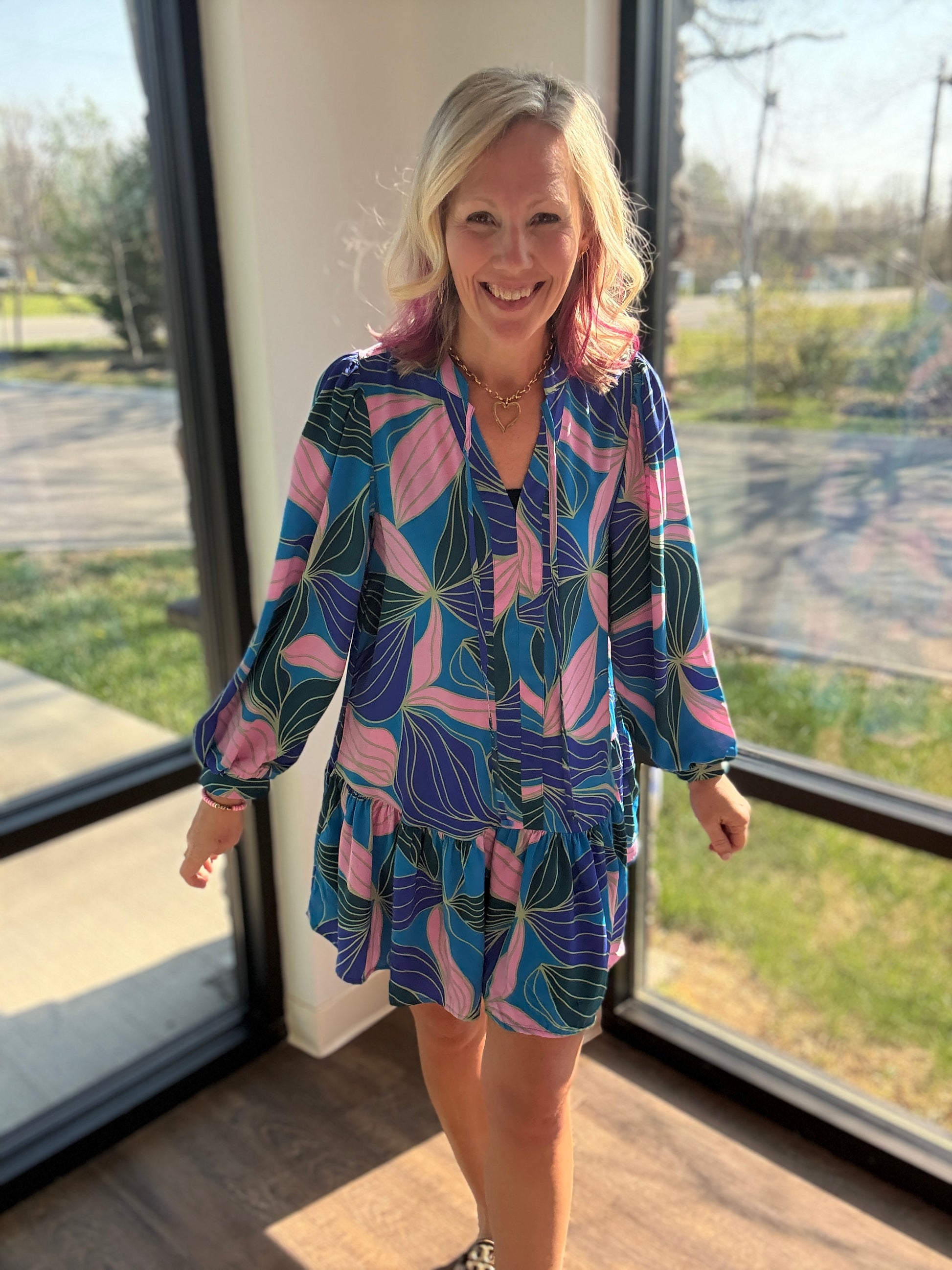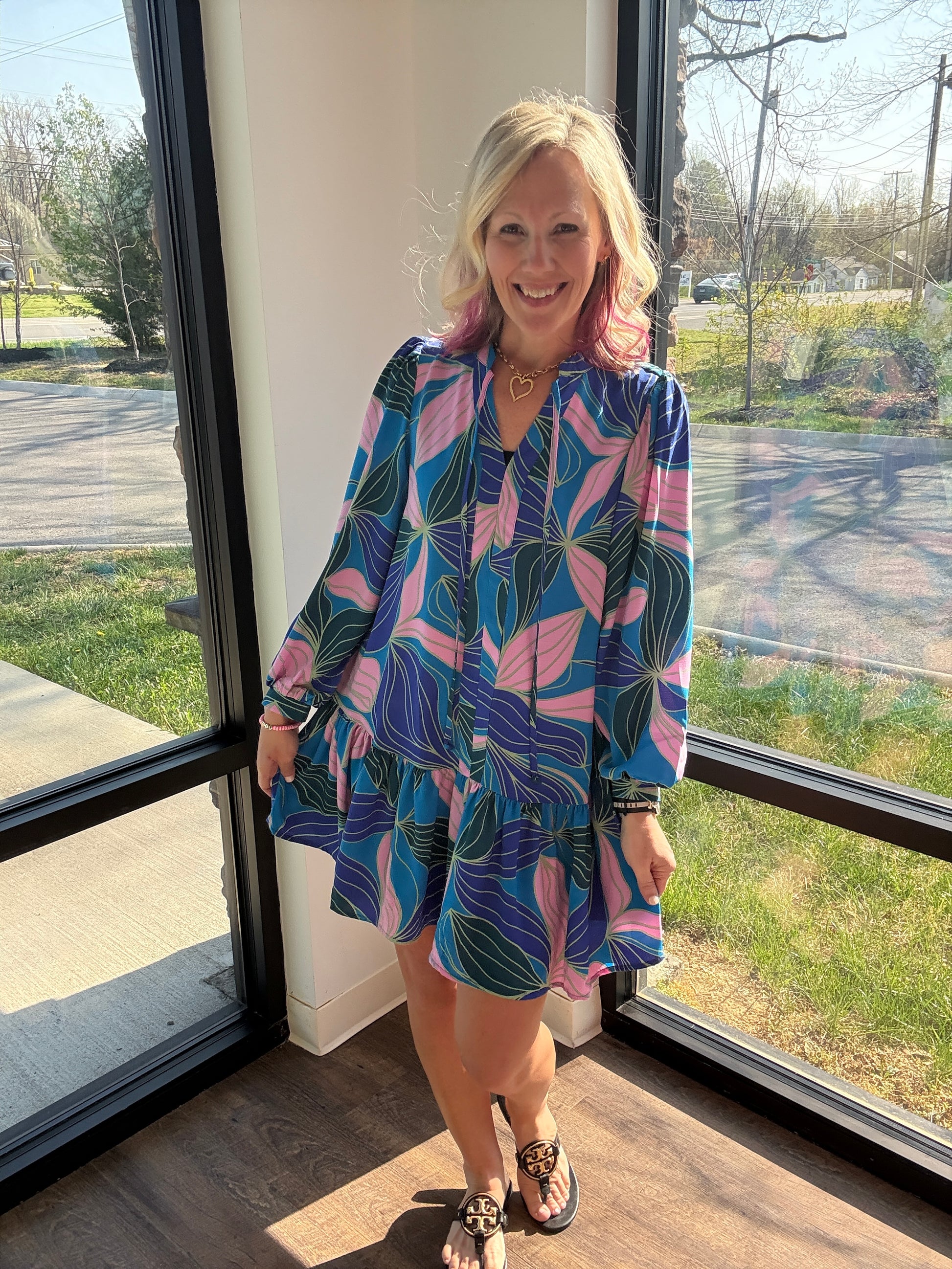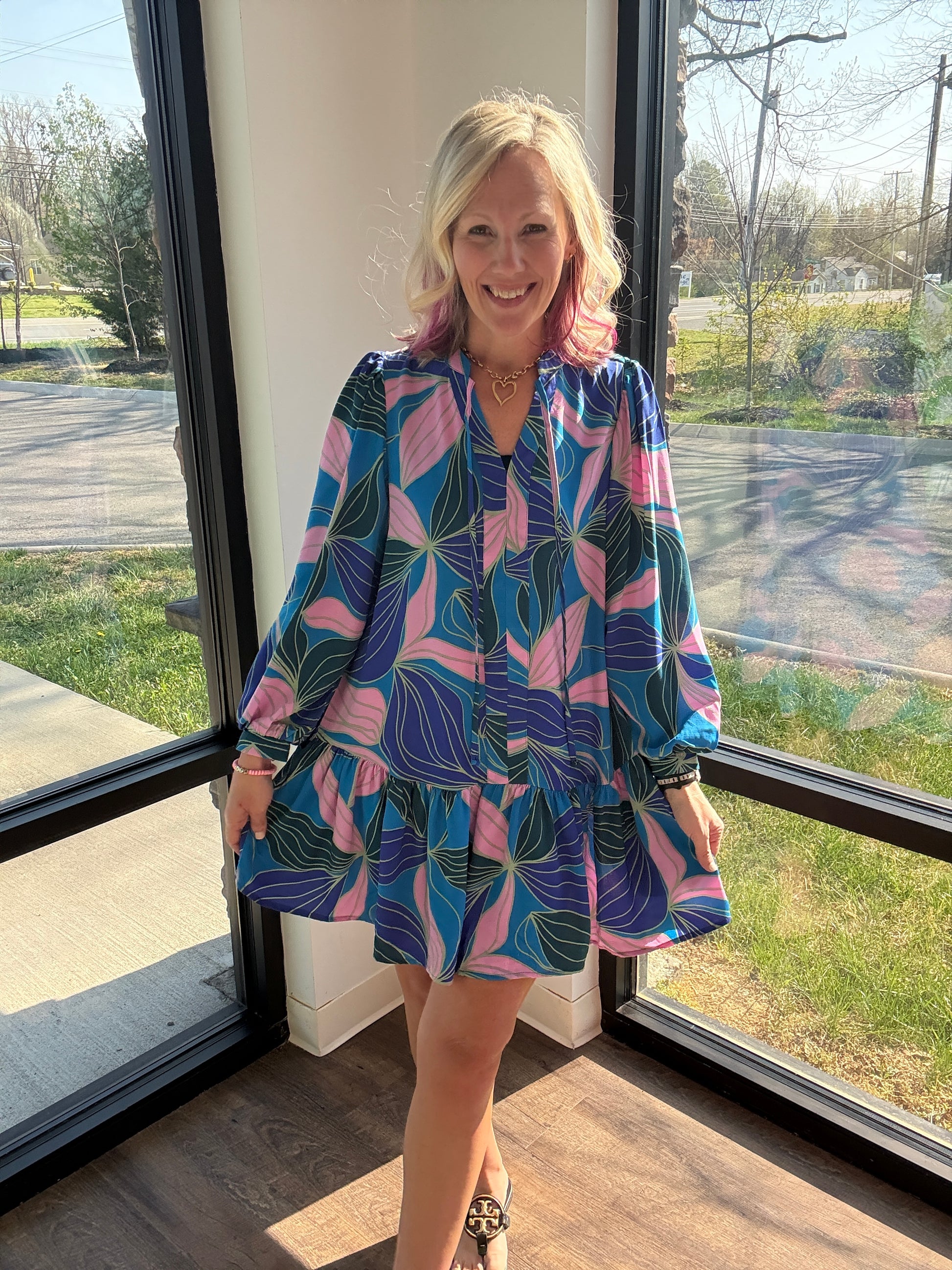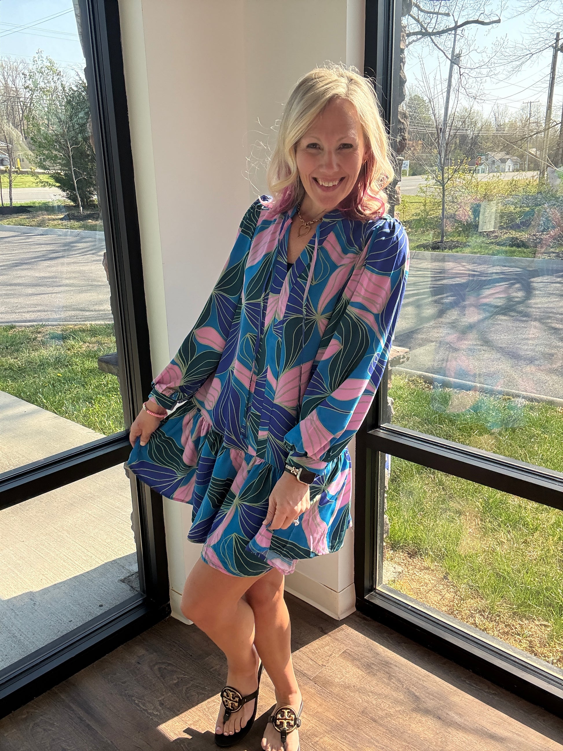 The soft V-neckline with a tie collar adds a delicate, flattering touch, while the long sleeves keep it polished without sacrificing comfort. Lightweight and airy, this dress feels cool and easy to wear, making it perfect for everything from casual days to dressed-up moments.